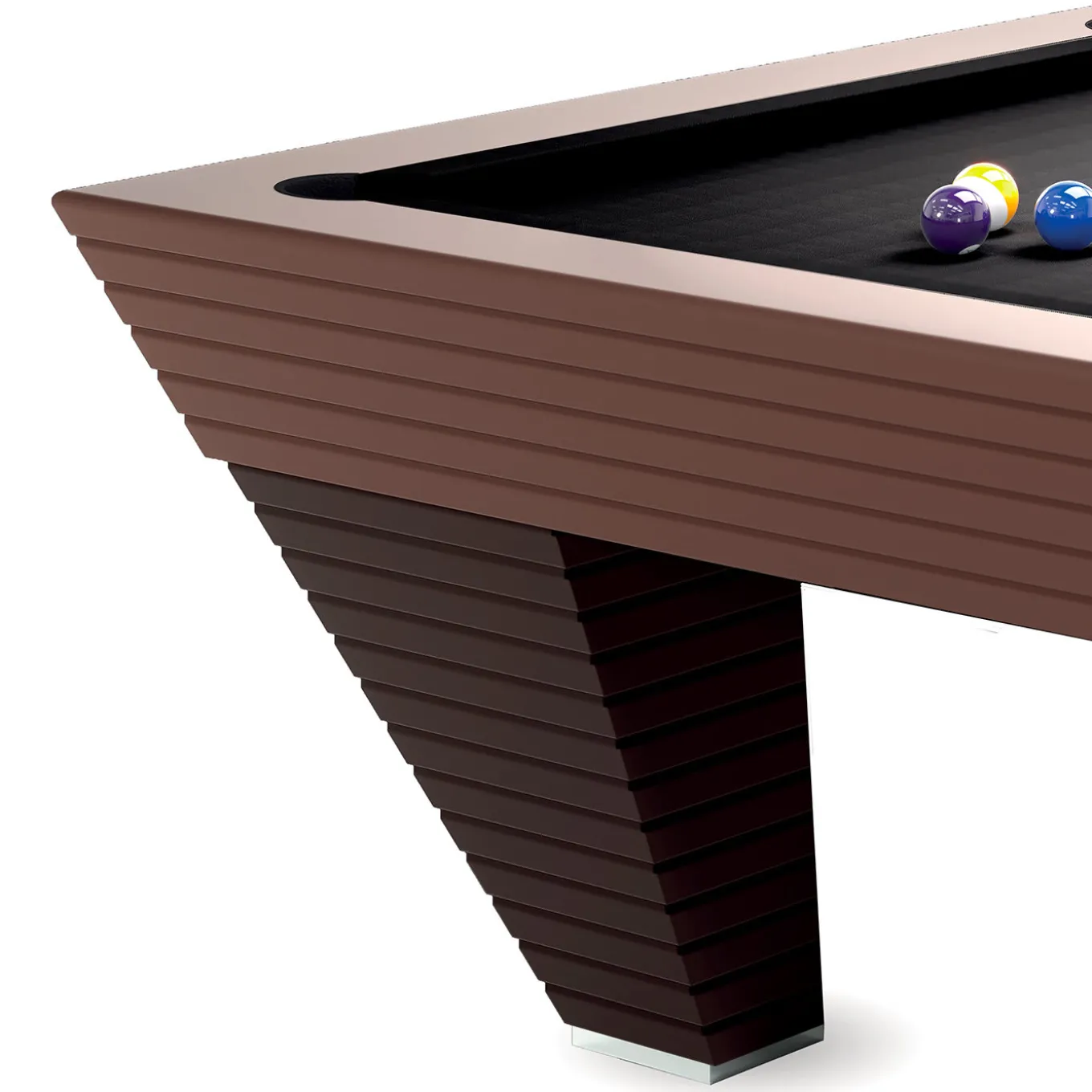 TheNewDe pool table is characterized by its geometric appeal. Lacquered in two different shades of brown, the table base has a finish that is soft to the touch.The nine-foot pool table’s playing surface is made out of a solid slab of slate and upholstered with black Simonis fabric. Wood edges are lacquered in soft touch Light Brown and legs in matt Dark Brown. Cues and balls are not included.
