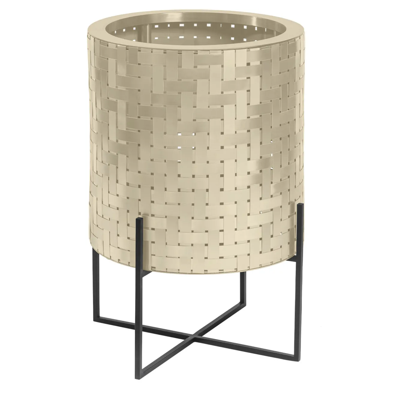 This elegant cachepot features an exterior in champagne gold-colored, hand-woven aluminum. Its inner steel structure makes it perfect for holding a wide array of plants. It sits atop a thin black iron base. The item’s total height is 61 cm, with the base measuring 20 cm high. Also available in a medium and large version.