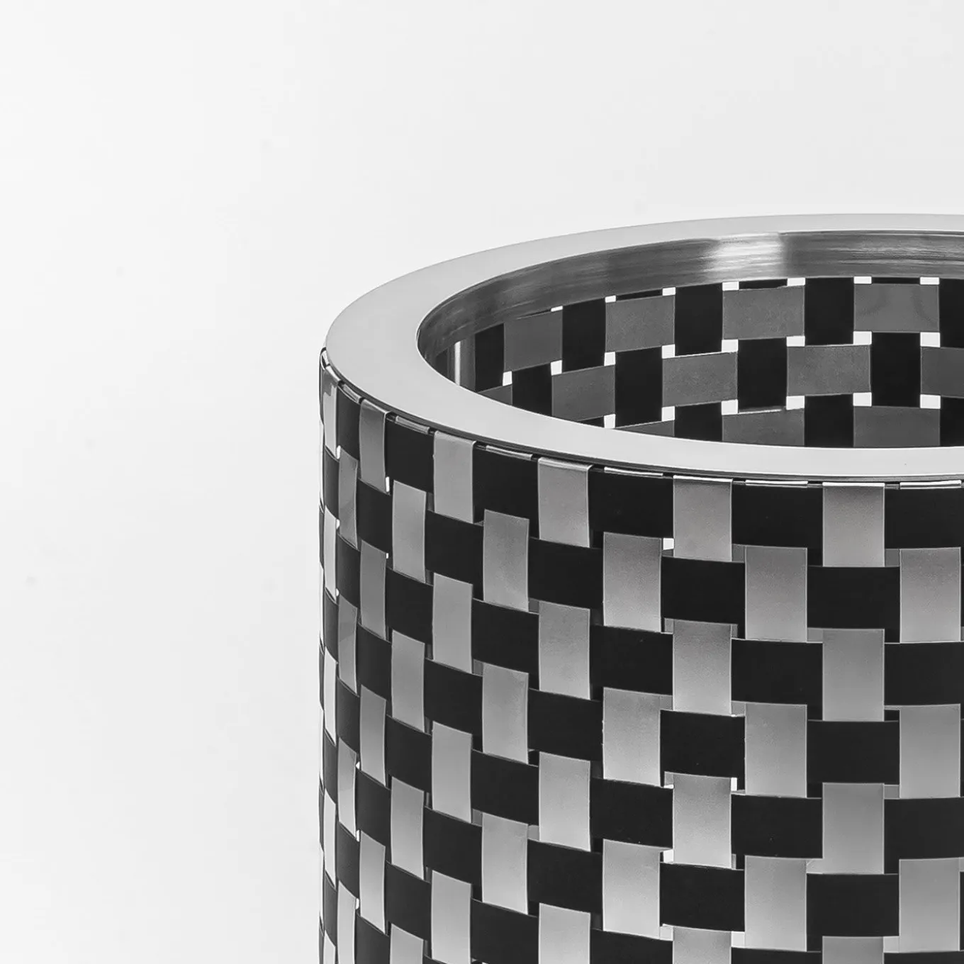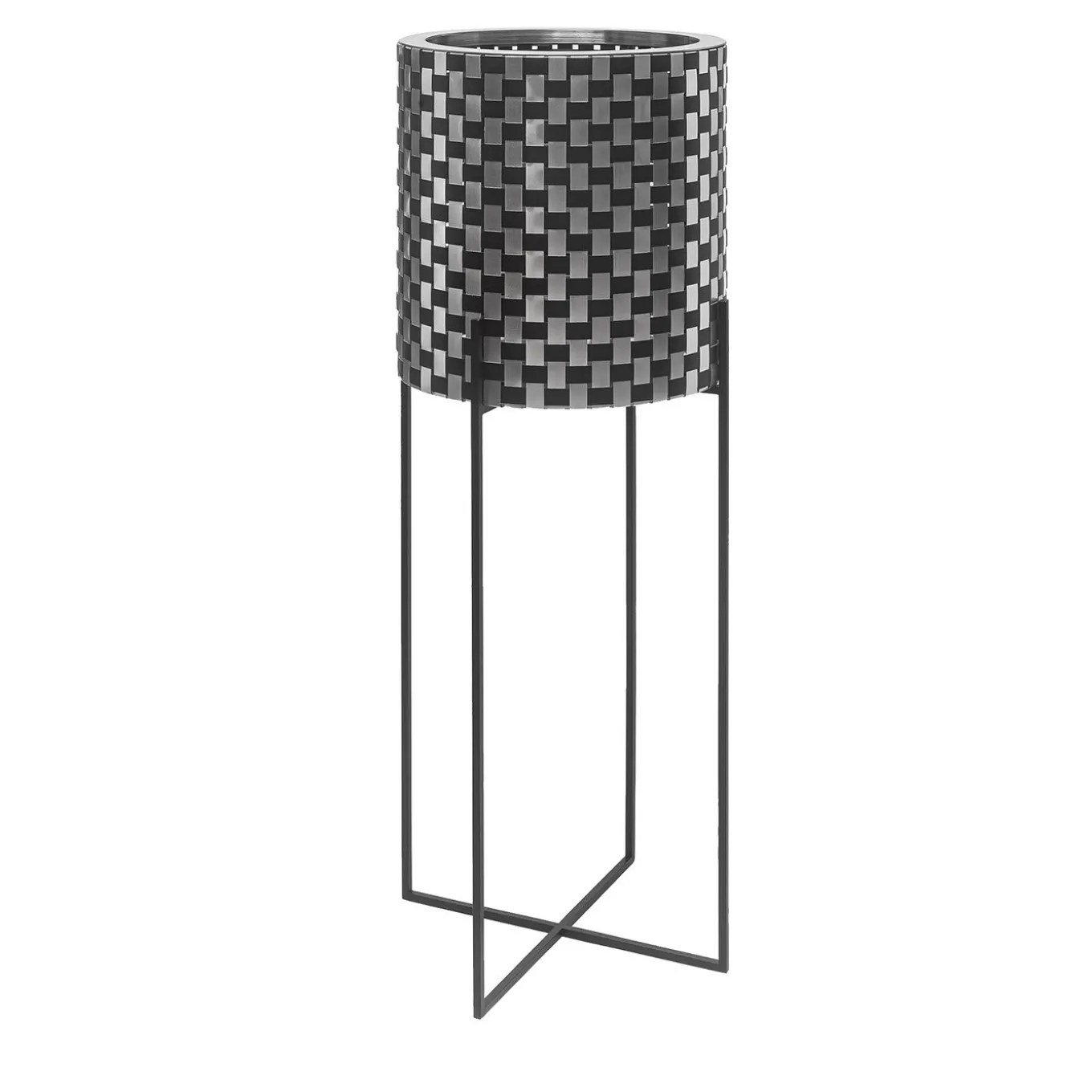 Inspired by Op Art of the 1960s, this exceptional steel plant holder (H 80cm) is characterized by an exclusive material made of interwoven black- and natural-finished aluminum sheets, created exclusively by Inthegardern Design Studio. Standing 70cm tall, it is anchored on a black-painted iron structure of interconnected cylindrical elements with an X-shaped base. It is available in three sizes, please ask the Concierge for details.