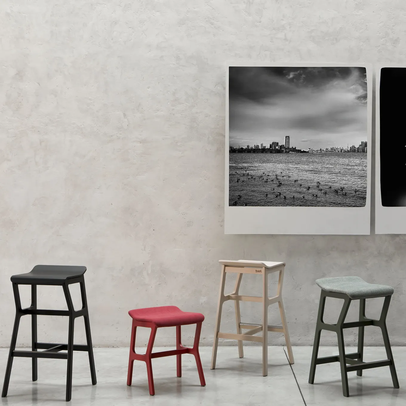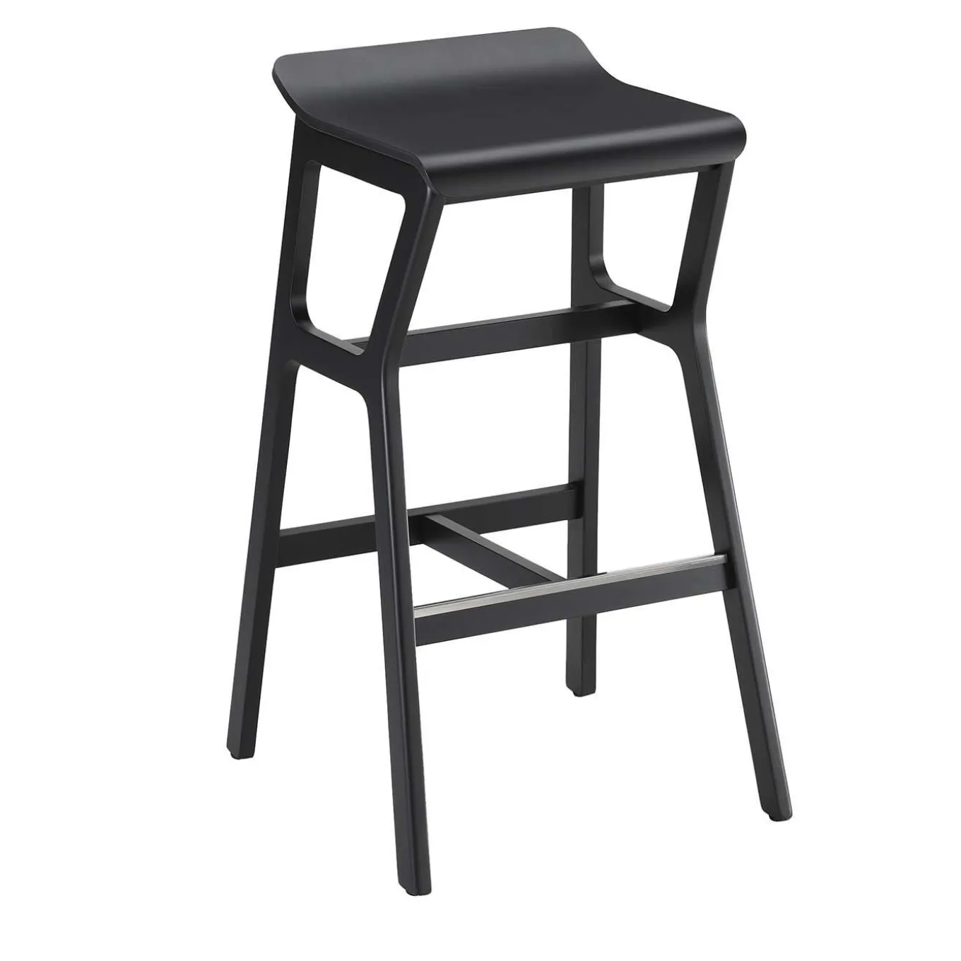 Available in three heights, the Nhino Stool boasts an architectural designis inspired by modernist style. The black finish enhances the graceful curves of the ergonomic seat raised on slanted legs, angled in the front, with H-shaped stretchers and high footrest for extra comfort. Handcrafted of beechwood, the collection also includes the version with upholstered seat in fabric or faux leather, and finished in bleached, painted in natural palette or lacquered in bright colors. Please contact the Concierge for more details.