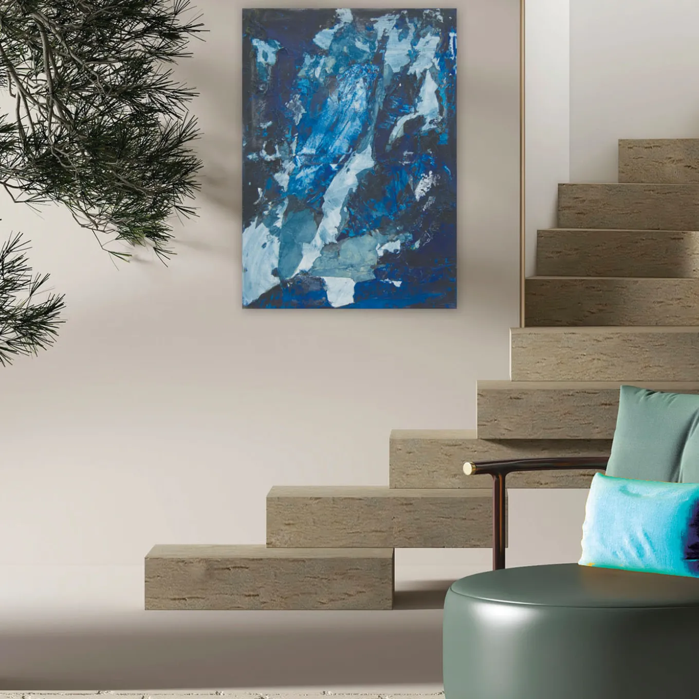 Shades of acrylic blue paint and black ink illuminated by dynamic light brushstrokes evoke the nocturnal atmospheres – with its subtle lights and weather variables – this painting evokes through its abstract traits. The layer of tissue paper covering the canvas welcomes the colors, consequently lightened for a poetic chromatic impact. The piece is delivered unframed and is supplied with an authenticity certificate.