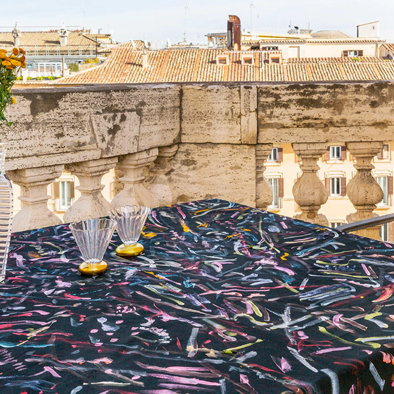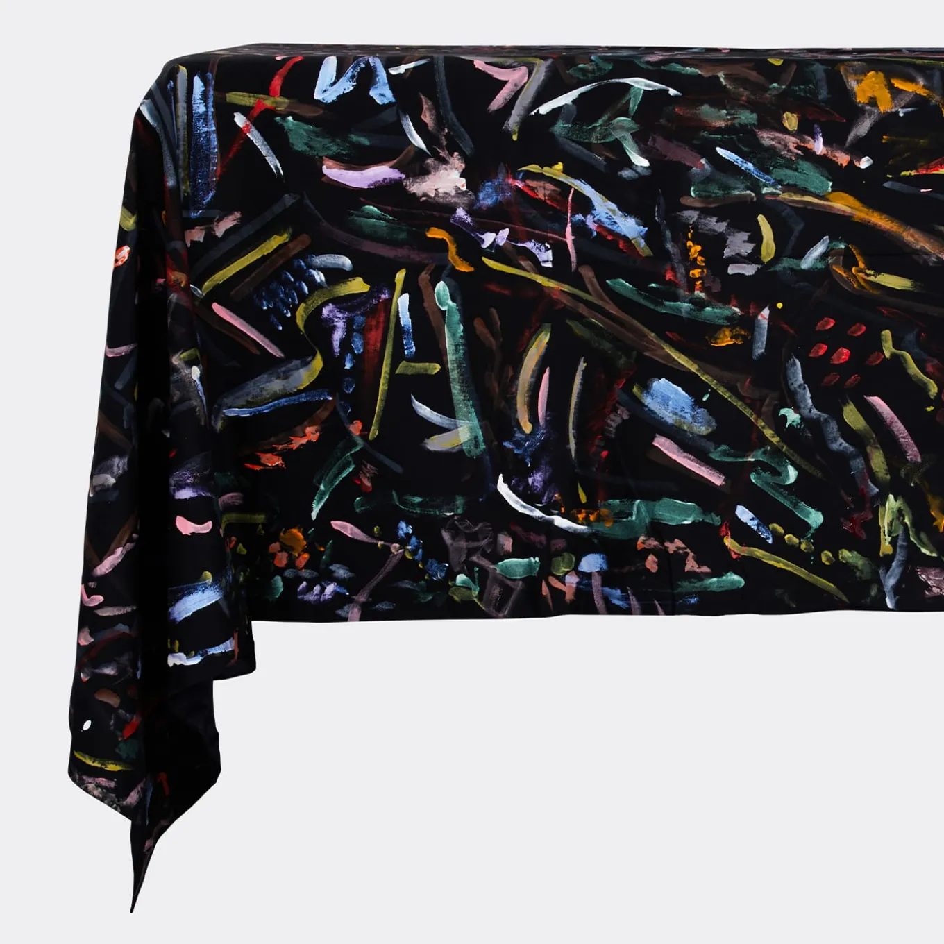Named after the Italian words for “Night Lights”, this stupendous tablecloth depicts an array of flashy, colorful segments on a black backdrop. Digitally printed from an acrylic painting on silk onto a practical polyester taffeta fabric, it will stunningly adorn any dining table of modern indoor and outdoor areas. Available also in size: 220×280. Please ask the concierge for details and prices.