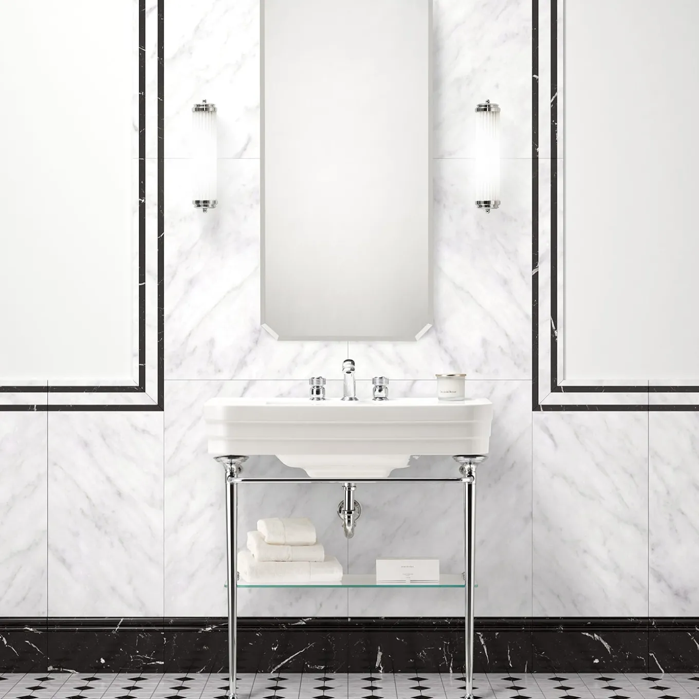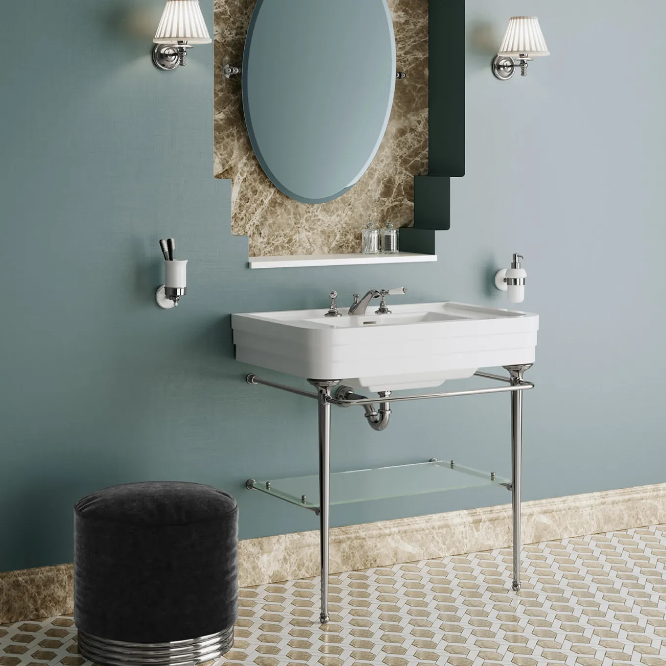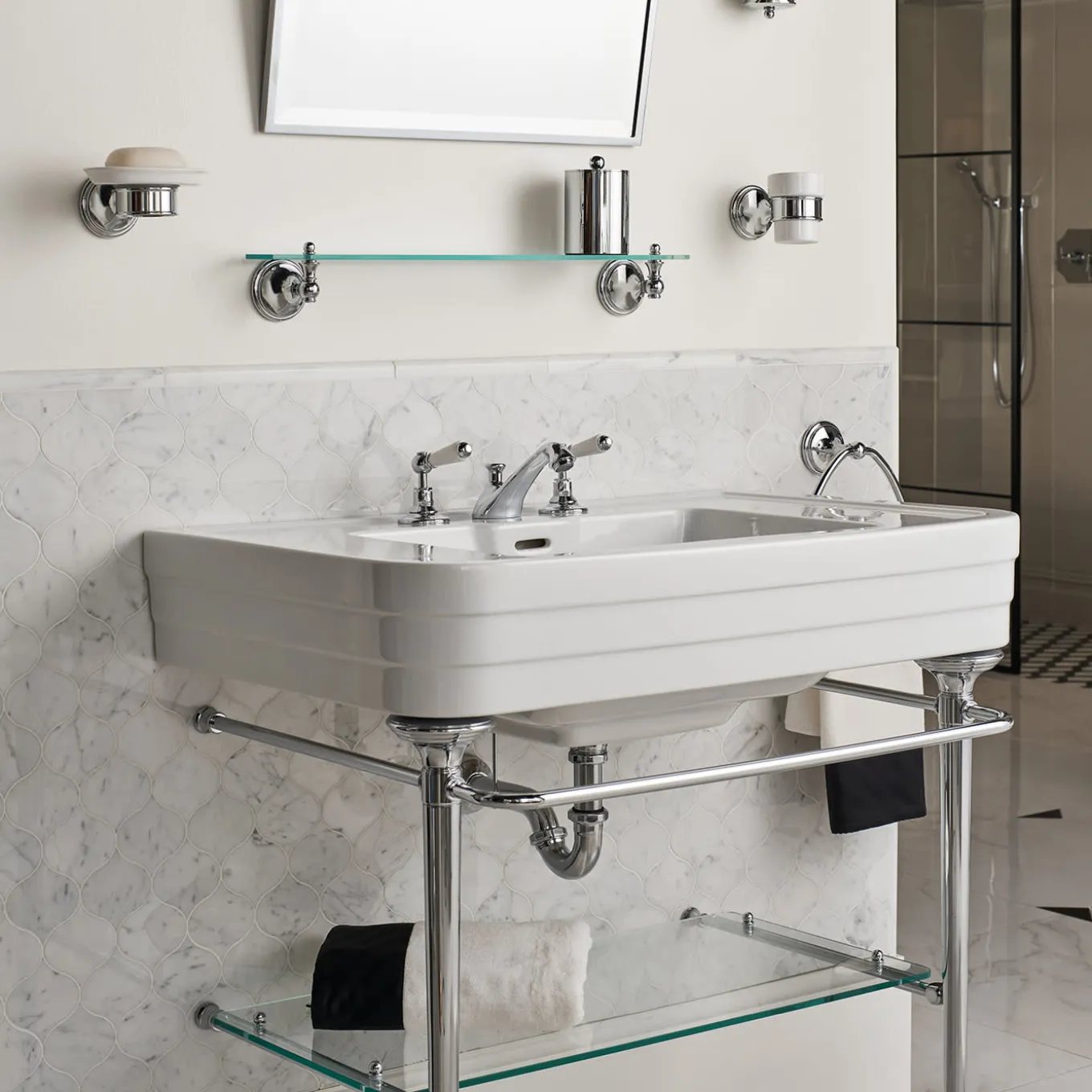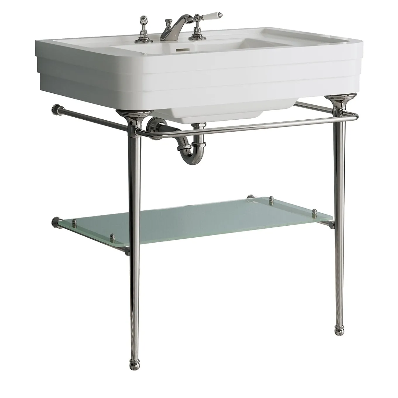 An elegant console that takes the essential beauty of Art Déco architecture and reinterprets this with a focus on the most exclusive comfort. The brass frame, in chrome finish, has a molded base sculpted into three sections that evoke the sculptural shape of the ceramic washbasin and includes three towel rails and a glass shelf. Faucets are not included.