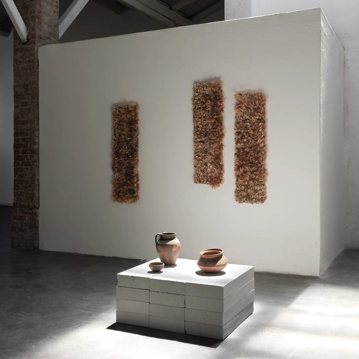 Embracing the rich, shifting tones of autumn, this striking three-piece tapestry captures the essence of the season. Its linear textile elements can be arranged in a regular rhythm or spaced apart to interact with the wall behind, allowing for endless composition possibilities. This dynamic design invites the collector to become part of the creative process, making each installation unique and deeply personal.