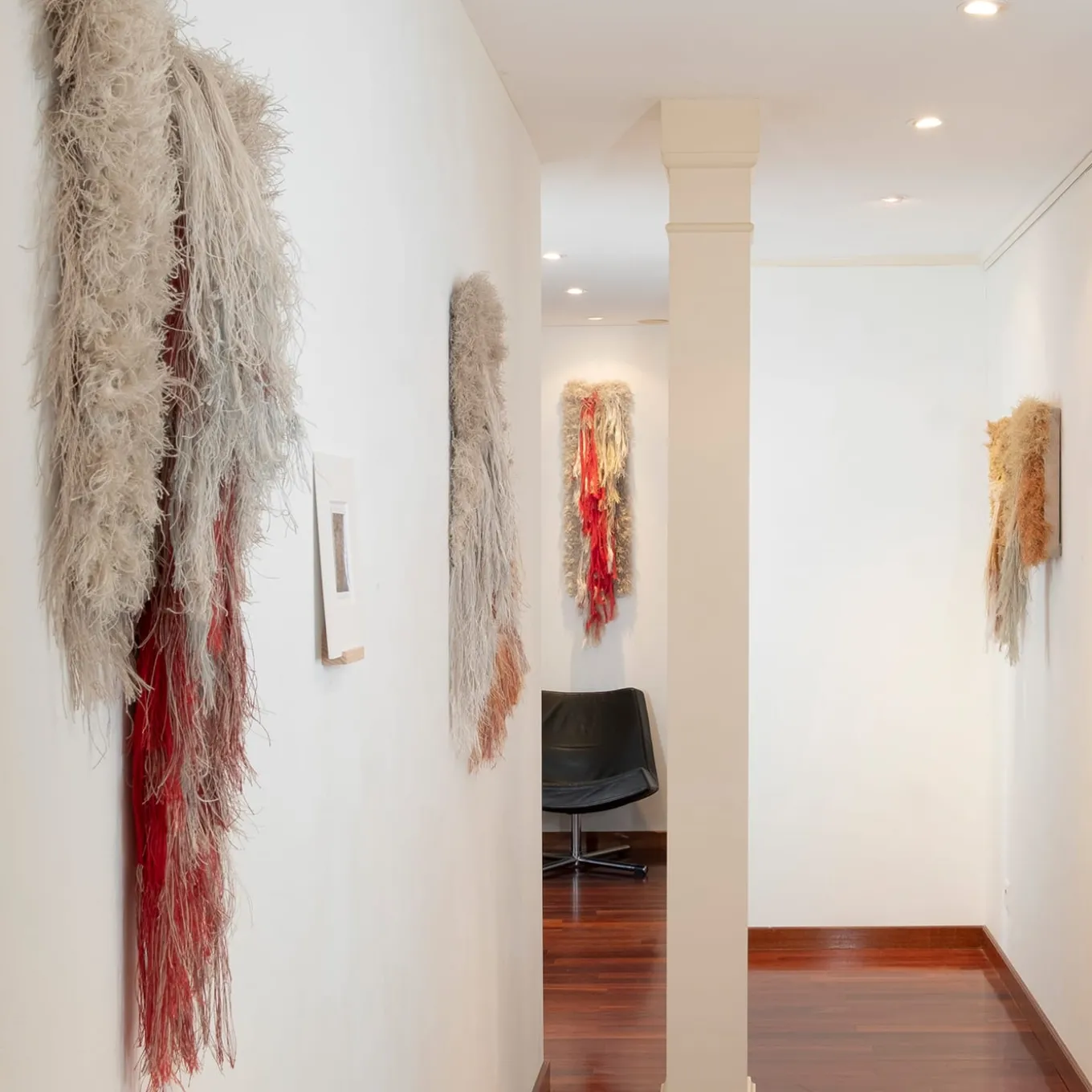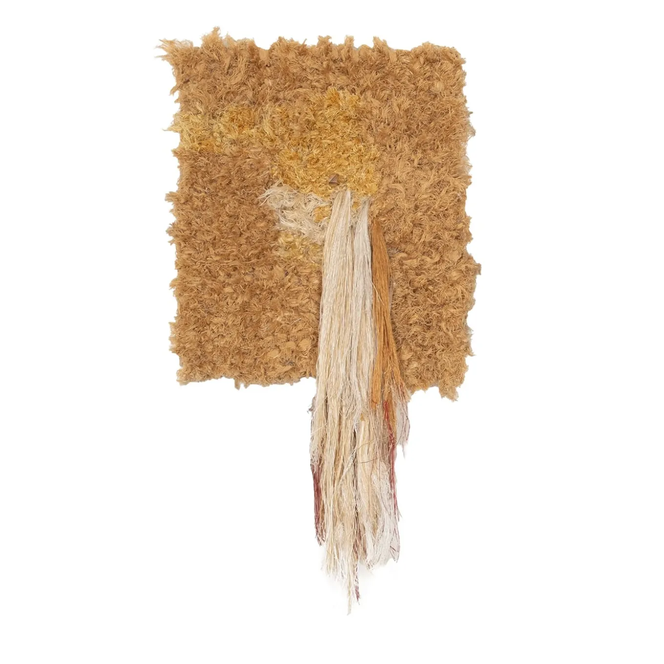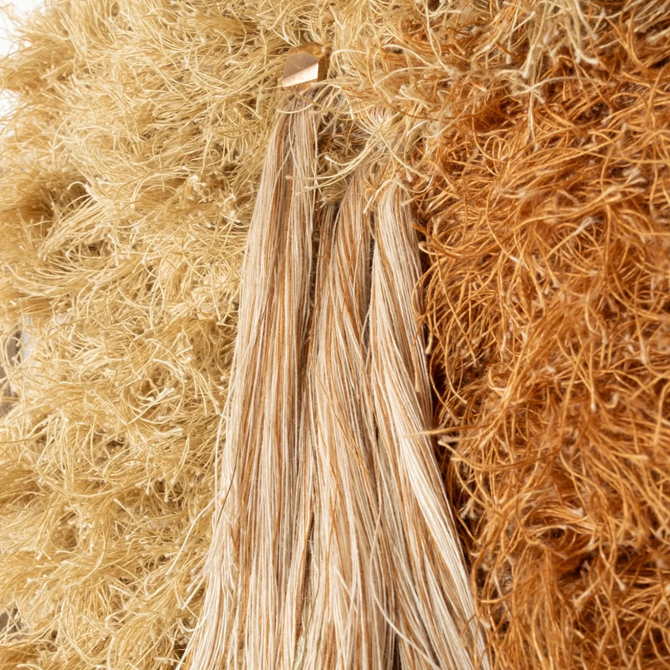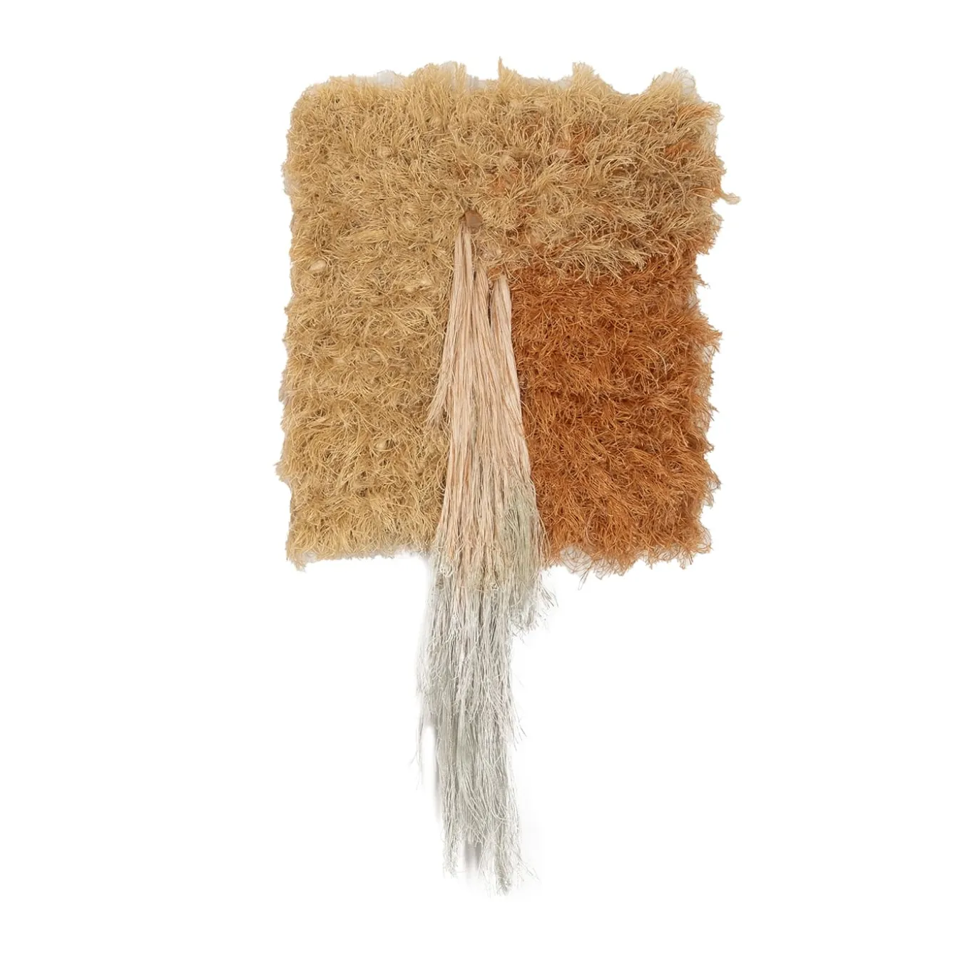 This diptych tapestry is a fiber art piece mounted on a wooden frame, distinguished by its textured fringes and two gleaming brass nails that add a distinctive character. Both the tapestry and the brass accents are meticulously handcrafted. Exhibited in Switzerland in 2024, the artwork delivers a striking visual presence on any wall. Dimensions of tapestry 1: 66x36x6 cm. Dimensions of tapestry 2: 70x36x6 cm.
