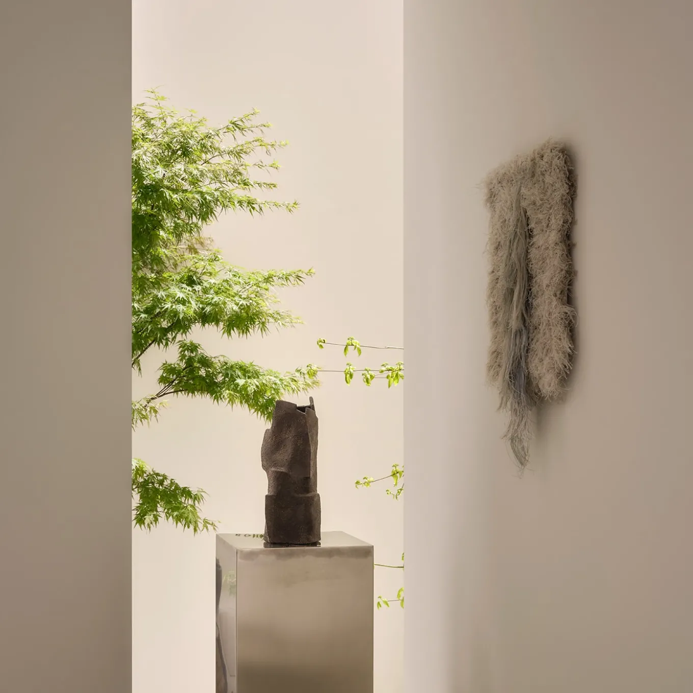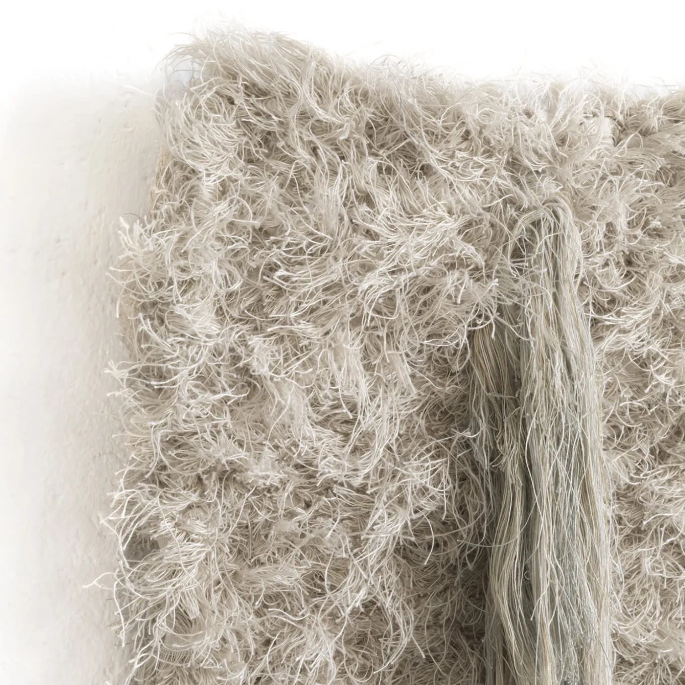 A celebration of soft neutral tones and refined craftsmanship, this elegant textile artwork features a striking central fringe. Created from selvages sourced from Italy’s premier textile industry, it seamlessly blends traditional techniques with contemporary design. Exhibited at the 2024 Salone del Mobile, this piece has also caught the attention of renowned design brands for photo shoots, showcasing its timeless versatility.