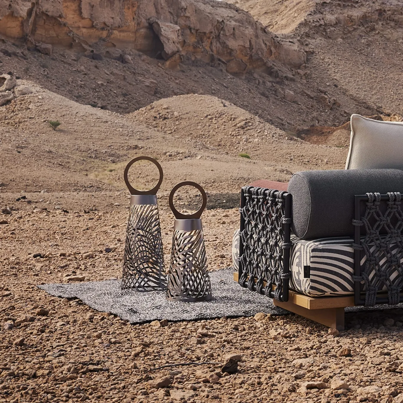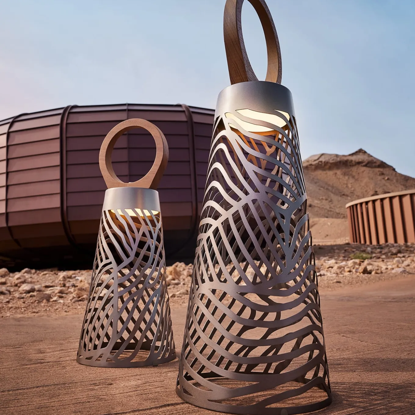 Noora, Arabic for “light”, is a portable outdoor lantern designed by Lorenza Bozzoli. Its conical lampshade, varnished for outdoor use, has a modern and elegant design. The iroko wood handle is water-resistant. Noora features a rainproof LED light, 30W power, 9900mAh lithium battery lasting six hours. The LED can be easily inserted and removed from the lantern thanks to a magnetic mounting system. It’s rechargeable via a supplied USB cable and controllable with a remote.