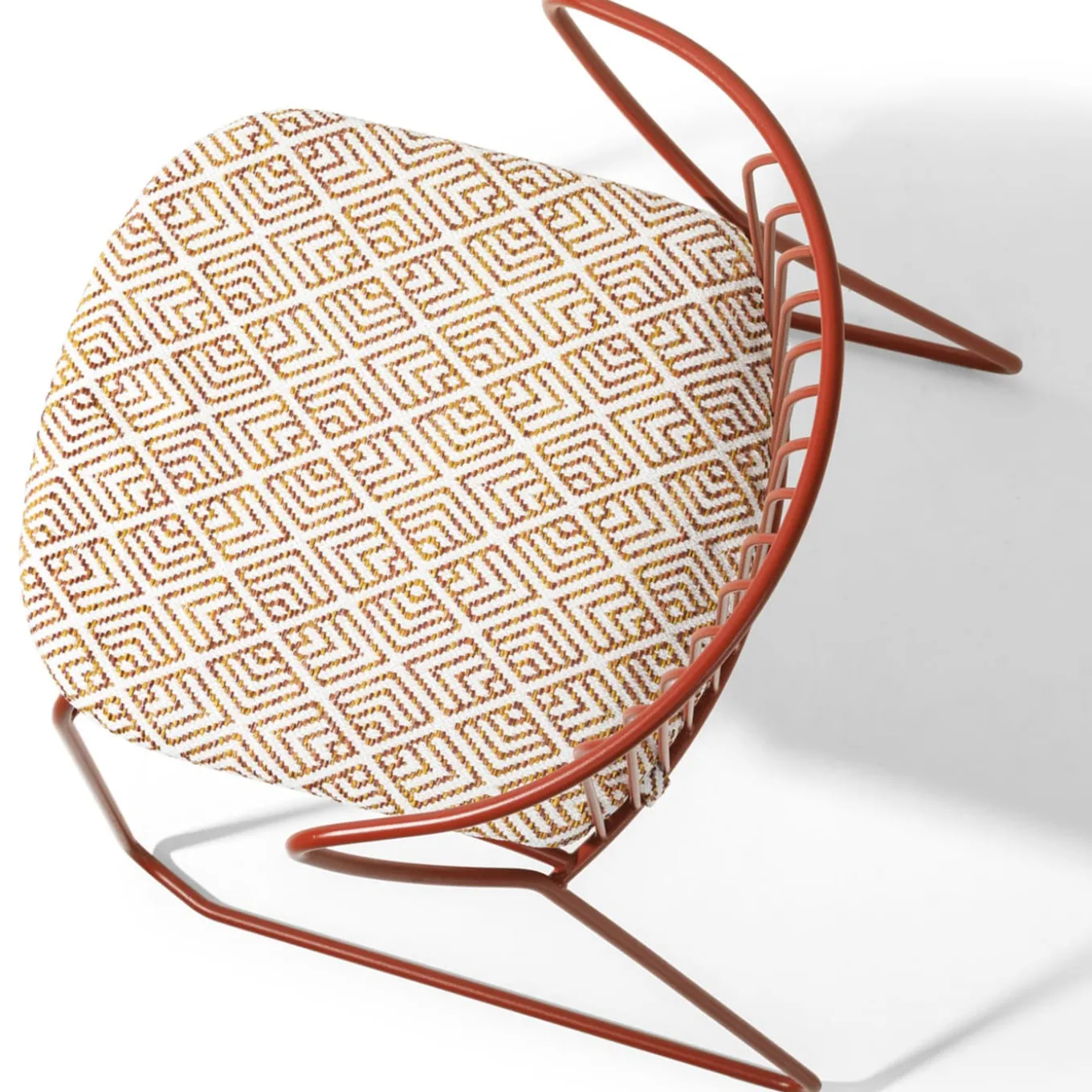 Airy and dynamic, the design of this chair suggests its placement in refined modern and contemporary homes, either gathered around a dining table or complementing a patio. The frame is crafted of red steel rods molded into a softly embracing shape for the backrest and a patterned, cushioned seat to offer long-lasting comfort. Black polypropylene feet complete the design.