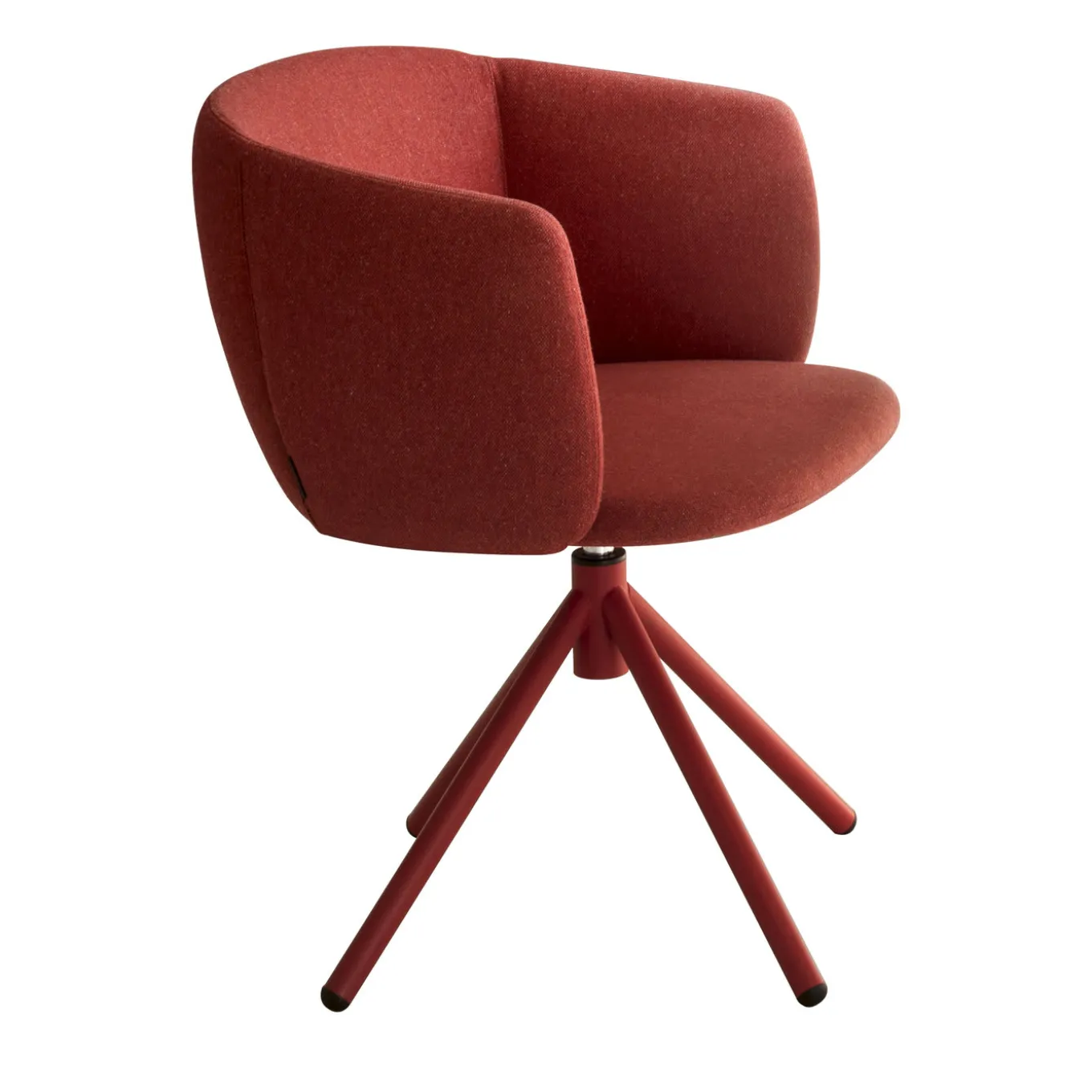 The perfect complement to a home office or living room, this small red armchair combines comfort and style in a timeless and versatile design. Characterized by an embracing silhouette with tailored back and armrests upholstered with red fabric, it features an inner steel shell padded with hard-injection polyurethane foam, and resting on a four-leg base fashioned of red, powder-coated steel. Contract and commercial certifications available upon request.