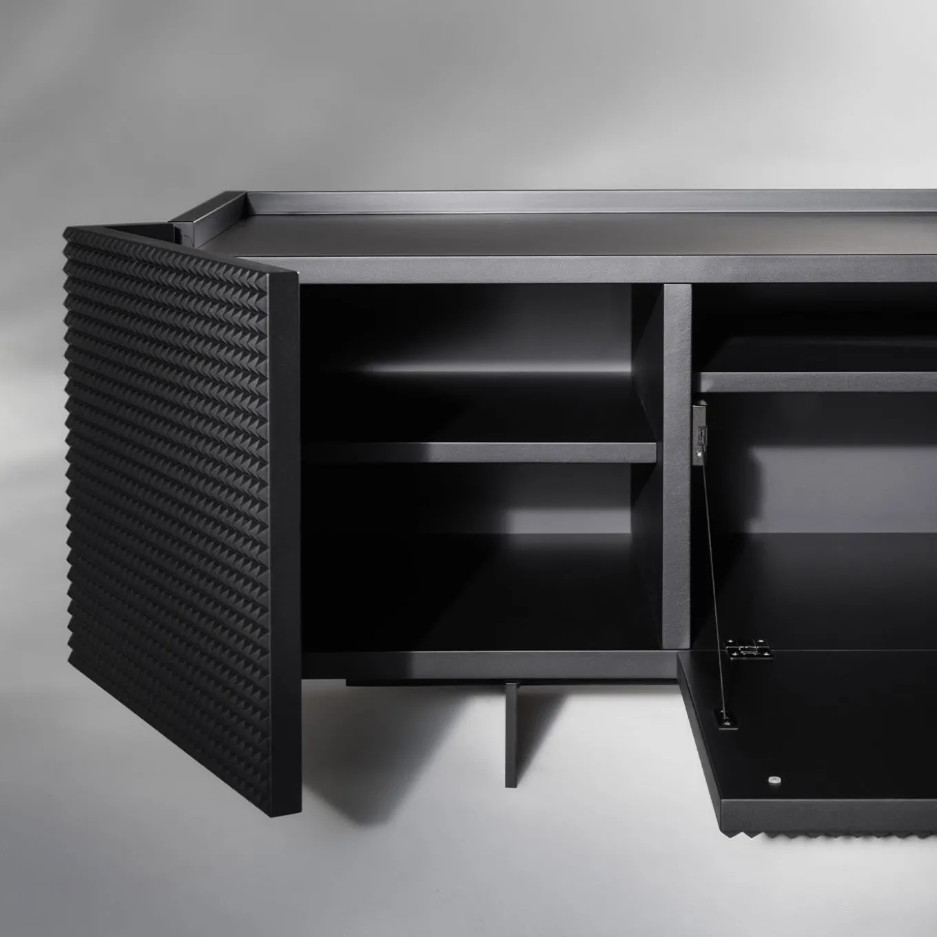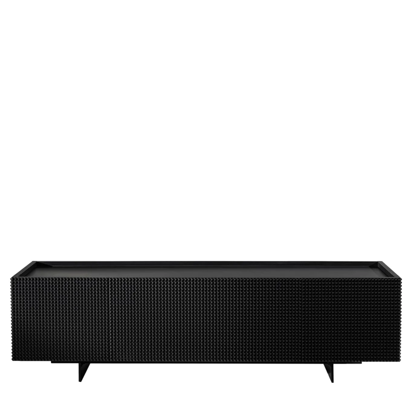 Defined by sleek, minimalist lines, this elegant TV stand will take center stage in a contemporary living room imbuing it with a distinctive yet sober character. Designed by Carlo Cumini, it is fashioned of textured and lacquered MDF, showcasing a total black look. It features two side doors and a practical hole for tucking cables out of sight.