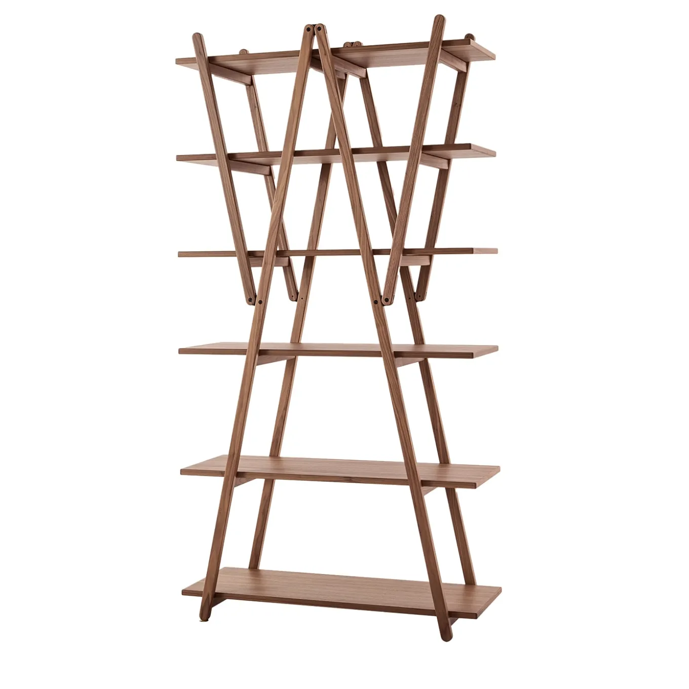 Designed by Vico Magistretti, this bookcase with its simple, clean-cut lines was the outcome of a detailed analysis of the classic model featuring side supports and shelves. The diagonal bracing struts become the support structure, and house the shelves, eliminating the need for side supports. Putting the focus on the hinges and the six shelves, the structure, which can be folded away, can also be used as a room-divider.