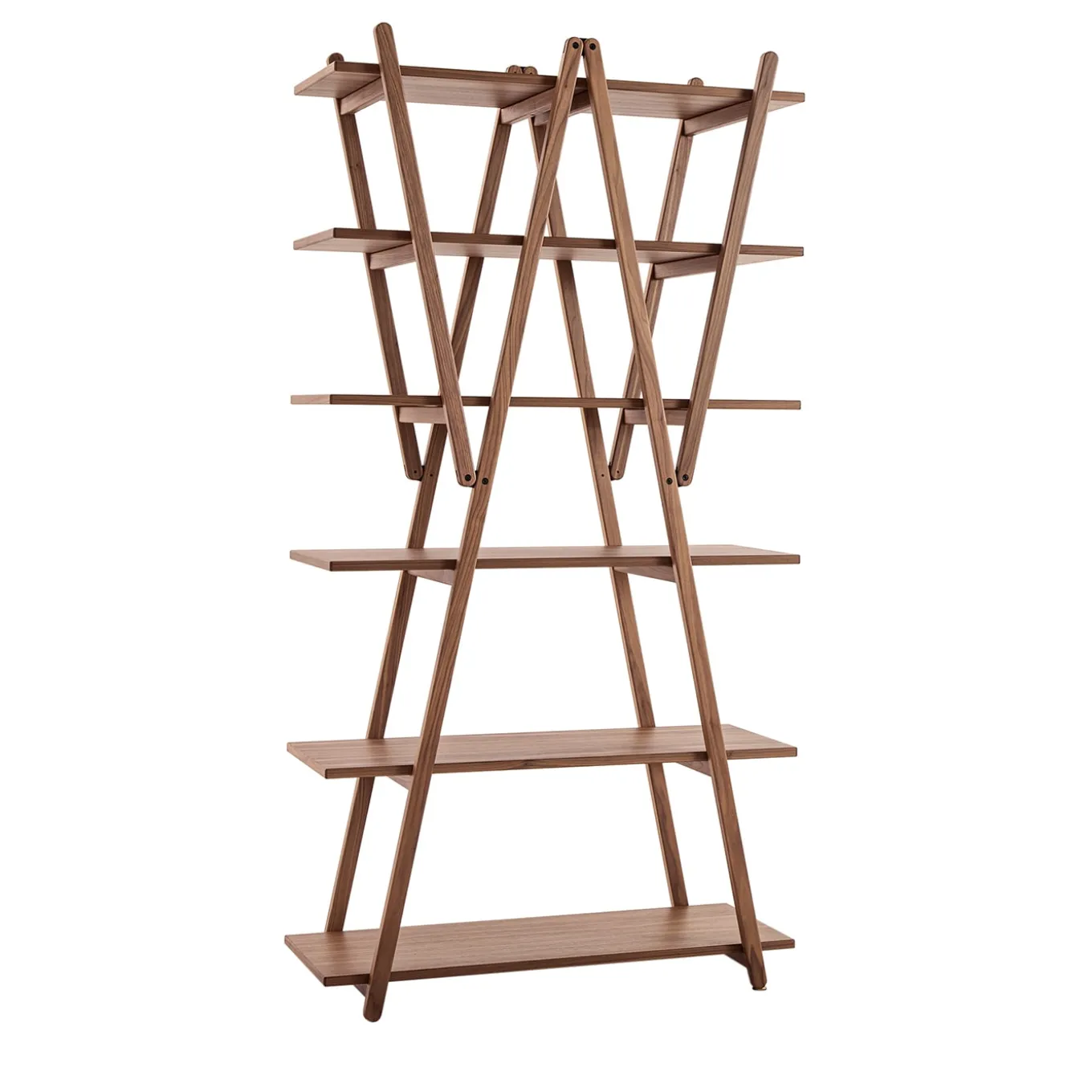 Nuvola Rossa – Bookcase. Designed by Vico Magistretti, this bookcase with its simple, clean-cut lines was the outcome of a detailed analysis of the classic model featuring side supports and shelves. This piece is an icon of design, yet also a veritable invention in terms of construction: the diagonal bracing struts become the support structure, and house the shelves, eliminating the need for side supports. Putting the focus on the hinges and the six shelves, the structure, which can be folded away, can also be used as a room-divider. Its elegant and primary aesthetic, timeless and easy to read, has made the Nuvola Rossa an undisputed design icon since 1977. It has been imitated several times as an example of simplified function achieved via an interplay of shapes.