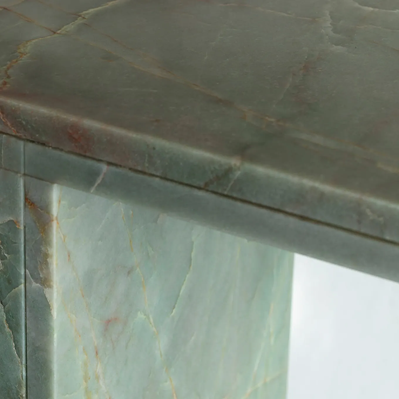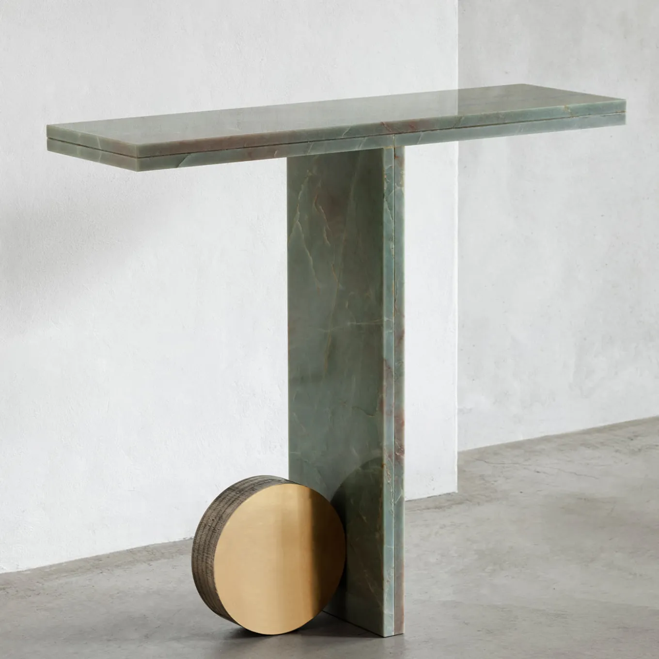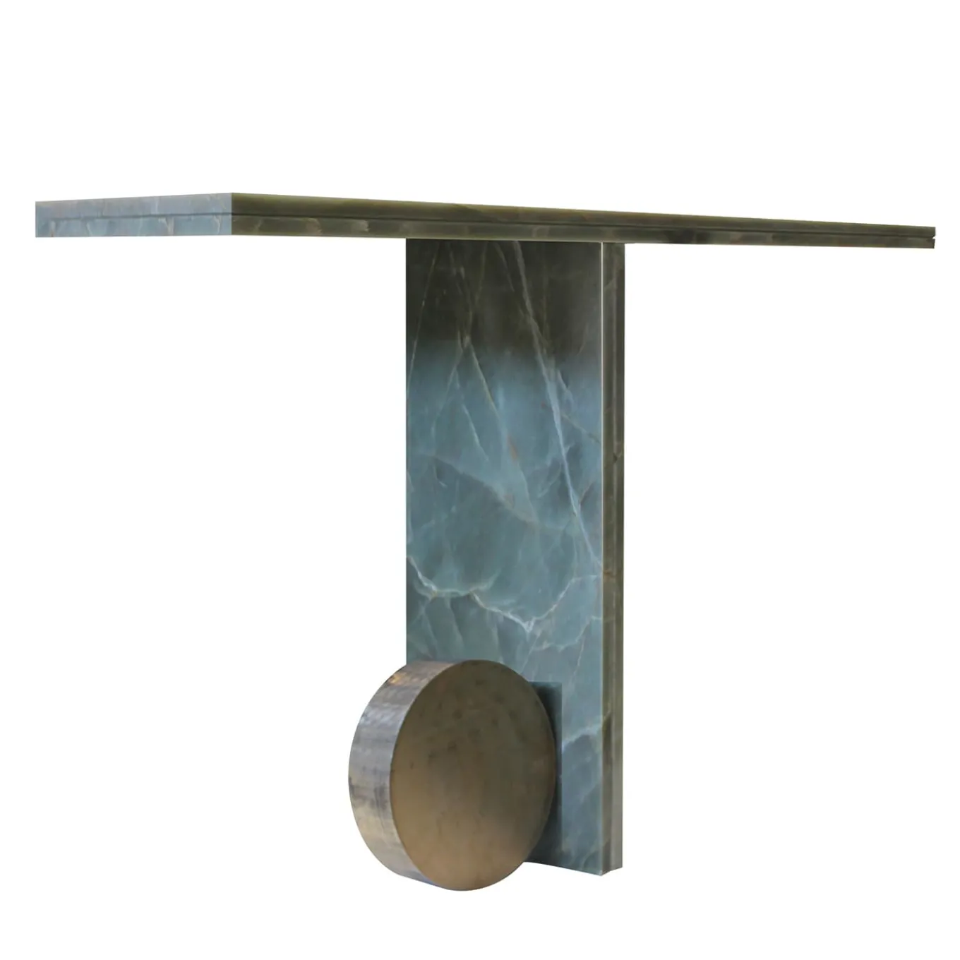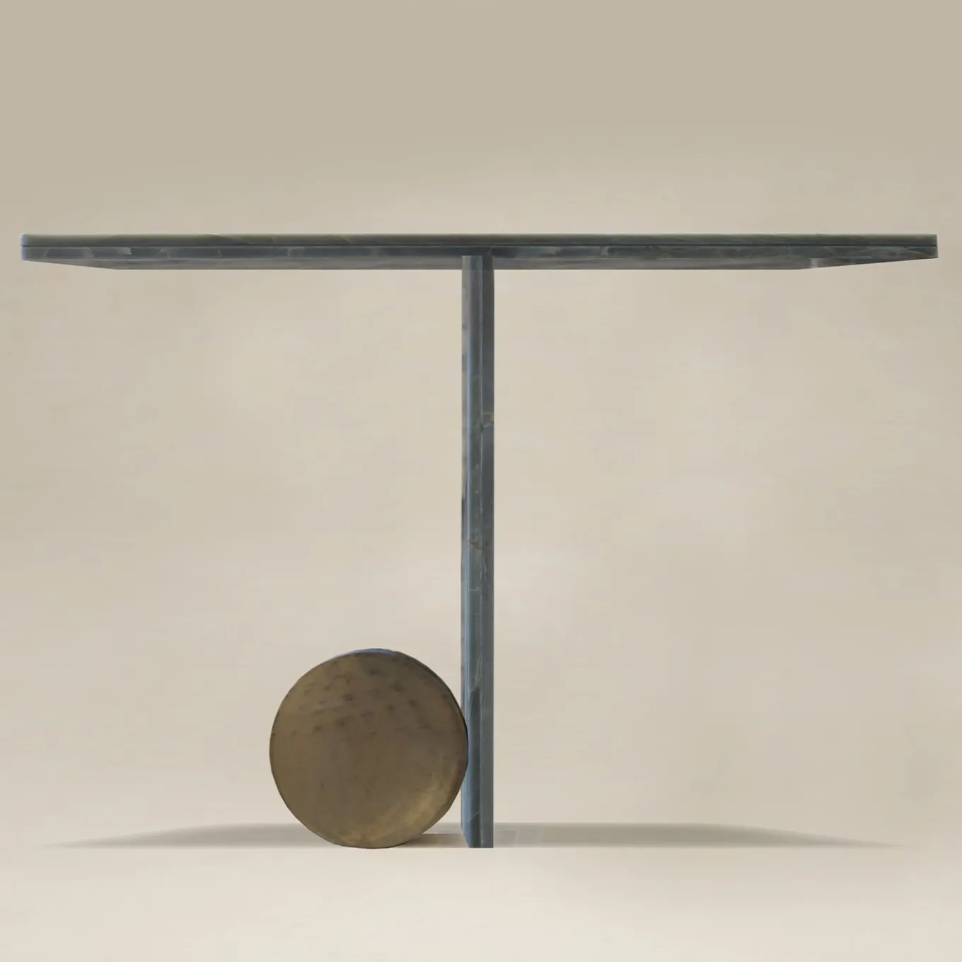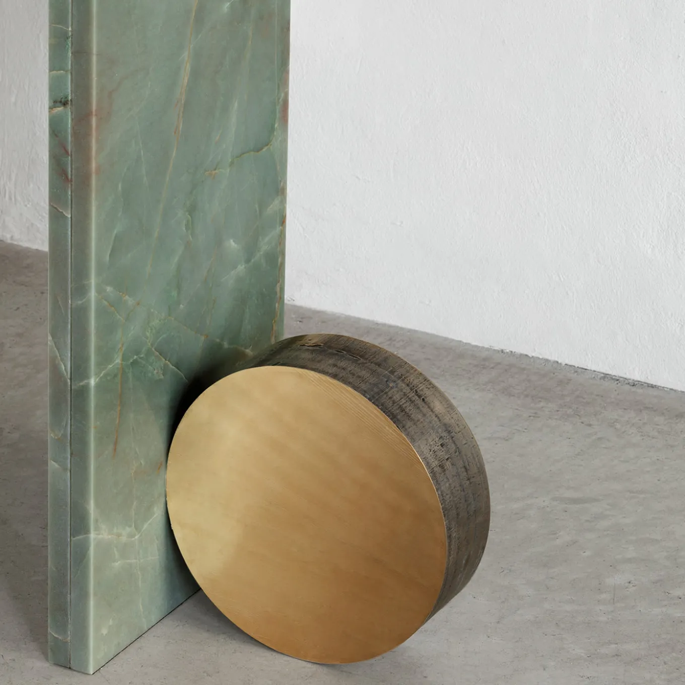 O console is defined by the intuitive gesture of superposing two marble slabs on the top of each other. As this first approach generates an unstable system, a third element has been added. The bronze disk is punctually connected to the ground and to the leg, separating itself from the tabletop. Despite the apparent indeterminacy of the encounters, the disk not only gives stability but also tension between the elements that make up the composition.