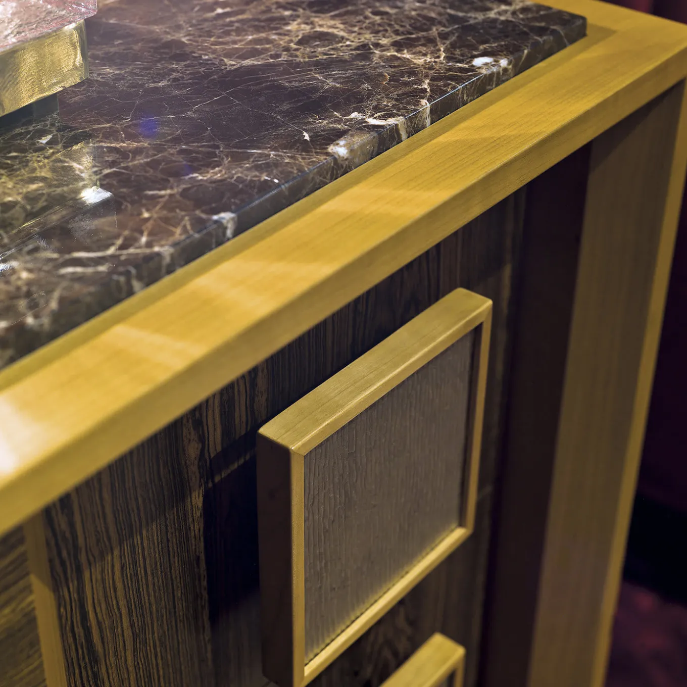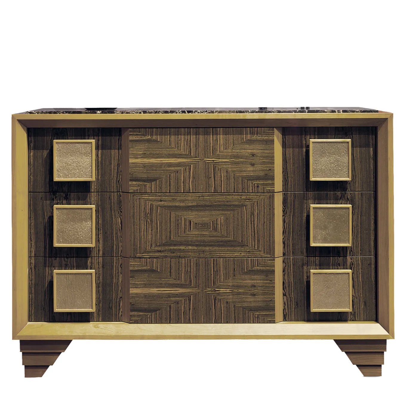 This striking dresser is a unique example of masterful craftsmanship. Entirely made by hand, it features a structure in cherry, with cherry feet mixed with bocote. The combination of these two woods appears also in the front panels of the three drawers that have a central inlay in bocote with brass handles. The dramatic dark brown grain of the bocote wood over its yellow background complements the brass square handles, while the Emperador Dark marble top adds luxury to the piece.
