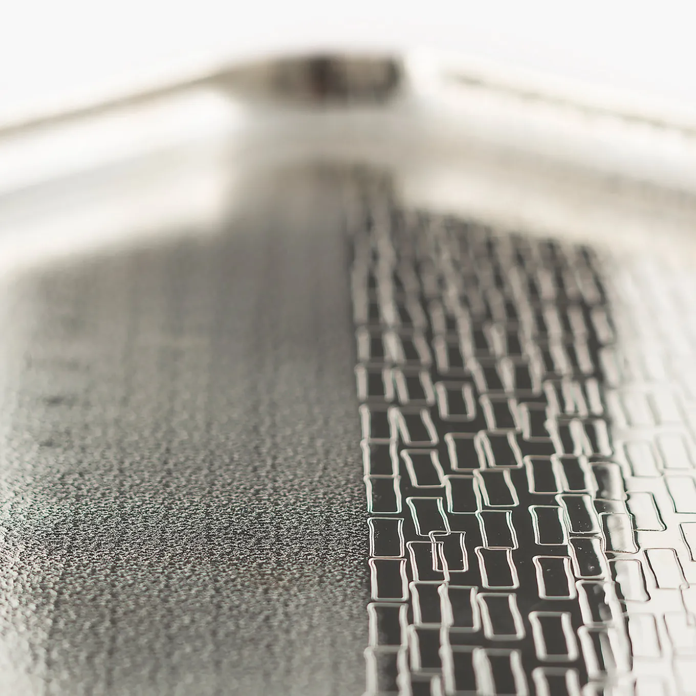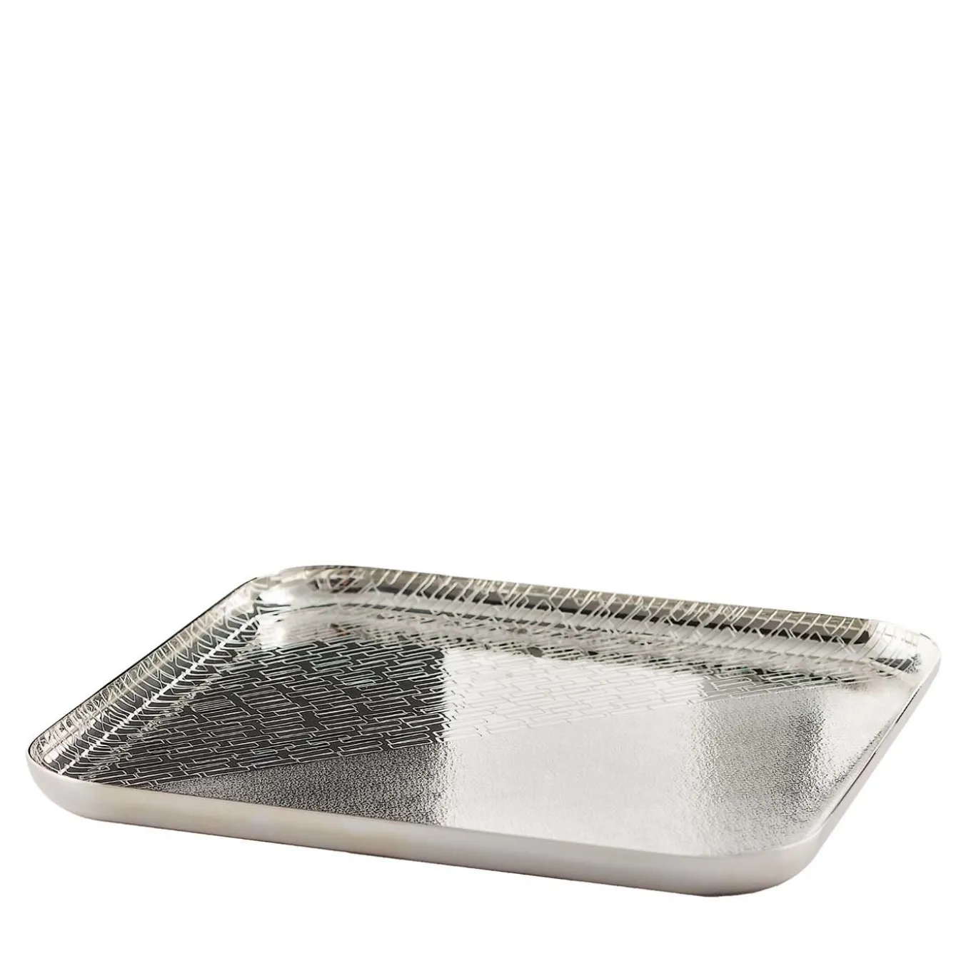 This square plate crafted of silver alloy demonstrates the versatility of Zanetto products. It is an expression of its two-sided soul, creating a striking textural dimension: one section is defined by thick hammering on the satin surface, while the other boasts a more sparse, hammered rectangular pattern. Each blow of the hammer falls in an unrepeatable way on the metal, creating a one-of-a-kind object. This elegant object of functional decor can be used to serve drinks or food on any occasion or to display collectibles on a table or furniture top.