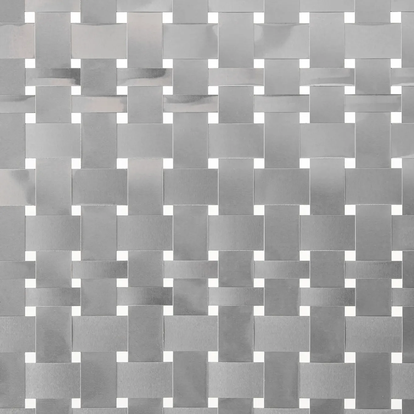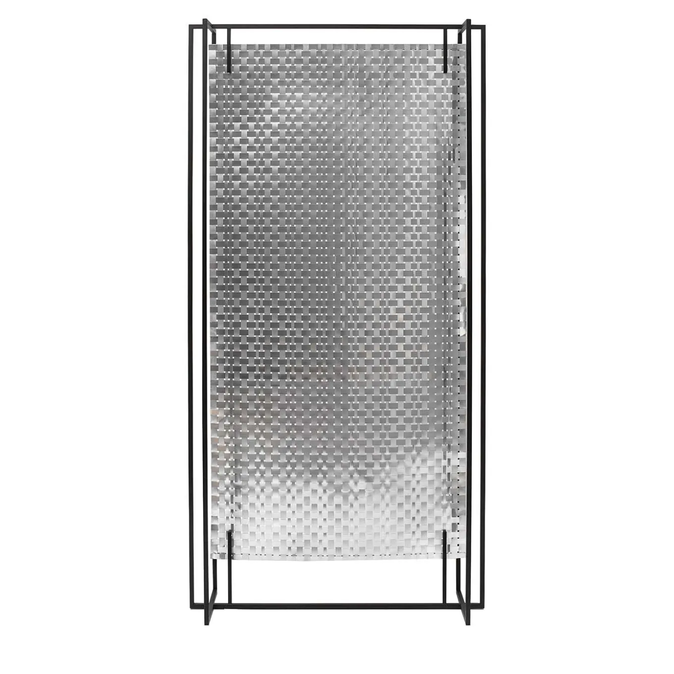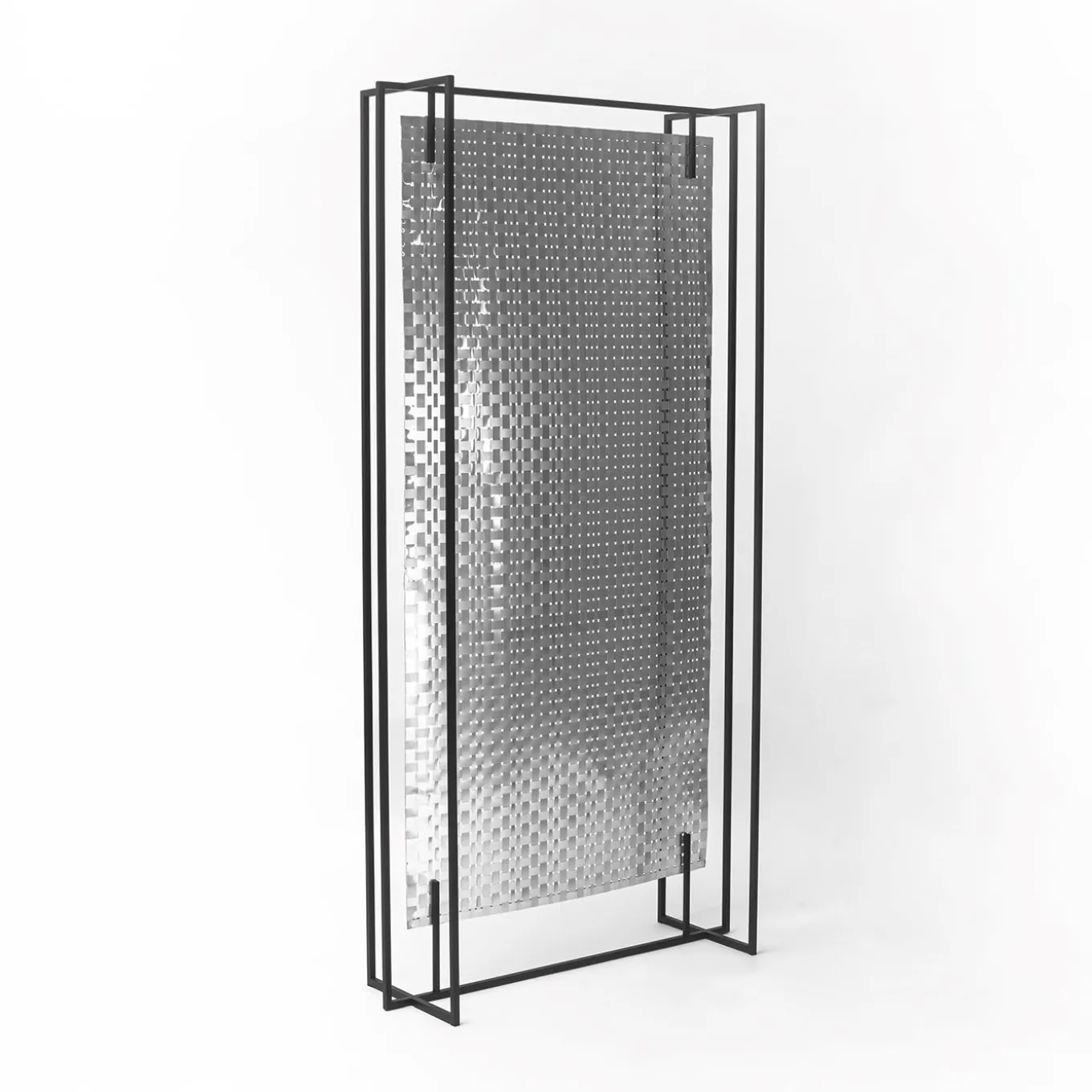 This dual-function floor panel can be used as a room divider or decorative backdrop. Its hand-woven aluminum-foil canvas features one opaque side, and the other with a slightly reflective surface in champagne-gold. Its thin, geometric structure is painted in black, which frames the piece with an exclusive touch. Made from recycled aluminum generated from industrial waste.