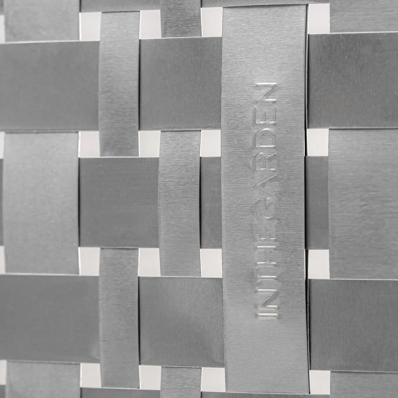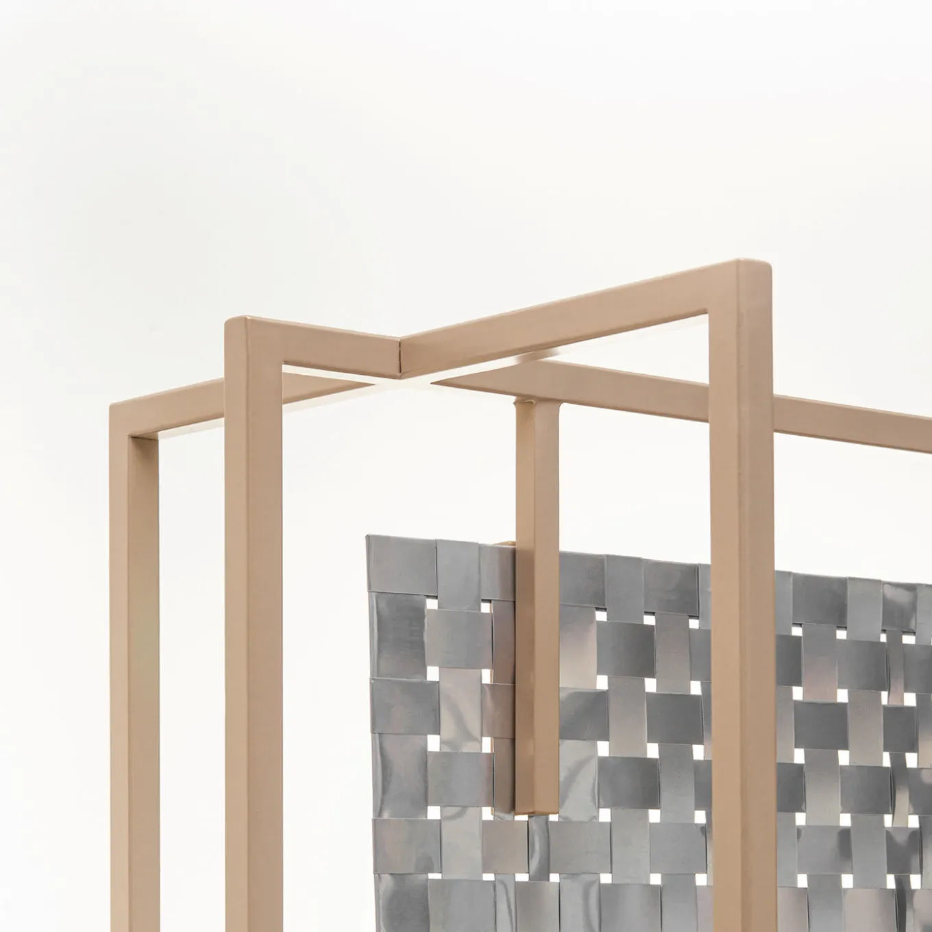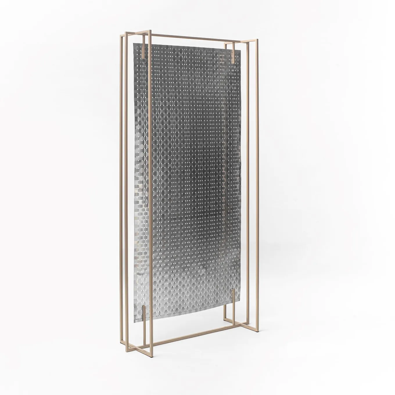 This dual-purpose floor panel can be placed in the middle of a space as a room divider, as well as being placed against the wall as a decorative backdrop. Its handwoven canvas includes aluminum foil, which gives one side a lustrous, reflective sheen, while the other has an opaque finish in champagne-gold. A thin, gold-colored, iron frame completes the look.