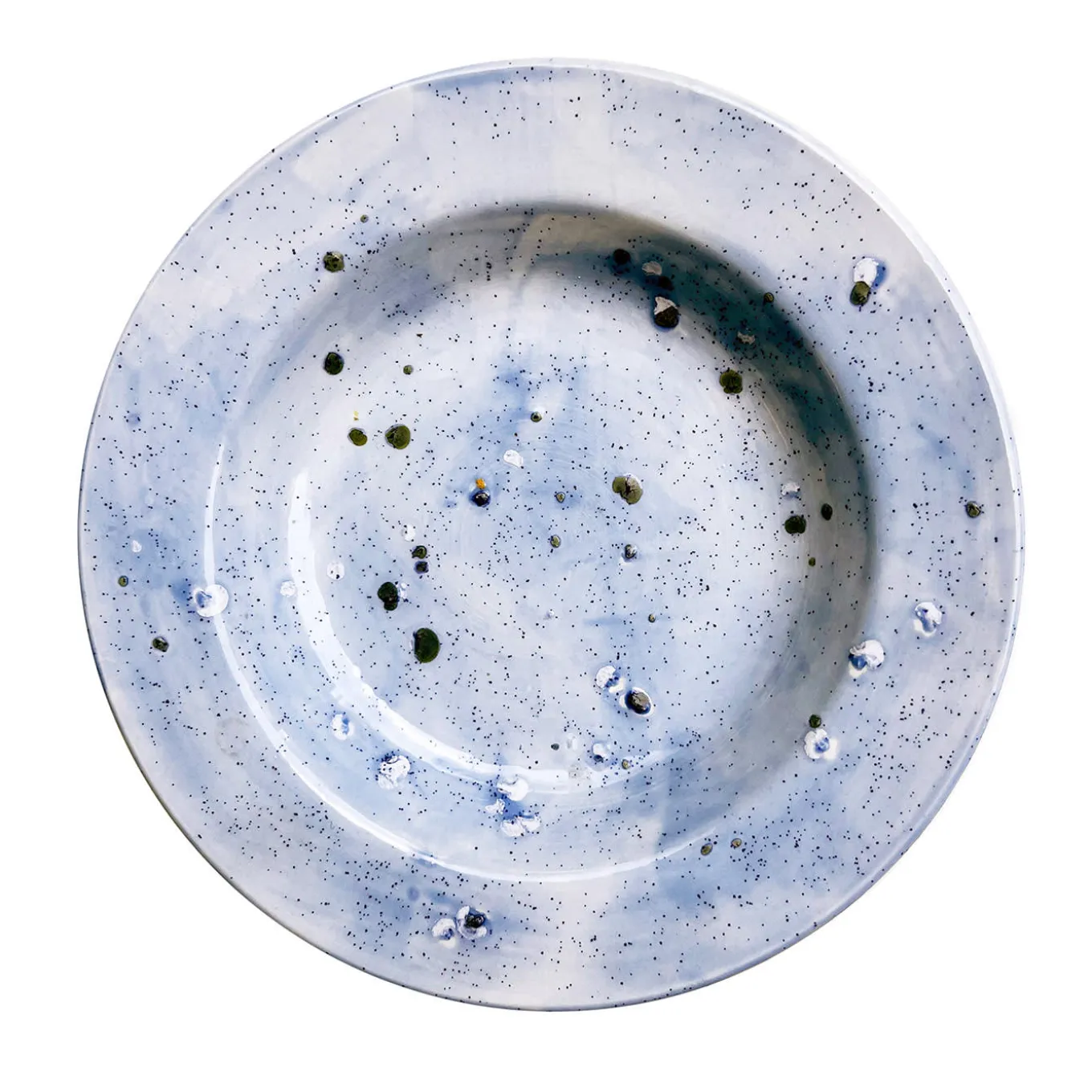 This round soup plate is marked by tiny specks and colorful enamel drops emerging from a shaded blue background. Fashioned of top-quality ceramic and deftly painted by hand, it makes for the perfect solution to complement minimalist table settings one wants to accent with a dash of artistic allure. Fruit and dinner plate counterparts can be found in the Artemest catalog.
