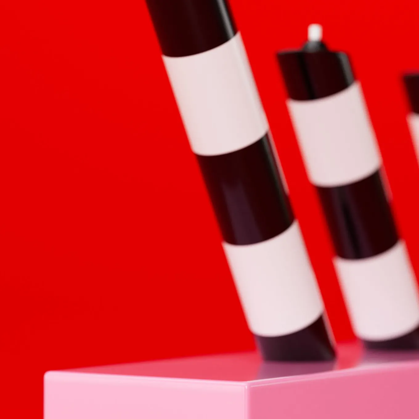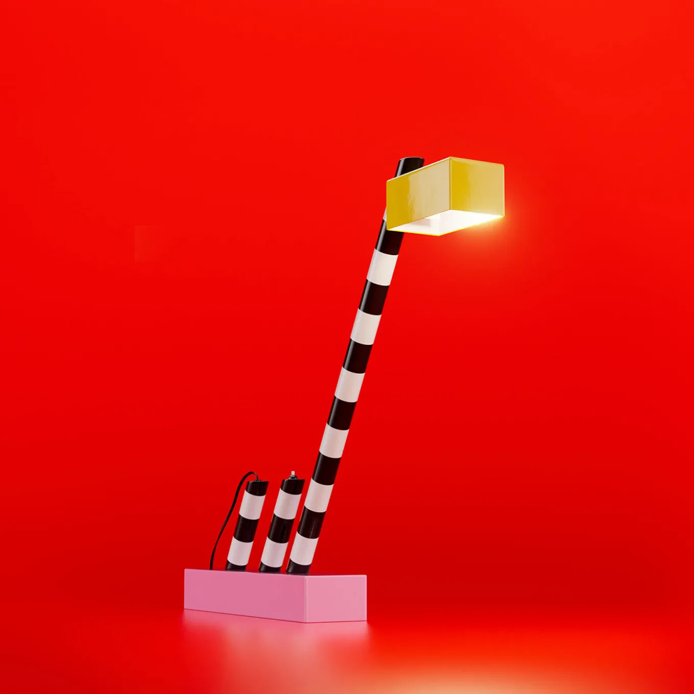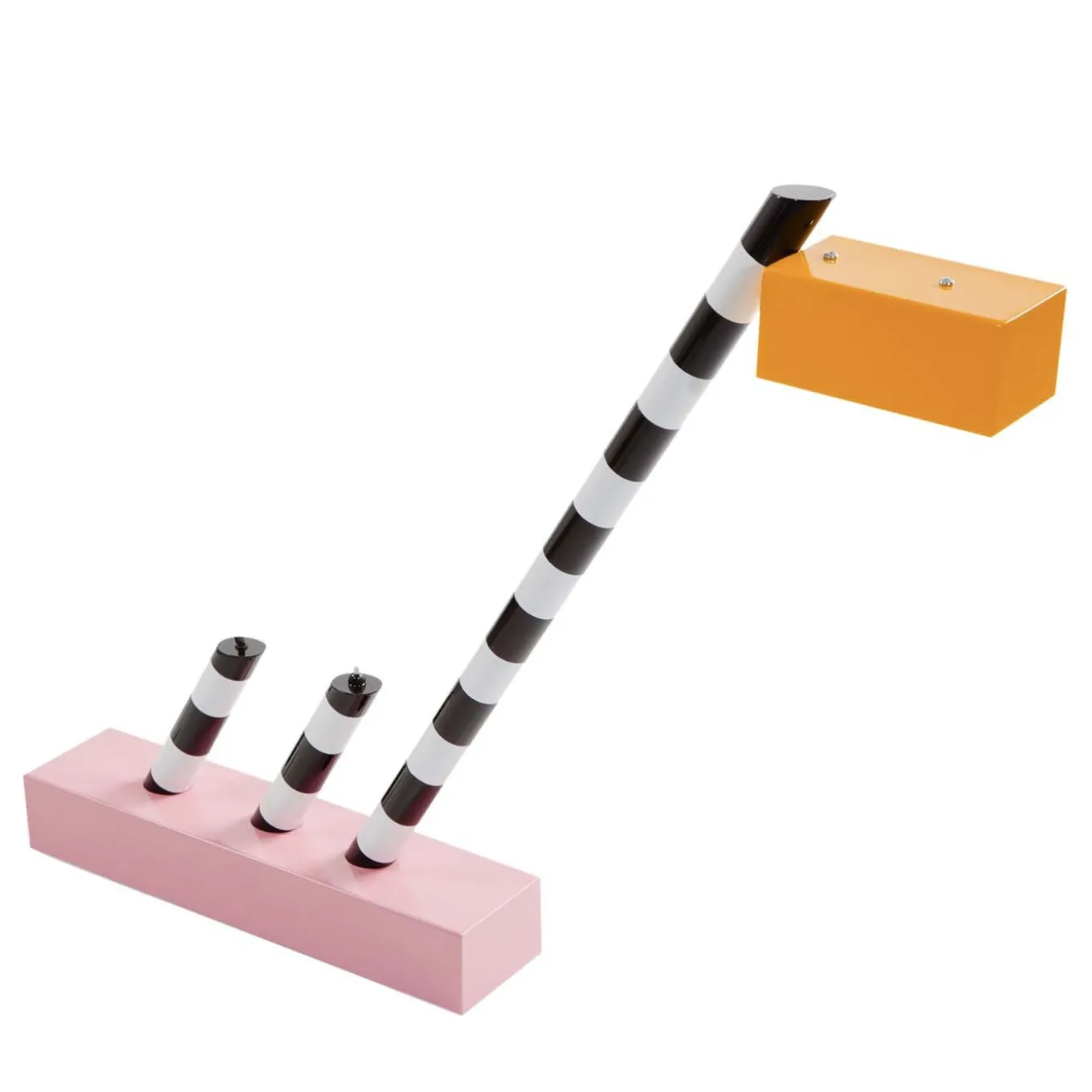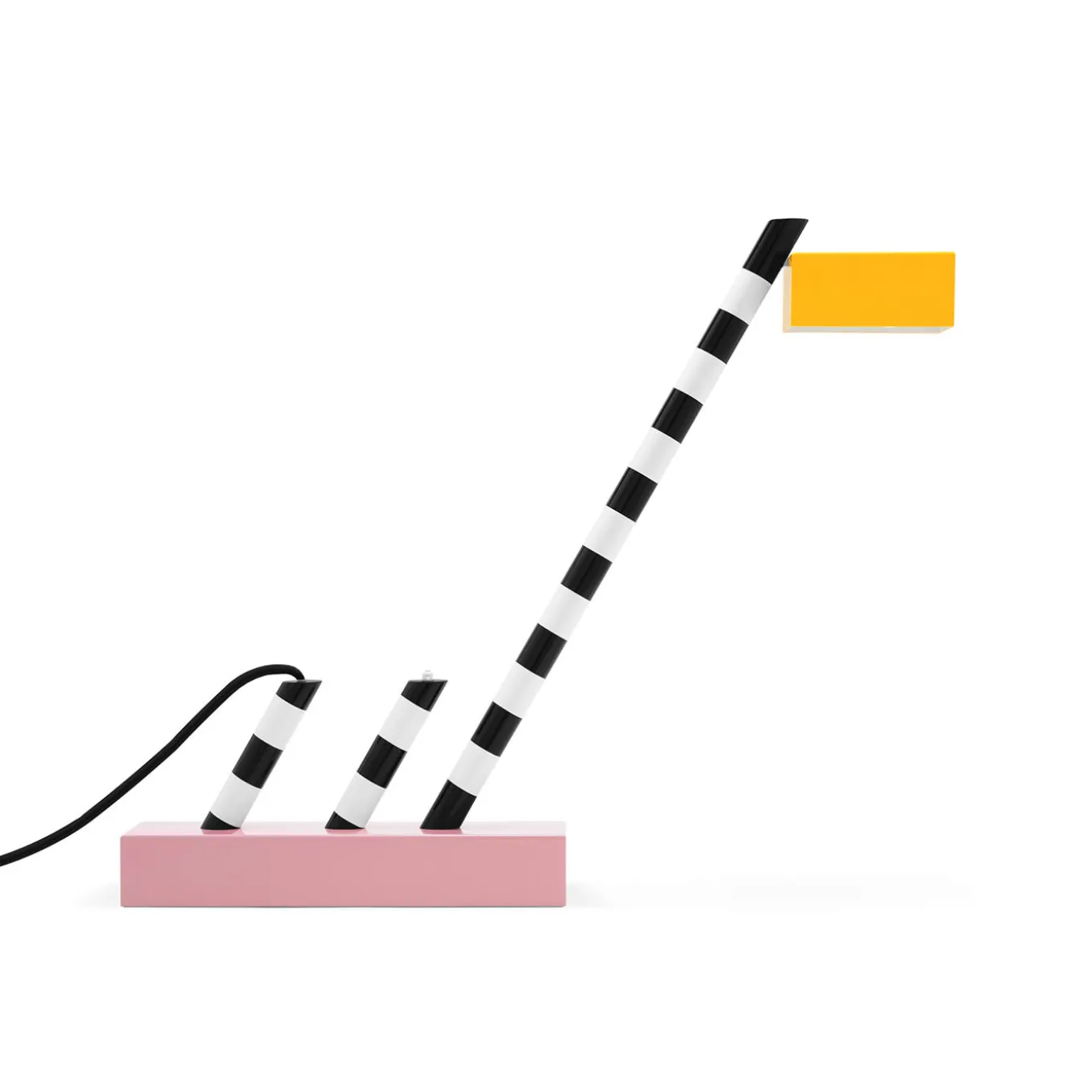 This striking table lamp is a postmodernist work of art designed by Michele De Lucchi in 1981. It is crafted of tubular metal adorned with polychromatic paint that combines black and white striped pattern with delicate shades of pink and orange. Resembling a whimsical ocean creature, this piece will infuse in a contemporary study, entryway, or living room an elegant sense of movement and unique decoration.
