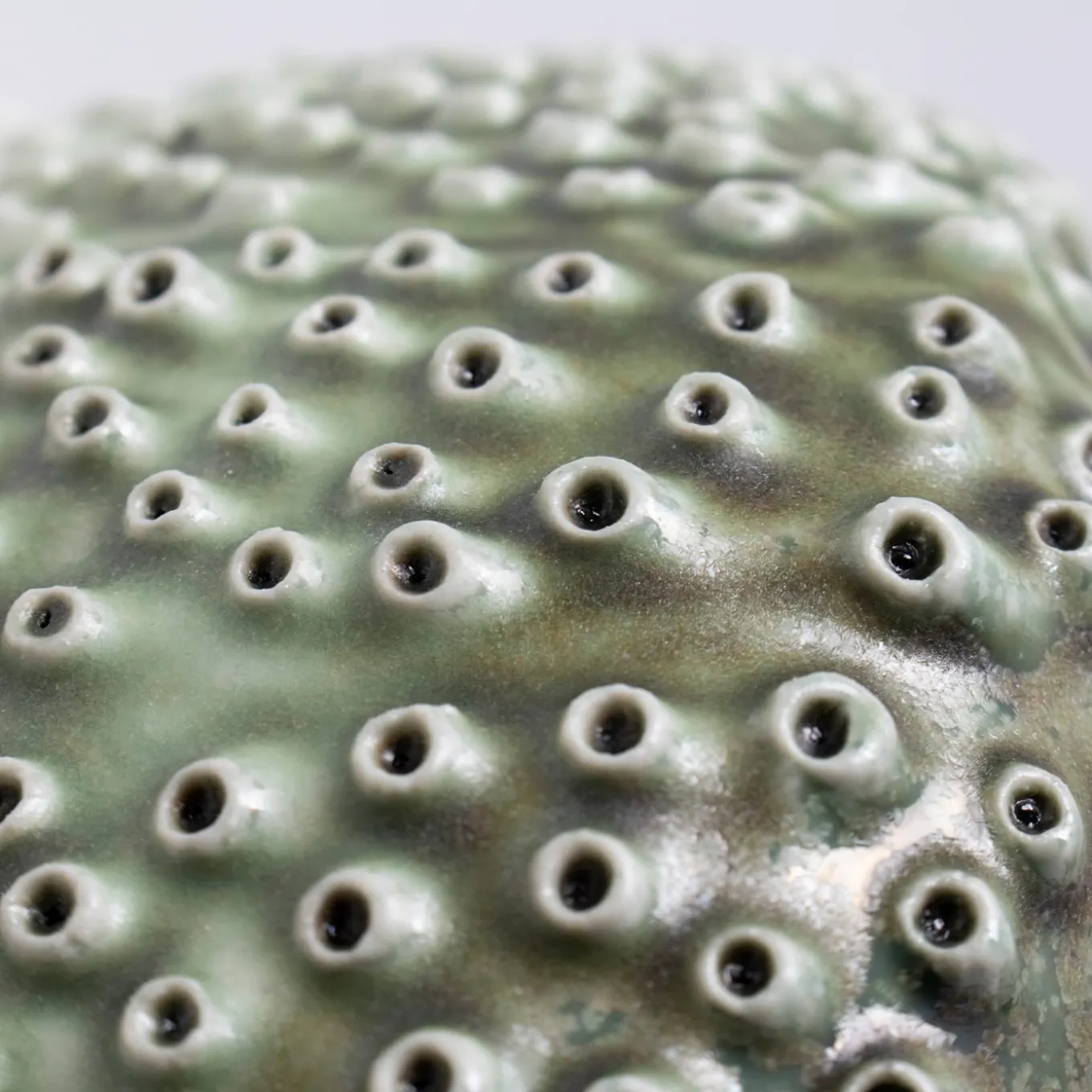 Oceano is a porcelain bowl, part of the Porifera Collection, a hymn to the beauty of the marine world, with a myriad of tiny holes. The texture, inspired by corals, celebrates the Ocean, astonishing for the exotic shapes of its creatures. Each object is decorated with metal oxides, creating a multitude of green shades that are always different, streaked with crystallizations that light up the tones and alternate matt and glossy surfaces. Unique piece, result of a balance between art and craft.