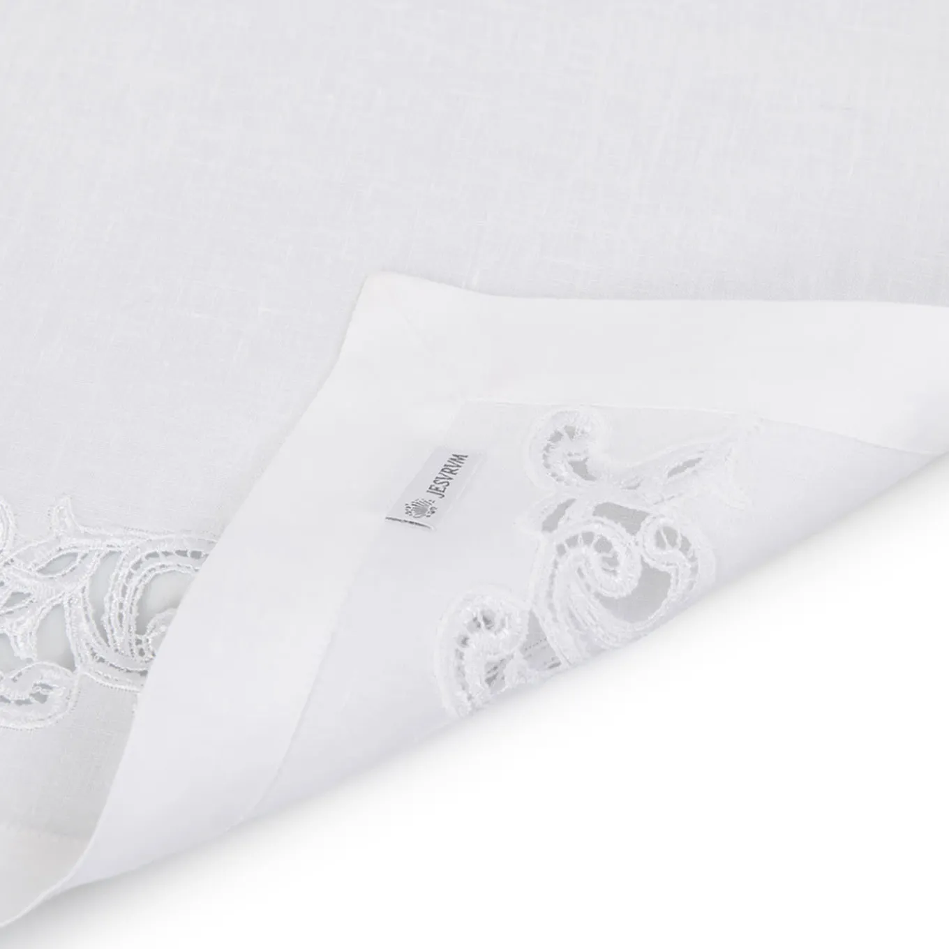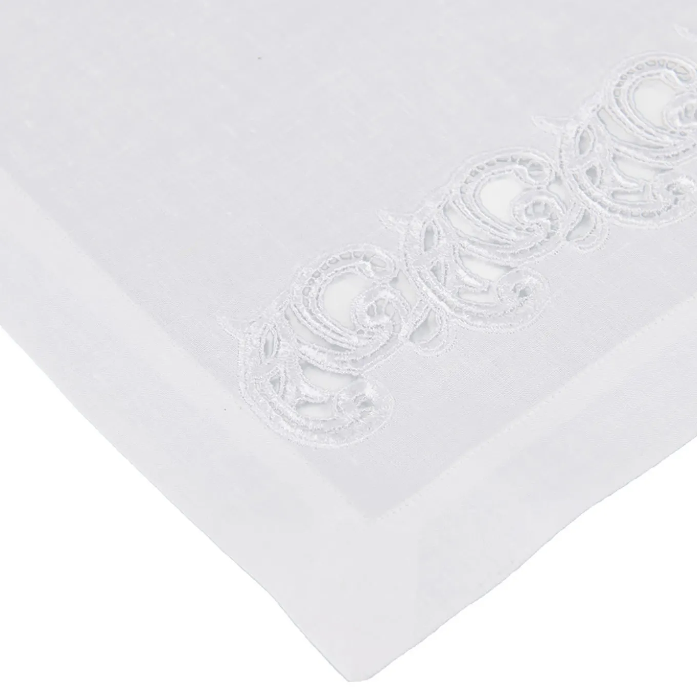 A stupendous showcase of refined and traditional craftsmanship, this exquisite placemat will make a timeless accent piece for an elegantly set dining table. Distinguished by a marvelous handmade curved tone-on-tone lace enhancing its two short sides, it is handmade of precious white linen.