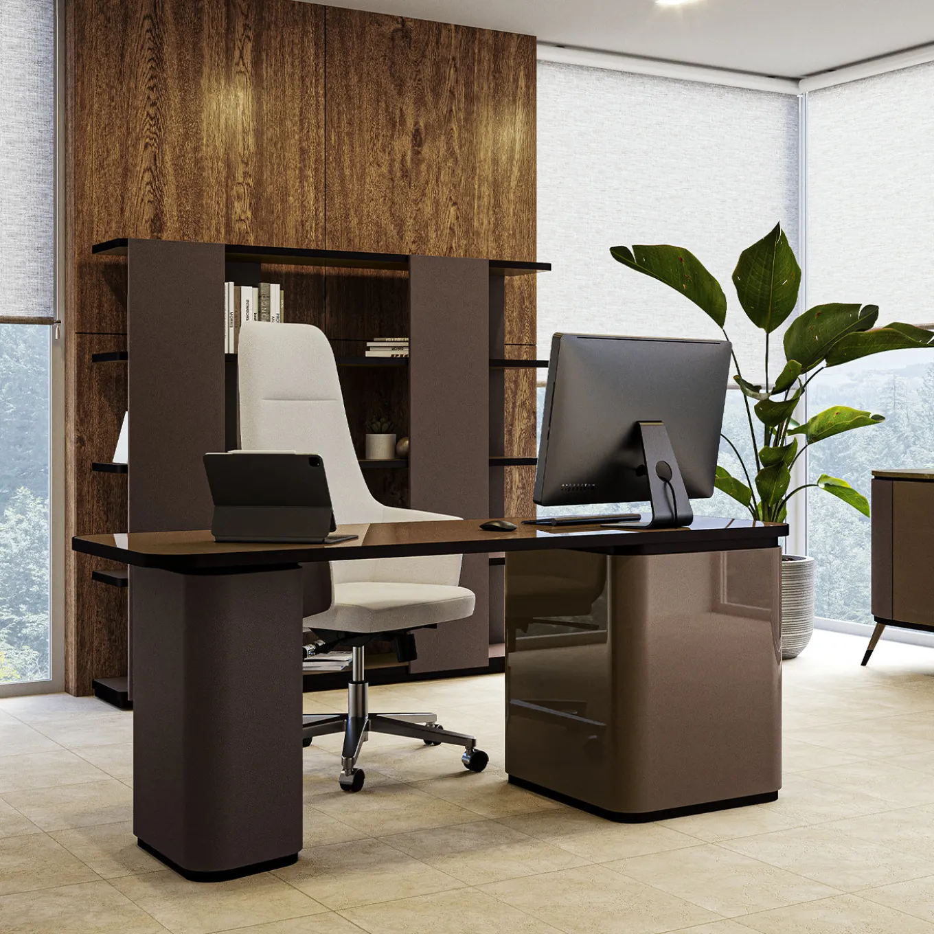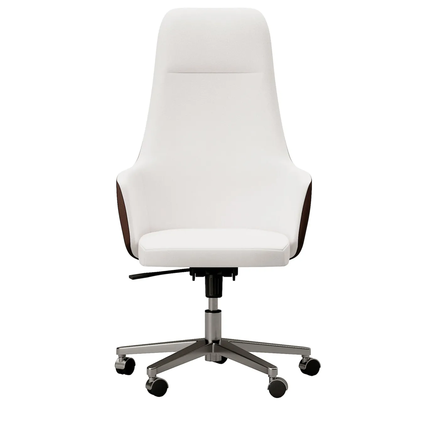 The Olivia swivel chair features an ergonomic silhouette with plush foam padding and a soft bicolor leather upholstery, combining brown on the exterior with light gray on the interior. Its polished metal base includes five wheels for smooth mobility, making it a practical and comfortable choice for office environments.