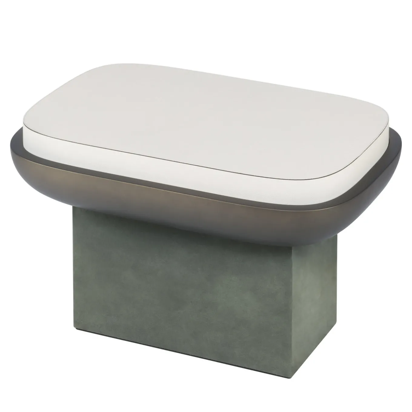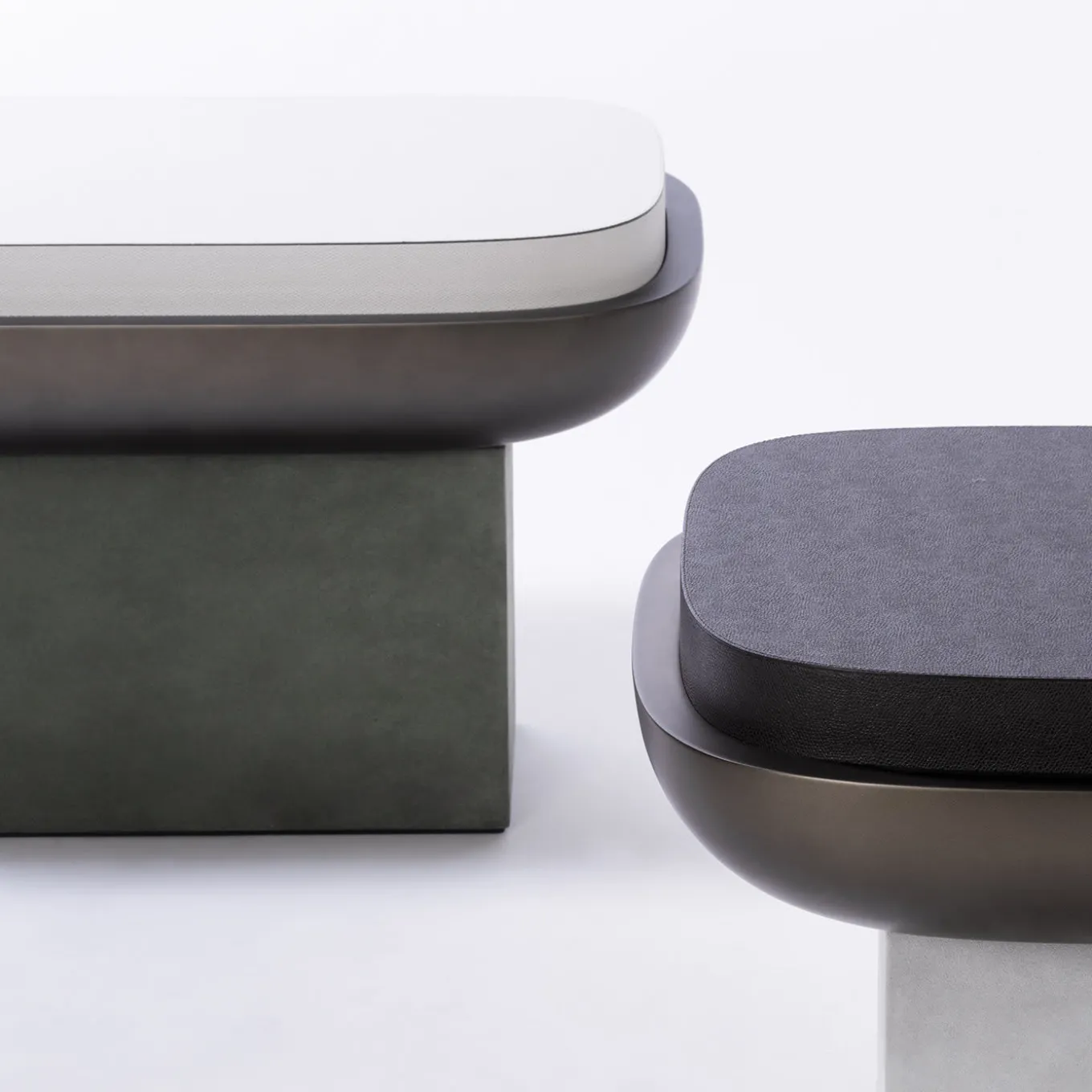 A stylish combination of prized materials, this refined stool of the Olympia Collection designed by Stéphane Parmentier captures the essence of Oriental architecture and finds its main inspiration in the futuristic architecture of Oscar Niemeyer’s Parliament of Brazil. The minimalist and sensual wooden structure boasts a column base covered with taupe suede that complements the hues of the bronze-finished bowl and dark-lacquered top. Leather is also available in nappa and printed calfskin.