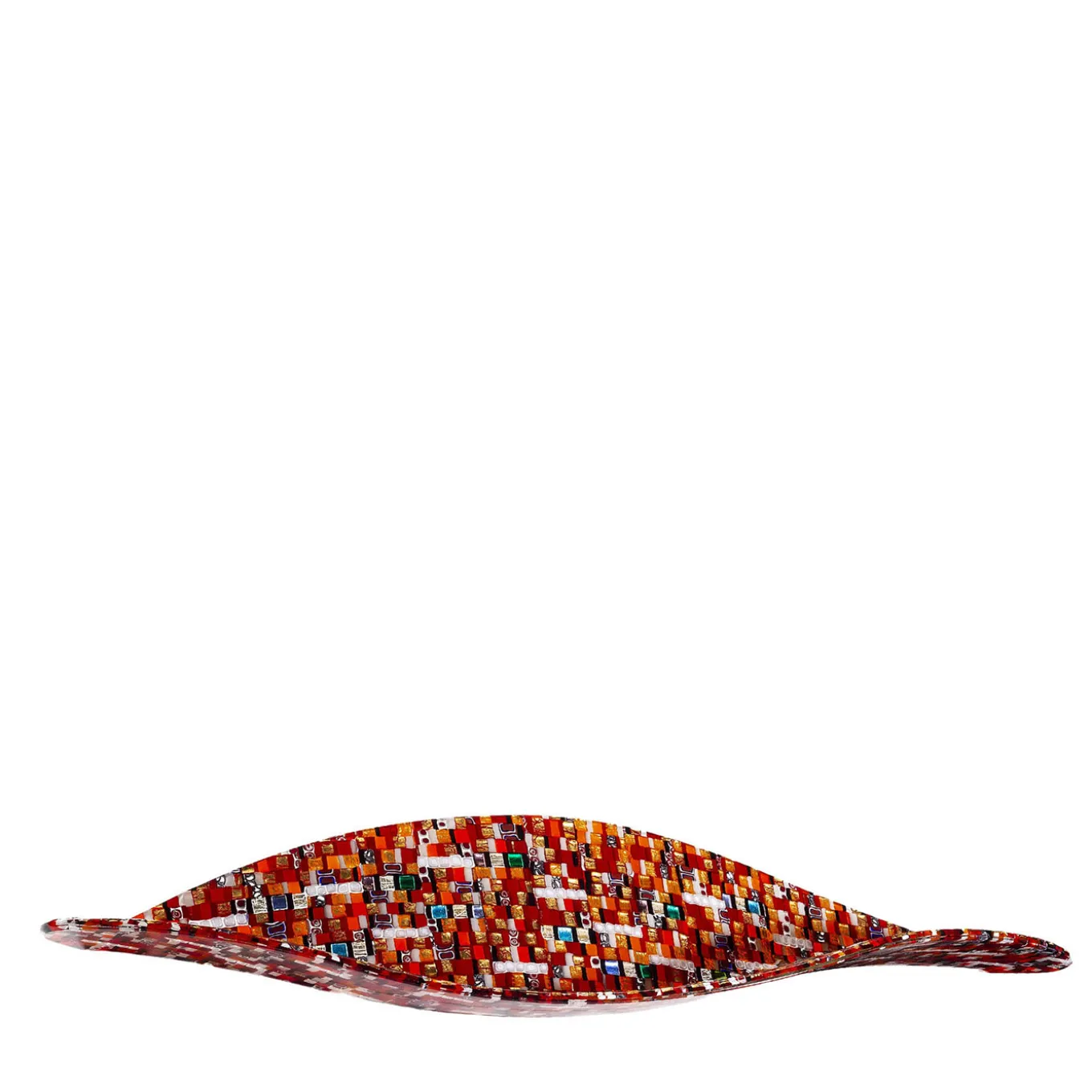 This stunning decorative sculpture crafted of hand-blown Murano glass is made with hundreds of small multicolored mosaic tiles. The sinuous shape makes it a versatile decor piece suitable for any environment, serving as both a standout centerpiece and an elegant accent. Venetian red, light green, aquamarine, black, ivory, and gold and silver leaf elements come together in a harmonious balance of shapes and colors. Each piece is meticulously crafted by Venetian glass masters.