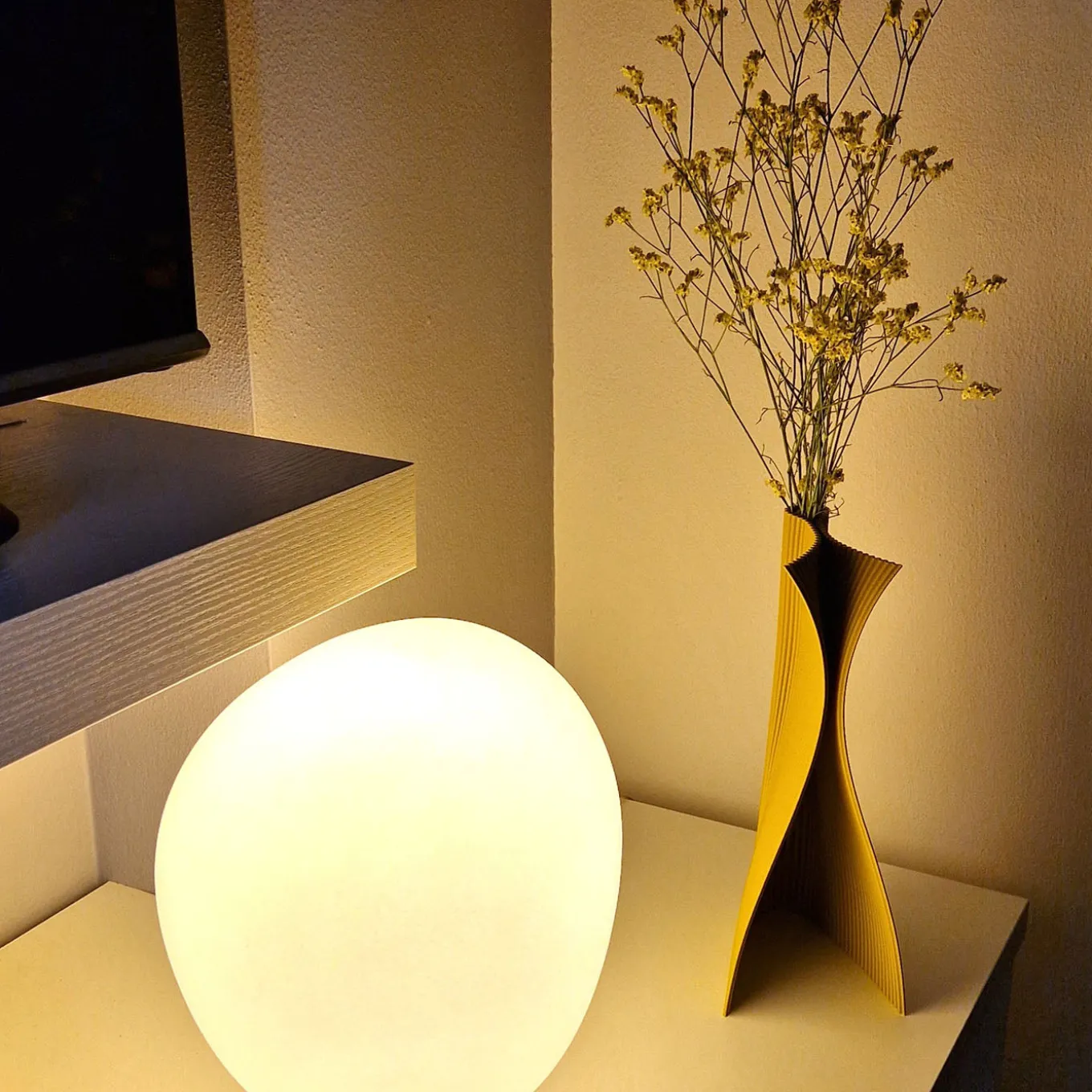 The Onda yellow decorative vase features a graceful, sinuous design that captures the fluid motion of water in continuous change. Standing 30 cm tall, its elegant rippled lines evoke a sense of lightness and unpredictability. Made with innovative digital craftsmanship, each piece may show slight variations in color and texture. Designed for indoor use, the vase includes a glass container suitable for holding liquids; plastic parts are sensitive to UV light and should be kept out of direct sunlight. Made from eco-friendly, plant-based PLA using 3D printing technology, this digitally crafted vase is not mass-produced and comes in various colors. Please Contact the Concierge for available options.
