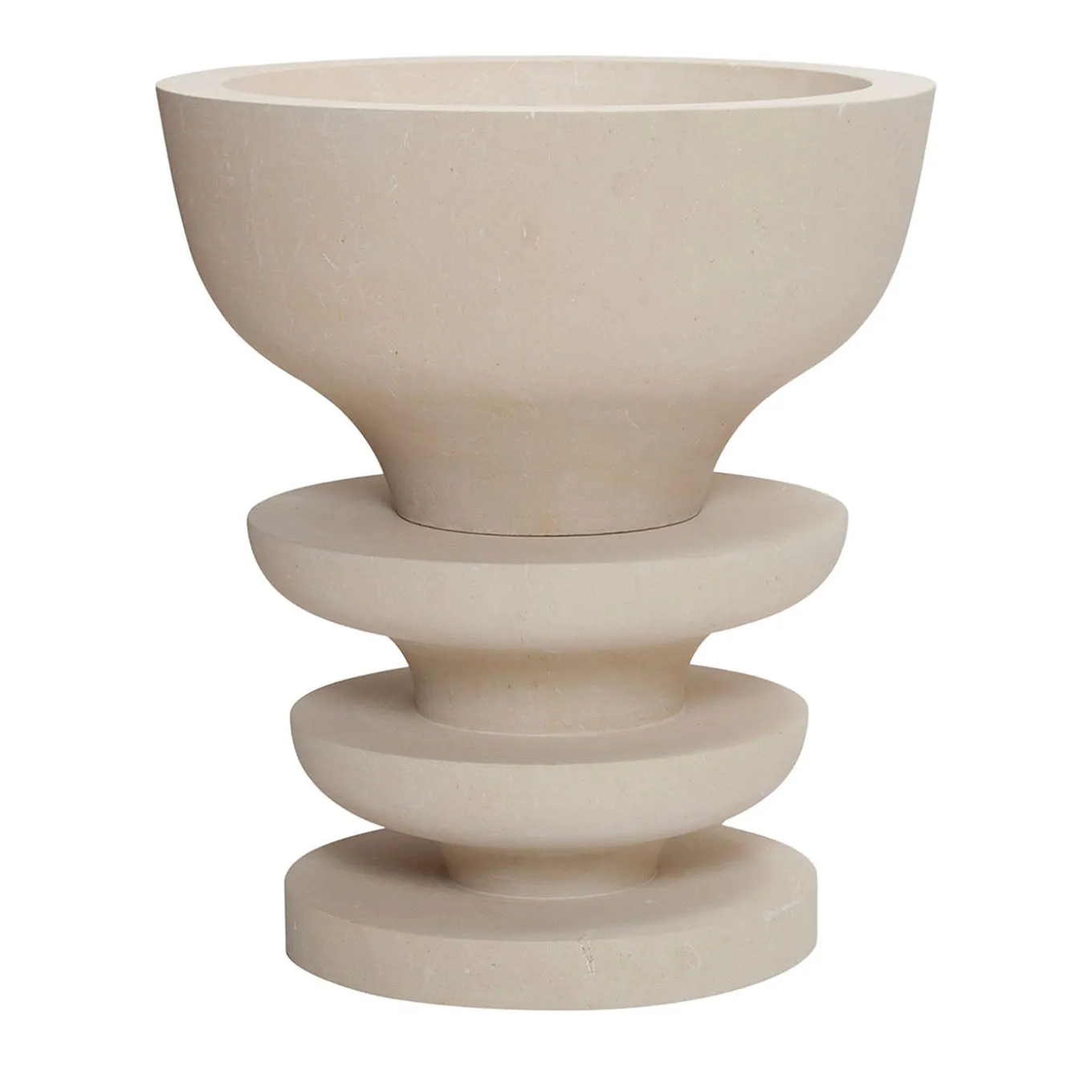 The unusual shape of the Ondulation Collection by Matali Crasset stems from a project extracted from a digital animation: a hypnotic dream where you are traveling in an imaginary country, arriving at a city where the towers sway gently to soothe the people. Pimar natural stone takes the shape of a series of structures similar to the undulating towers. The result is a collection of objects consisting of a table, a stool, and a pot, entirely made of stone through the turning technique.