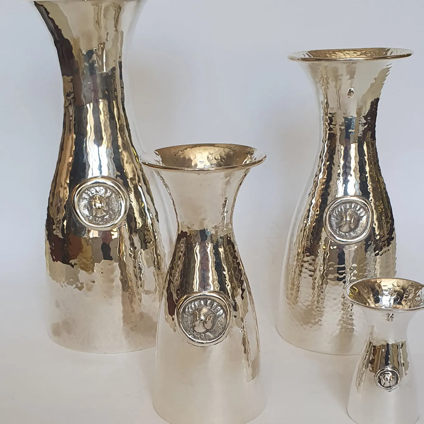 This elegant interpretation of an iconic dinner table object is made entirely in solid silver. The classic one-liter bottle, that is a staple of old-fashioned trattorie throughout Italy, is given a sophisticated upgrade. The surface of the silver was lightly hammered to give it a gently wrinkled texture, while the center is engraved with the emblem that traditionally mentions the quantity of liquid contained. Playful and classic, this piece will enrich any decor.