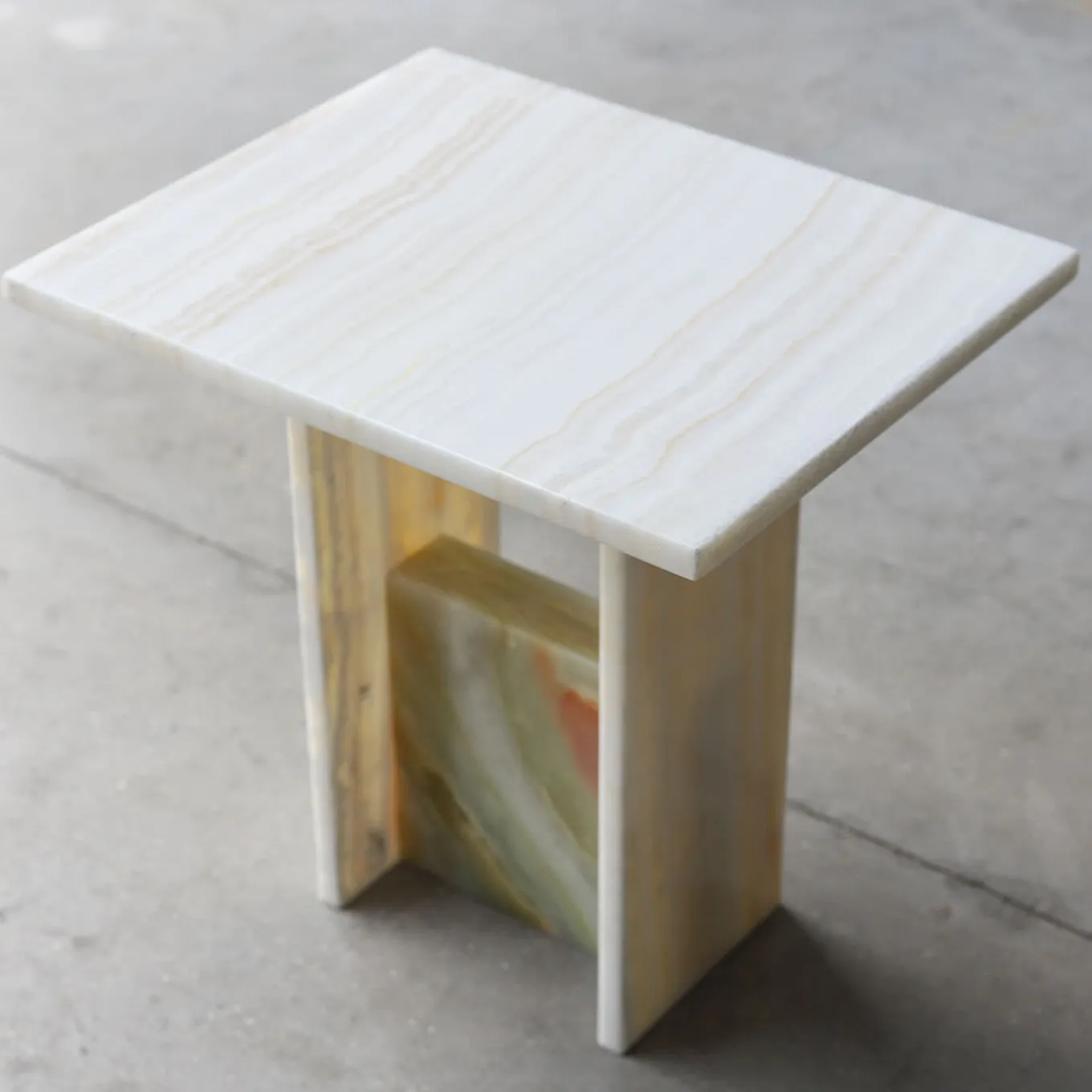 This side table is part of a set of two pieces. It combines sleek lines and sculptural marble stone elegantly juxtaposed with the likewise-fashioned top and side marble offcuts. A functional sculpture playing with geometry, balance, and nature to elevate the look of any contemporary living space. Please ask the Concierge service for more information.