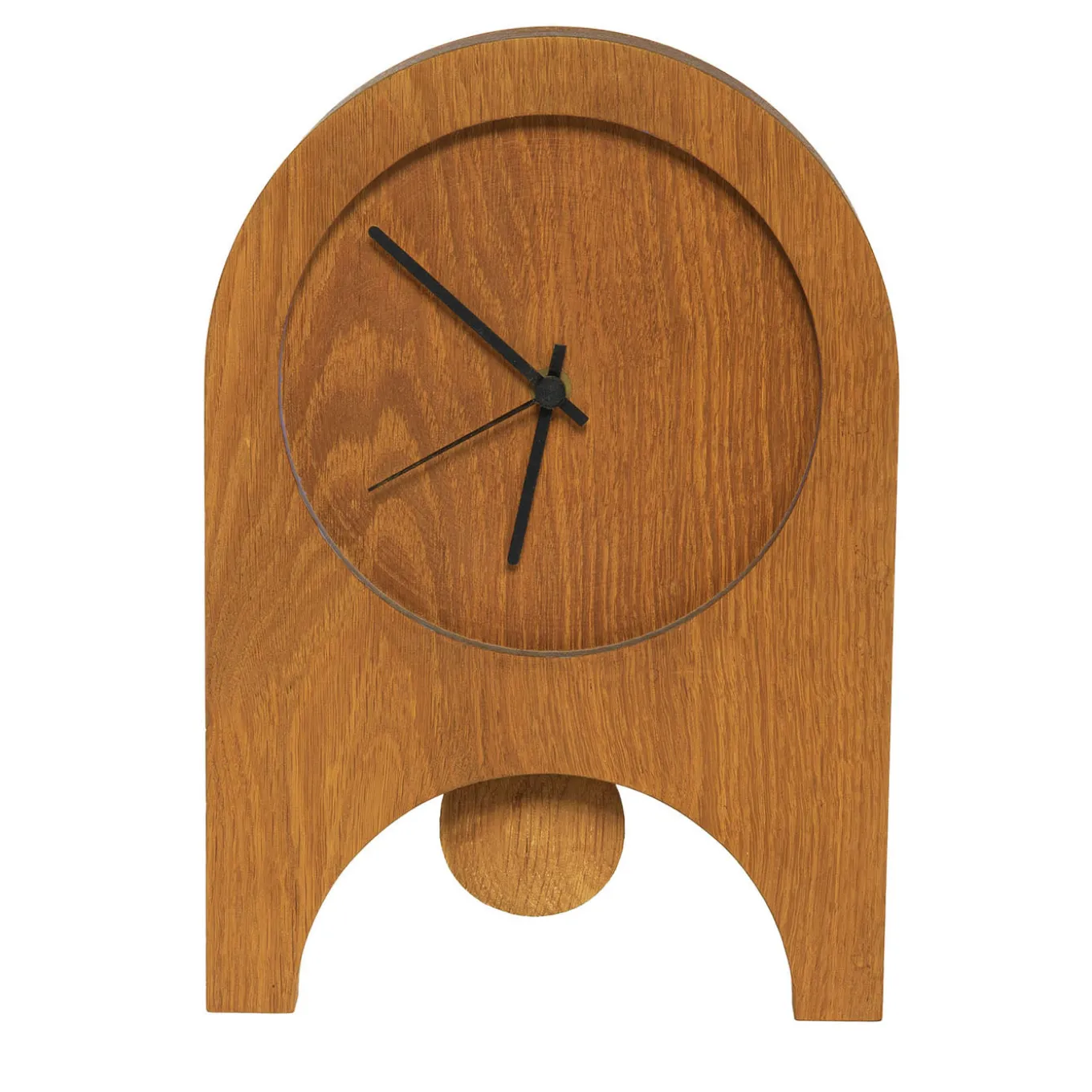 The Ophelia pendulum is a distinctive kitchen clock crafted in the shape of a face with a unique mouth indentation where the pendulum swings, adding movement and character to the design. This piece merges functionality with a playful, eclectic aesthetic, contributing to a practical and original kitchen environment. It is part of a collection of quirky kitchen-themed clocks, each offering unique features that combine sustainability with charm.