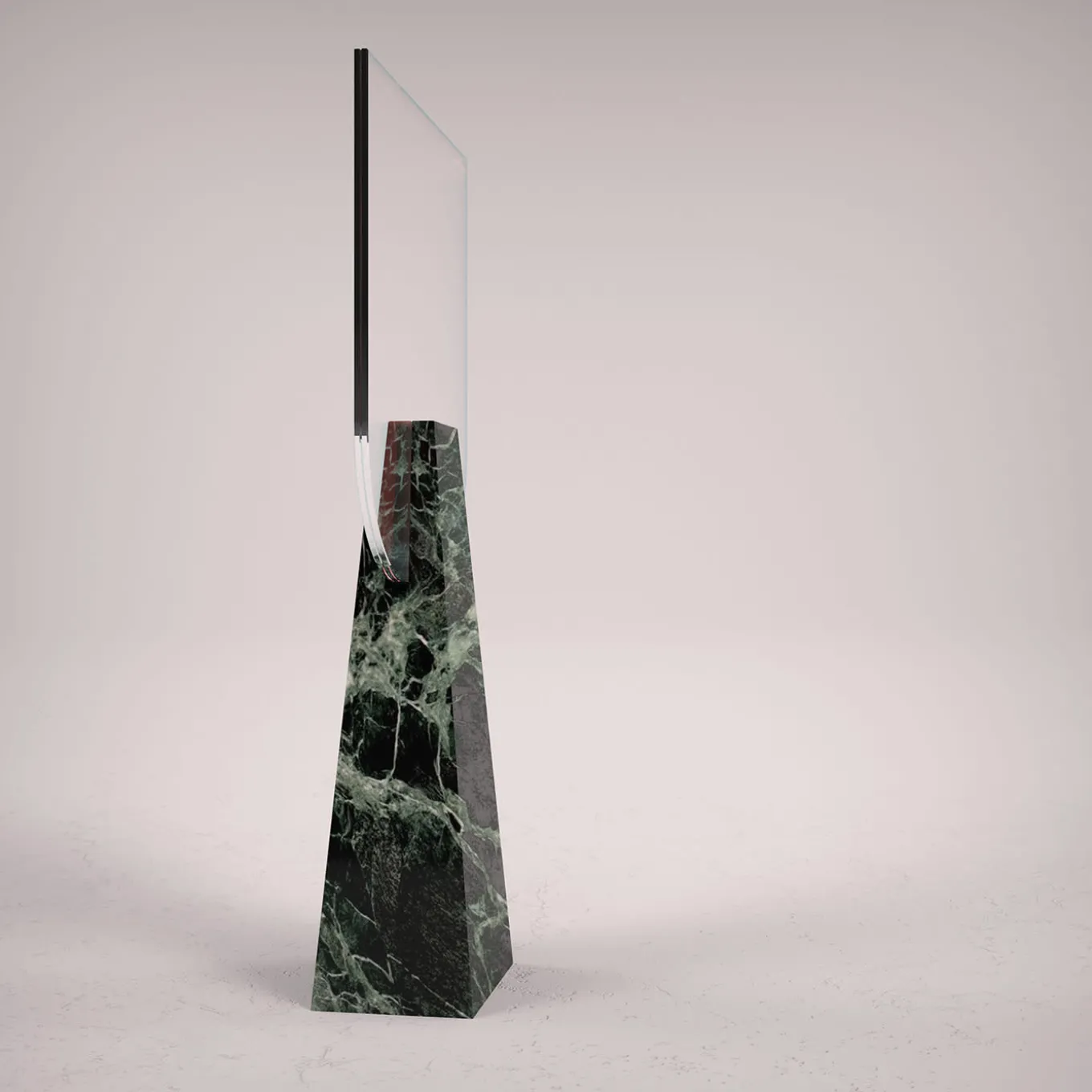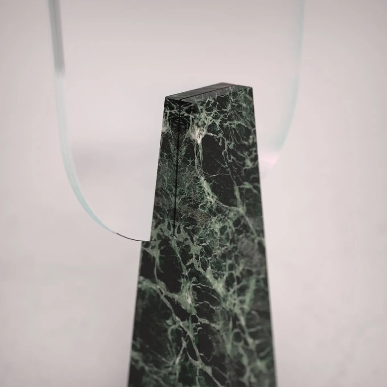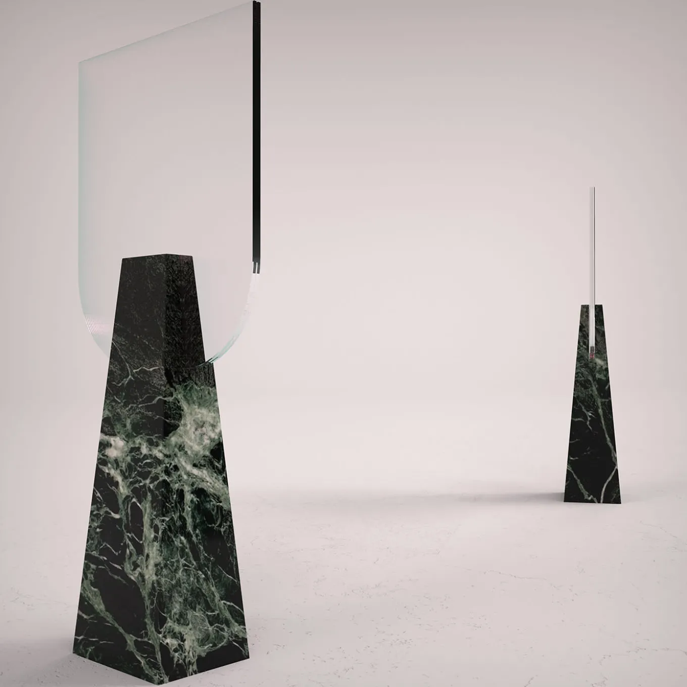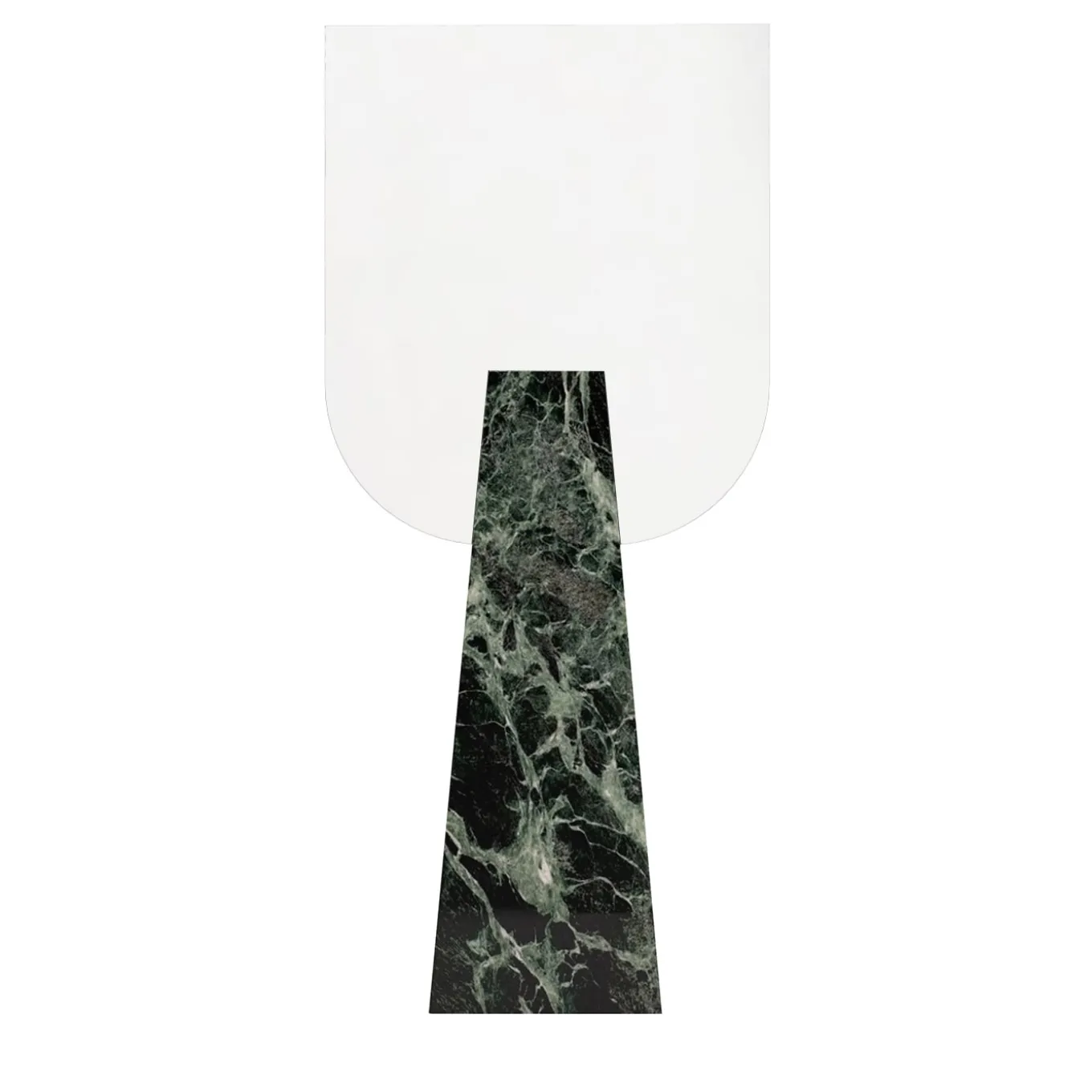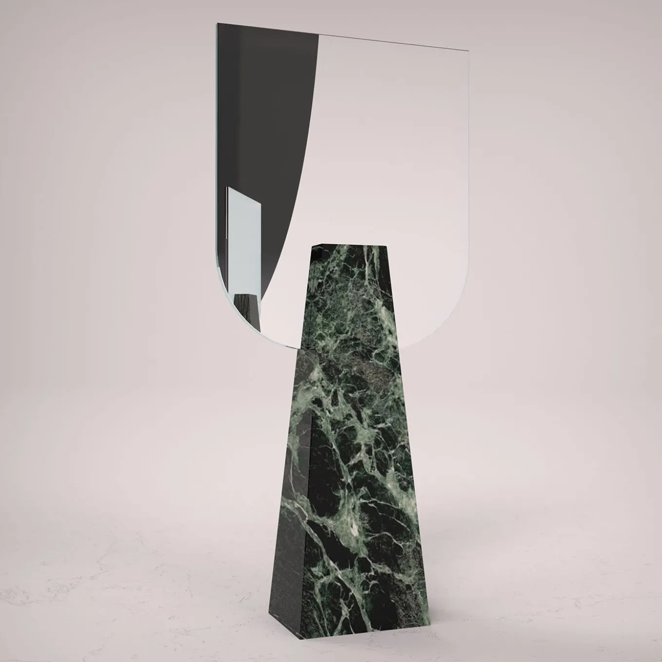 Neoclassic harmony and contemporary minimalism merge in this superb table mirror of striking opulence. The deftly hand-shaped double-sided mirror results are inserted and held in place by a rigorously sculpted monobloc body in fine Verde Alpi marble, its smooth texture contributing to stating its unrepeatable artisan nature. Each piece is numbered and made to order.