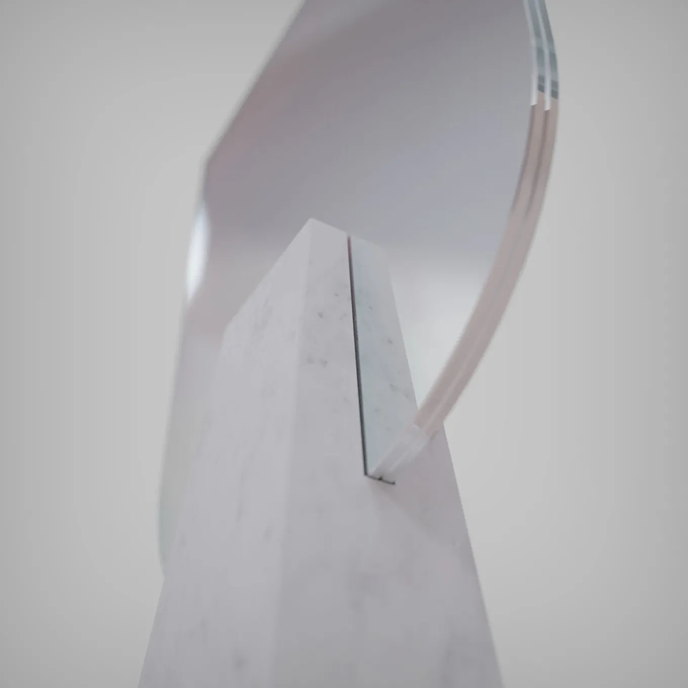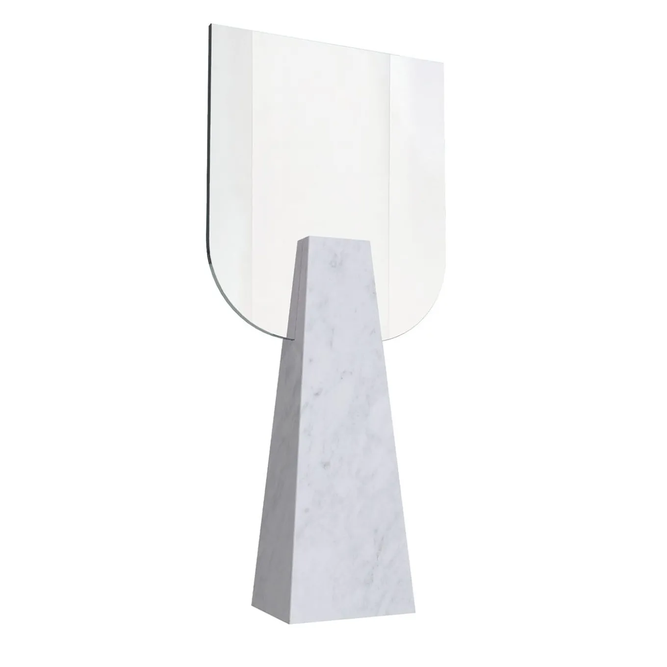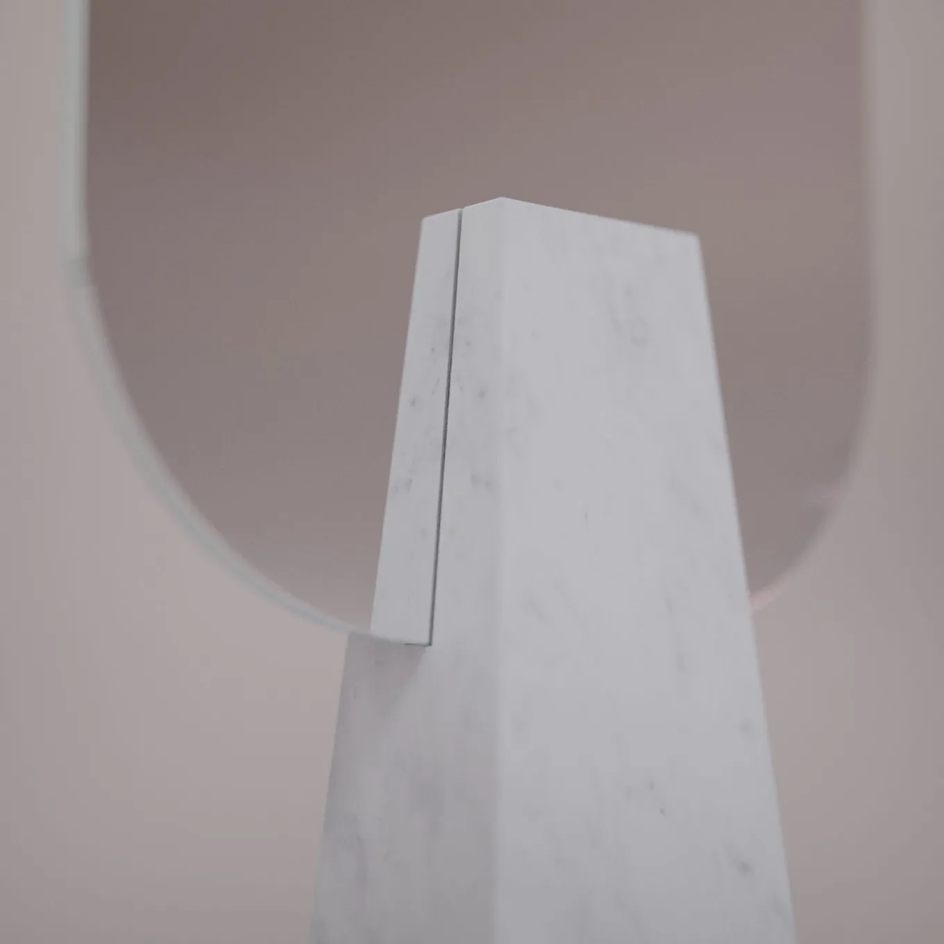A precious made-to-order piece, this table mirror is a pure celebration of contemporary style. Its distinguishing trait is the couple of shaped double-sided mirrors inserted in a rigorously sculpted white Carrara marble block, which never fails to enchant with the uniqueness of its traceries. Any slight difference from the pictured piece is to be expected and treasured as proof of its artisan quality.