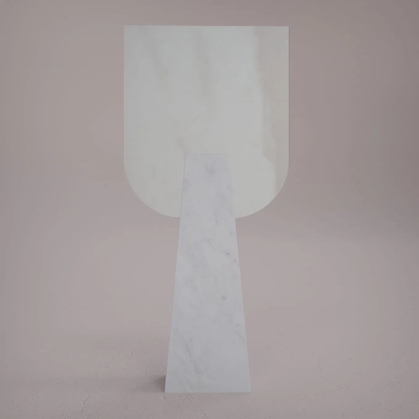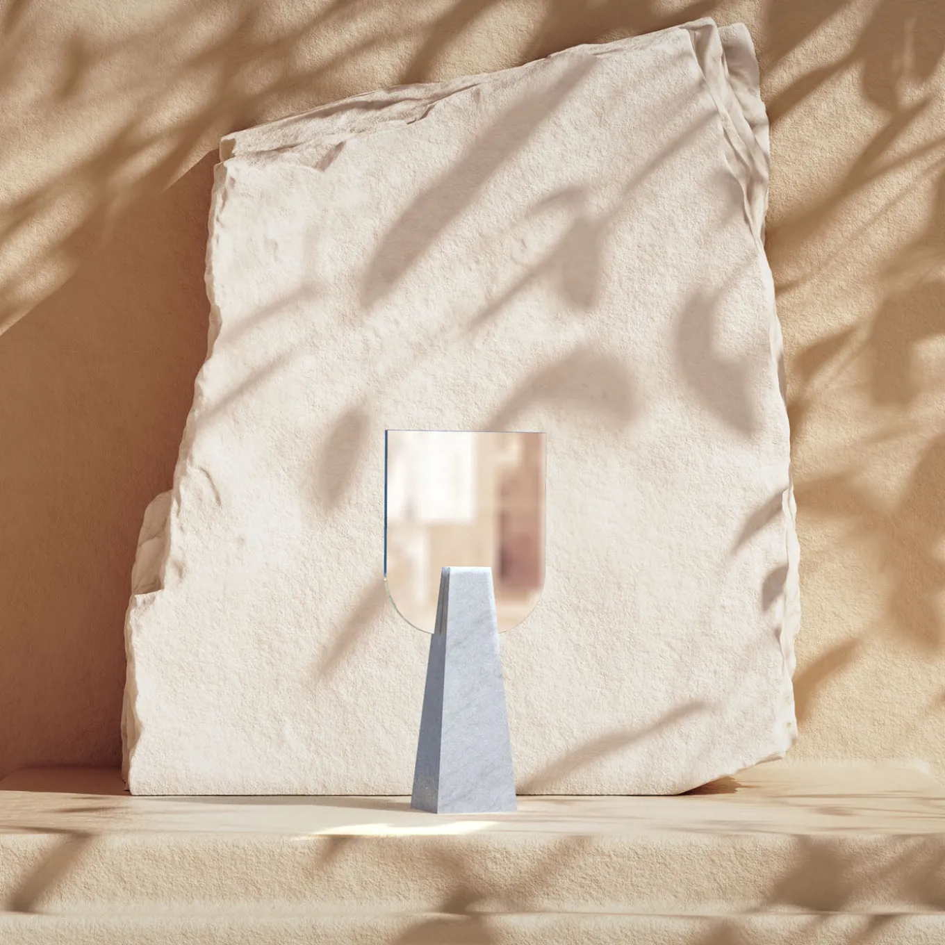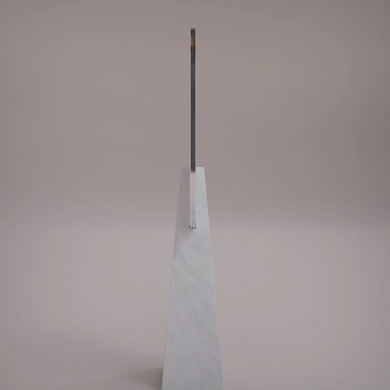 A precious made-to-order piece, this table mirror is a pure celebration of contemporary style. Its distinguishing trait is the couple of shaped double-sided mirrors inserted in a rigorously sculpted white Carrara marble block, which never fails to enchant with the uniqueness of its traceries. Any slight difference from the pictured piece is to be expected and treasured as proof of its artisan quality.