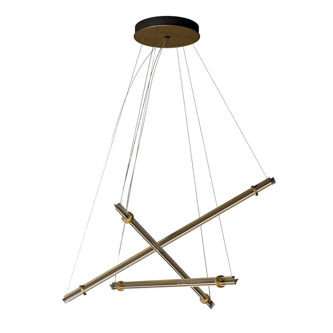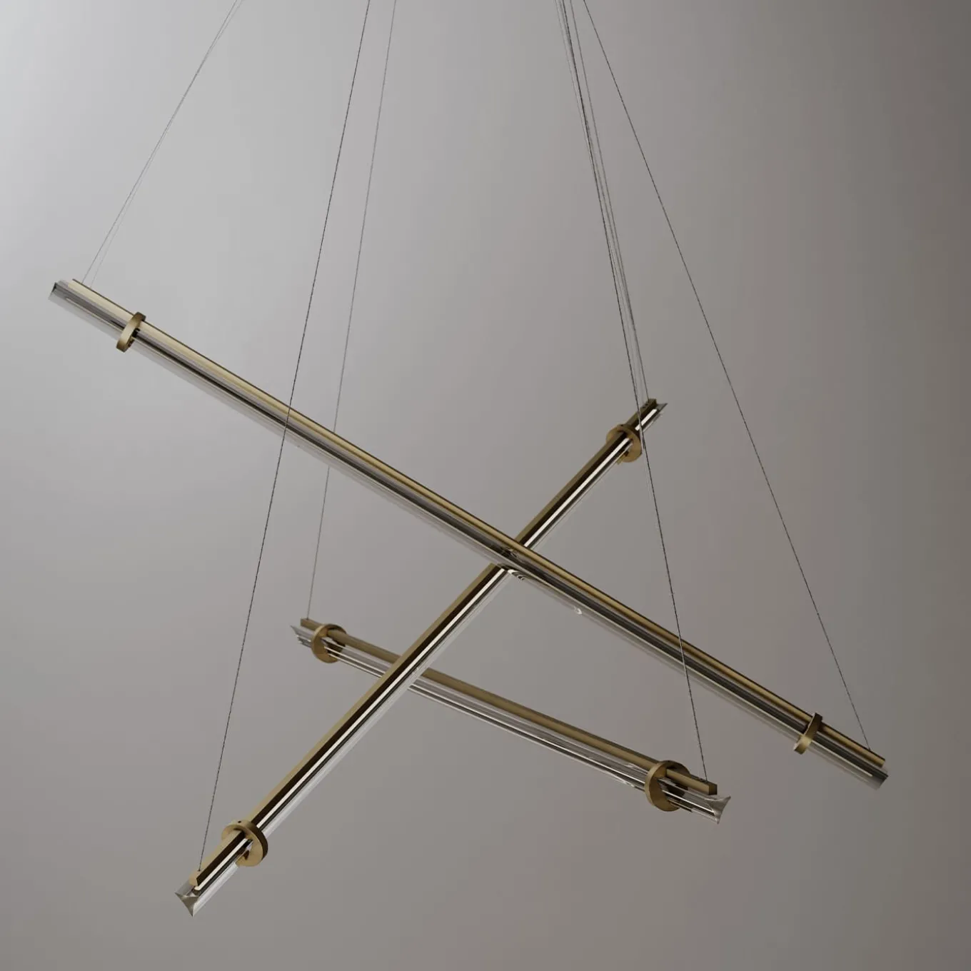 The Optical Chandelier features a burnished natural brass frame that supports three glass trihedrons in smoke grey. This arrangement creates a composition that gracefully floats in the surrounding space. The delicate blend of fundamental shapes and premium materials is accentuated by the light passing through the Murano glass diffusers, emitting a soft, linear glow.
