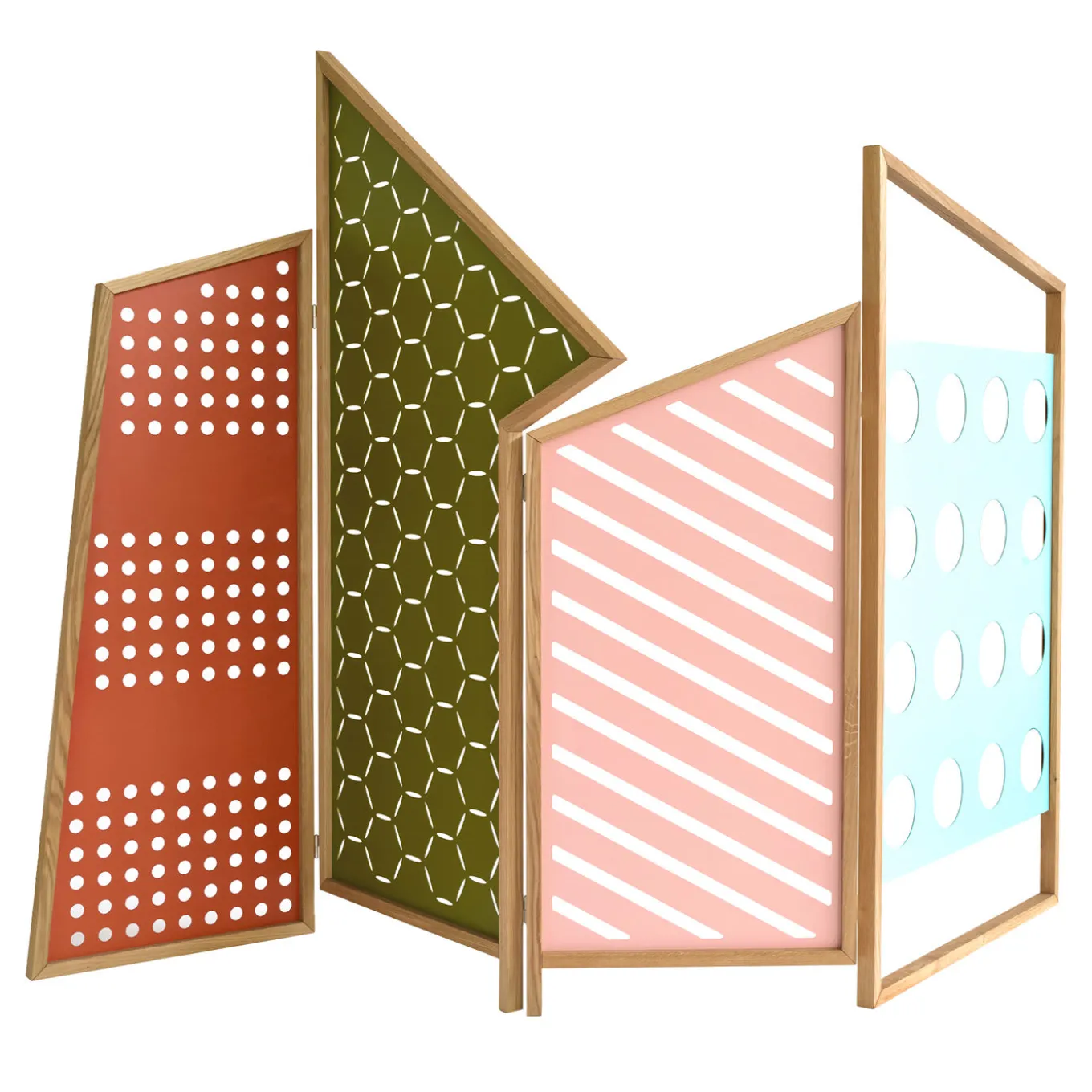 This elaborate folding screen is made up of four panels of irregular geometric shapes in iron, laser cut into brilliant patterns, and colored in splendid shades of blue, pink, green, orange, and black. Each panel is framed in solid oak with a gorgeous shiny oil finish.