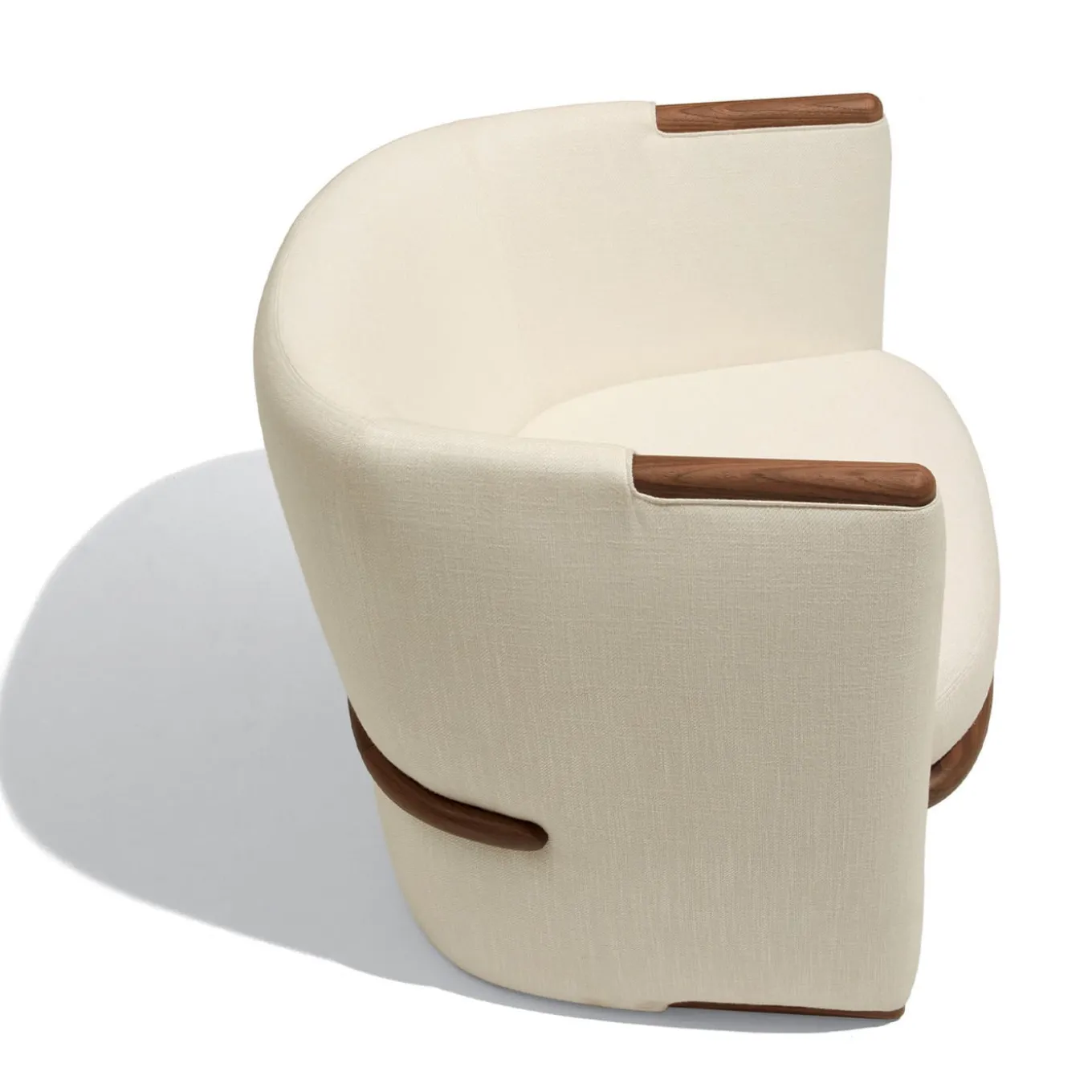 A clean and elegant design of timeless character, this armchair will imbue a contemporary interior setting with utmost sophistication. Made of steel drowned in fiber-covered cold-foamed polyurethane, the structure is enriched with Canaletto walnut inserts, available in a natural finish, in gray, or in a dark shade. The white fabric upholstery is not removable and is available in leather upon choice.