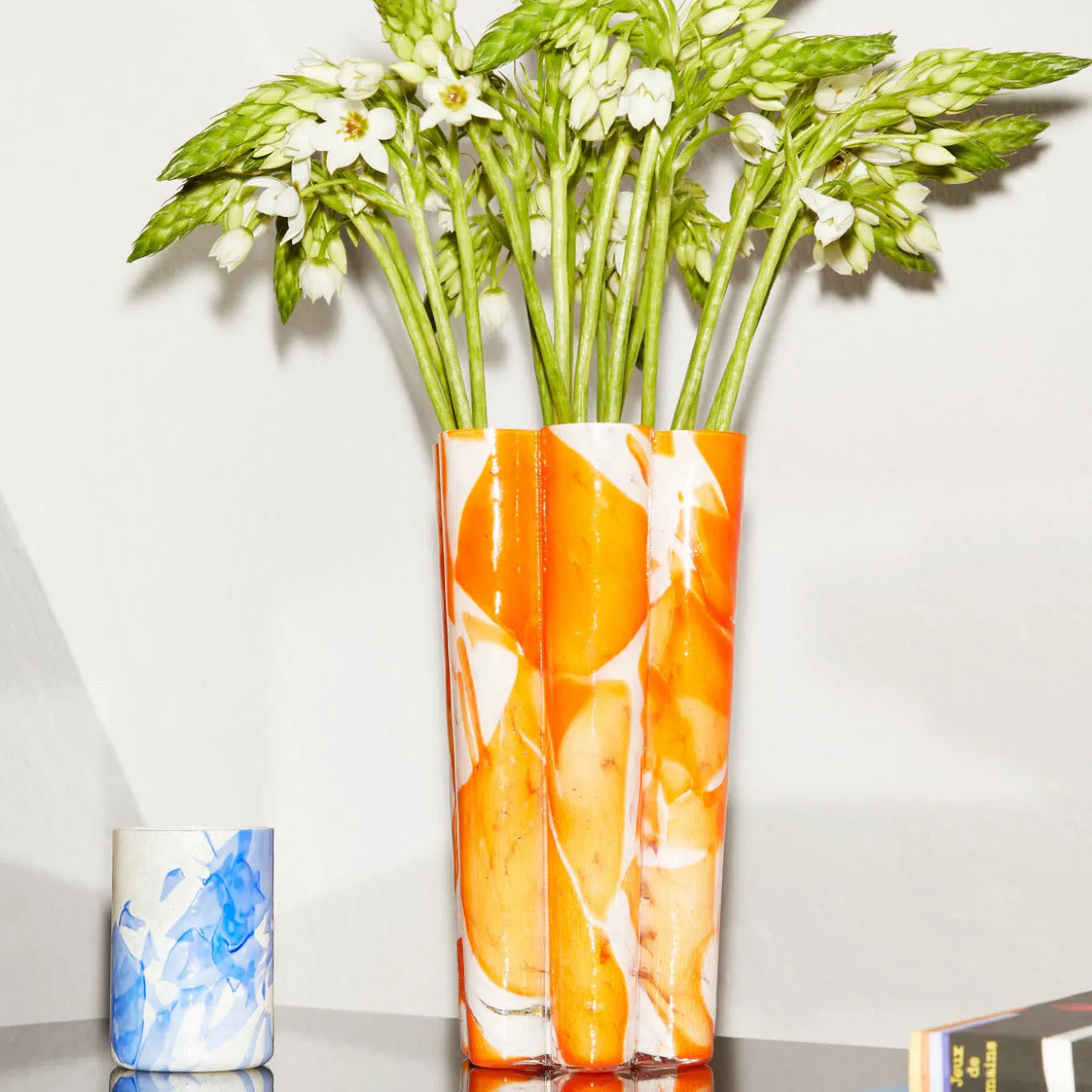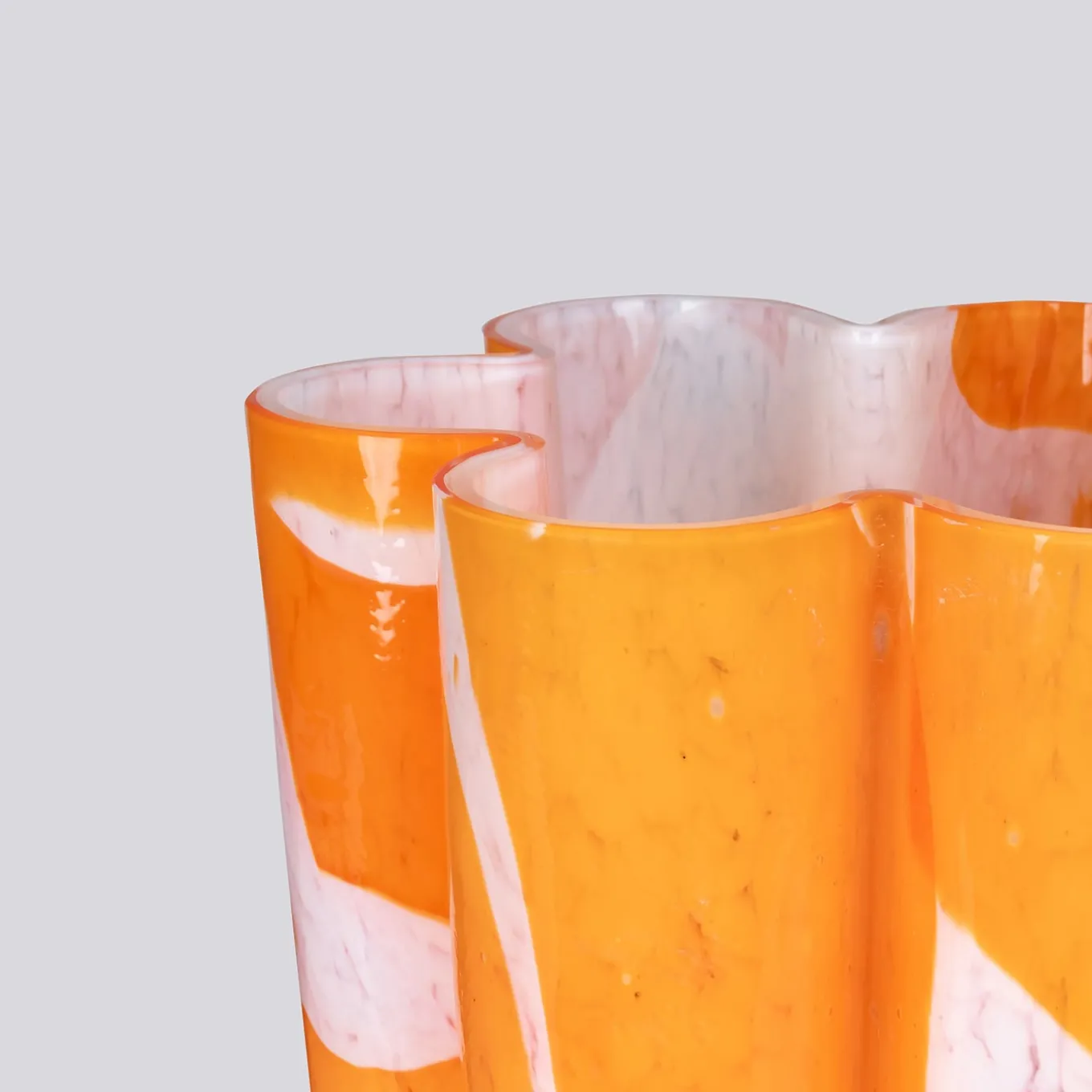 This vase features a unique blooming flower shape with vibrant orange shards fused onto an ivory base, creating a striking visual effect. The piece showcases expert glassblowing techniques that highlight the delicate interplay of color and form. Designed to serve as a distinctive centerpiece, it adds sophistication and artistic flair to any living space or office setting. This decorative vase embodies refined craftsmanship and a rich tradition of artistic expression. Every piece is unique, due to handcrafting slight changes may occur.