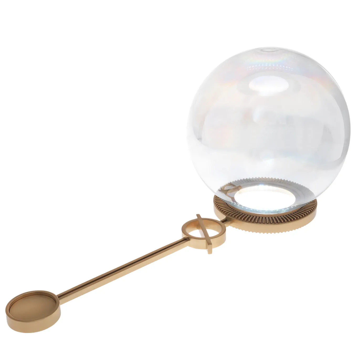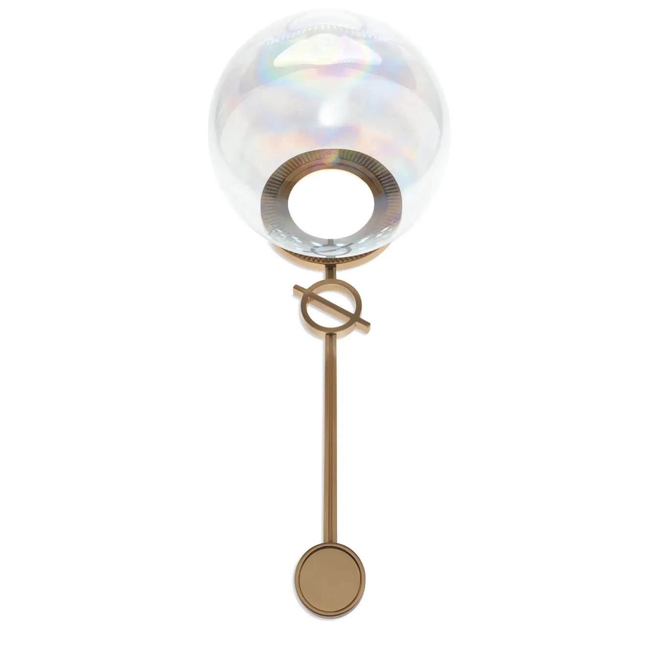“A soap bubble climbing upward to the borders of the unseen world. Orgone ambient lamp, with borosilicate glass and internal led light, is an iconic piece that fascinates adults and children.” Table lamp with brass structure in matt gold finishing. Lighting system with warm white strip LED inside the larger brass ring. Iridescent borosilicate glass sphere as shade. No variations available.