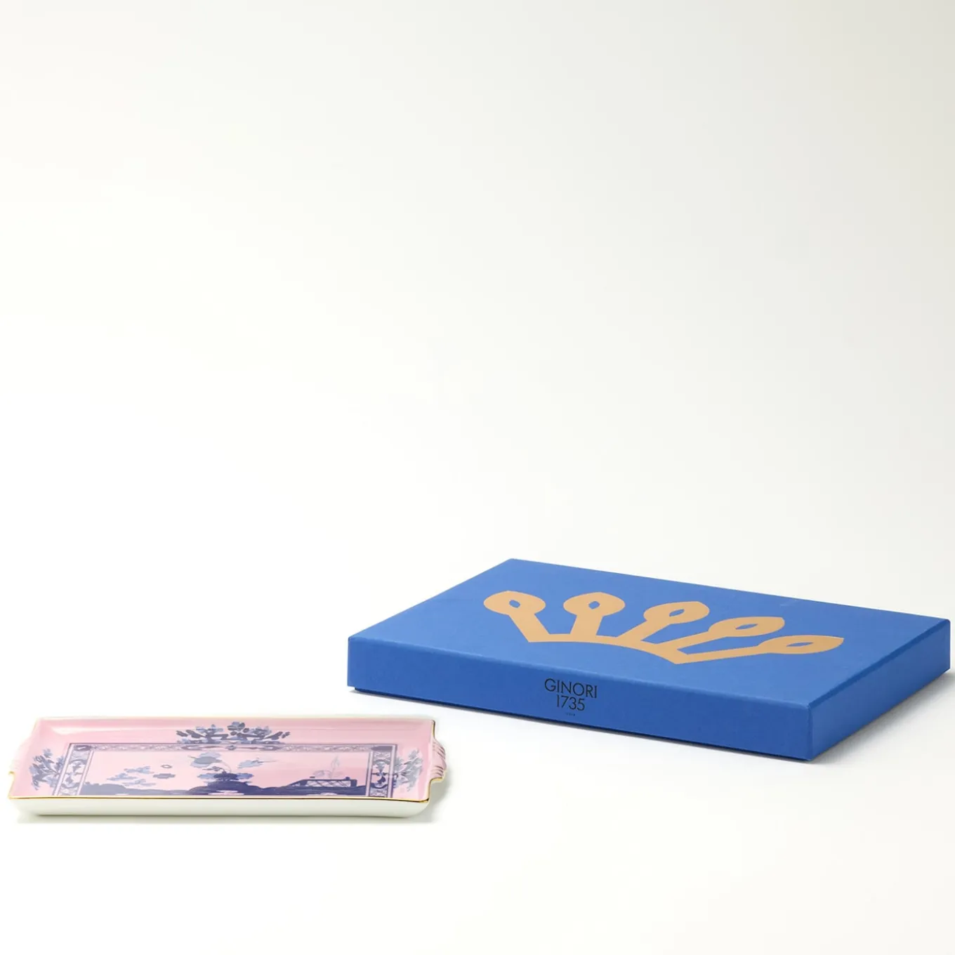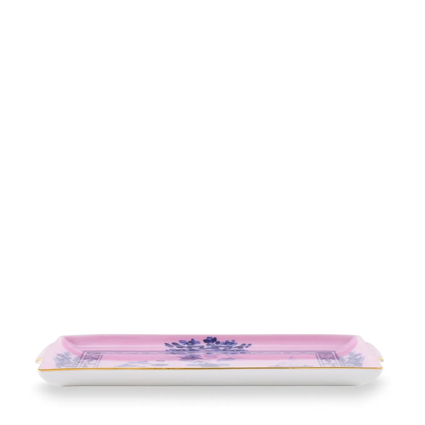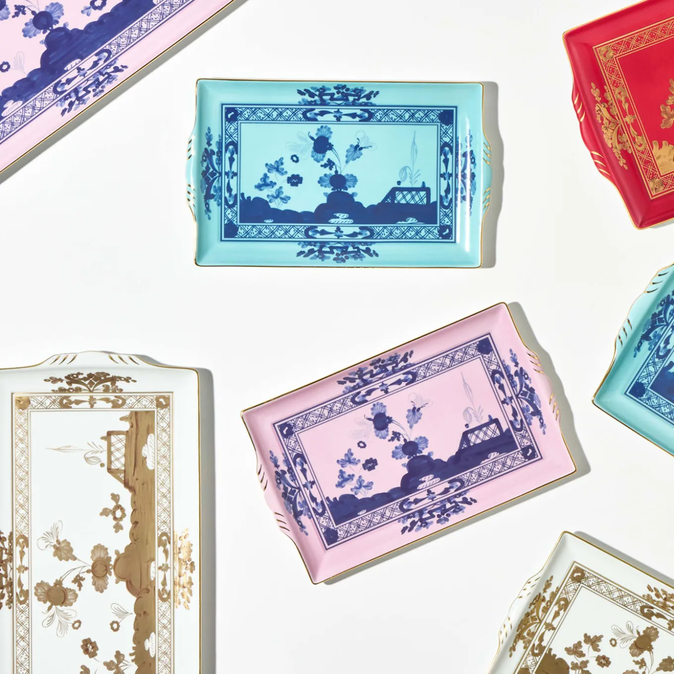 The small Rectangular Platter with Handles in the Azalea pattern from the Oriente Italiano Collection is a stunning addition to any table setting. Featuring finely detailed floral patterns and gold trim, this pink porcelain tray with elegant handles embodies sophistication and versatility. Ideal for serving hors d’oeuvres, desserts, fruit, or cheeses, it also serves as a base for table décor such as candles, fresh flowers, or objets d’art, creating a refined ambiance.