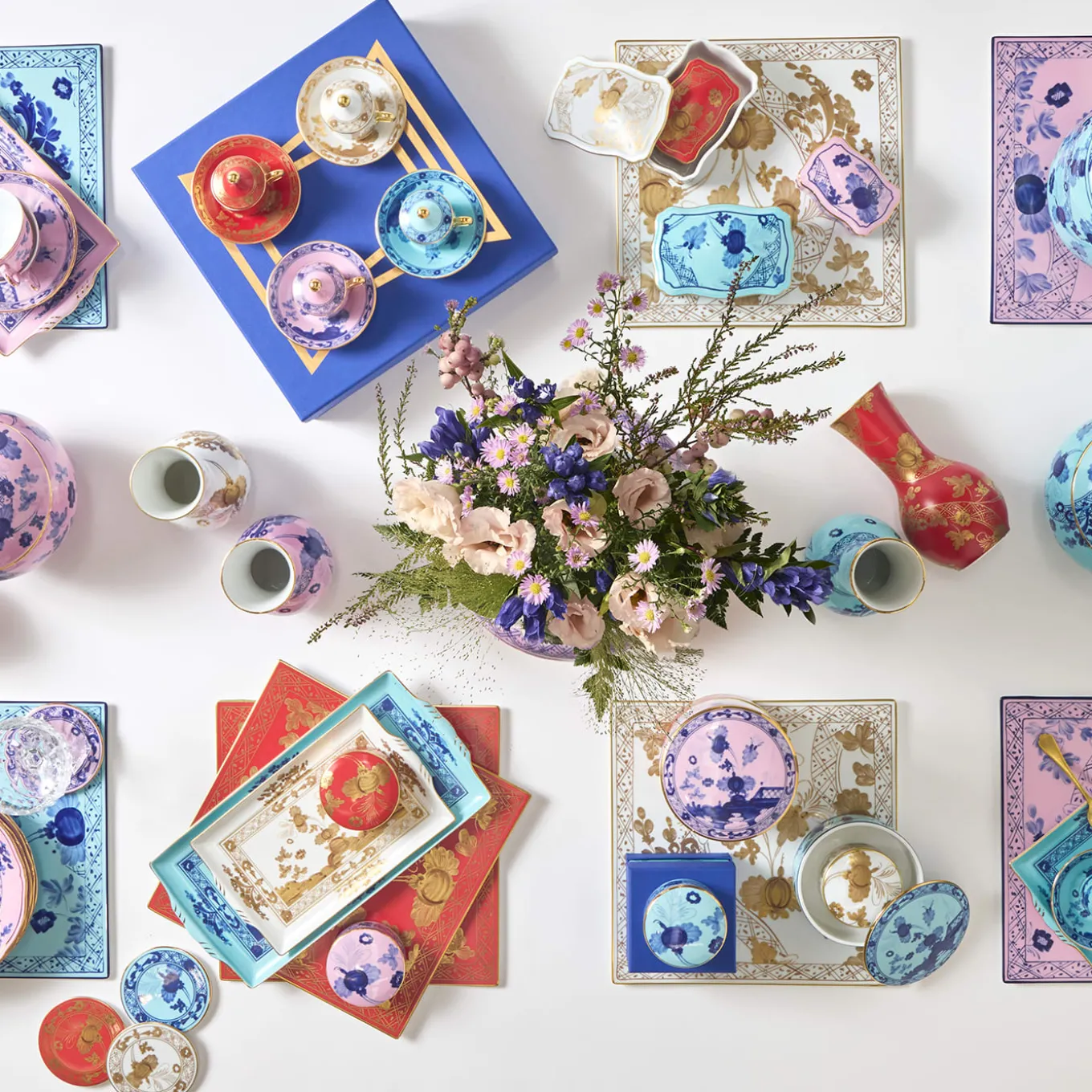 The large Porcelain Trinket Box in the Iris pattern with gold trim from the Oriente Italiano Collection features a striking blue floral motif against an iris blue background, accented by gold trim—a hallmark of Ginori 1735’s craftsmanship. In this collection, the iconic Garofano (Carnation) flower turns porcelain into refined art. Complete your décor with coordinating tableware, tea and coffee sets, and room diffusers.