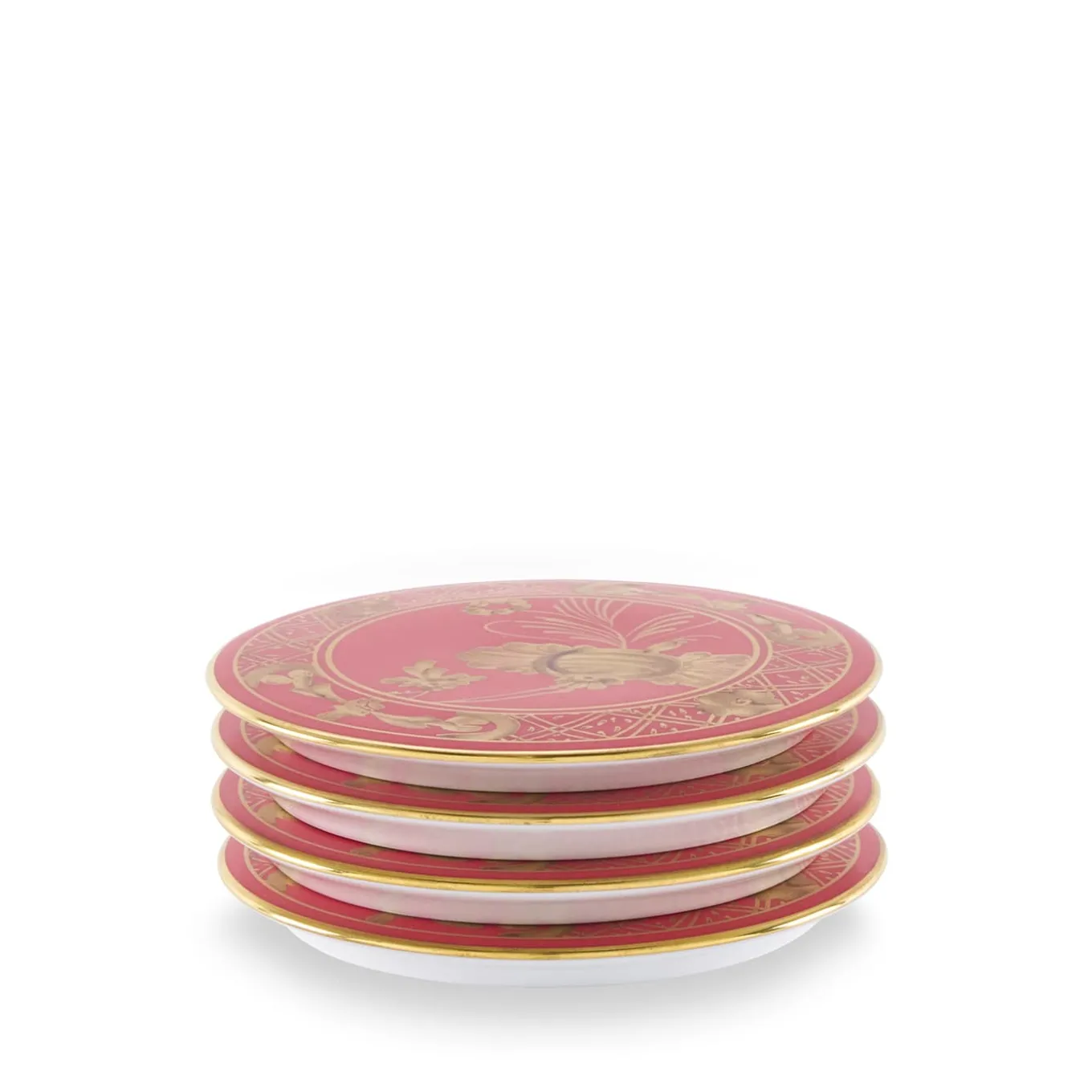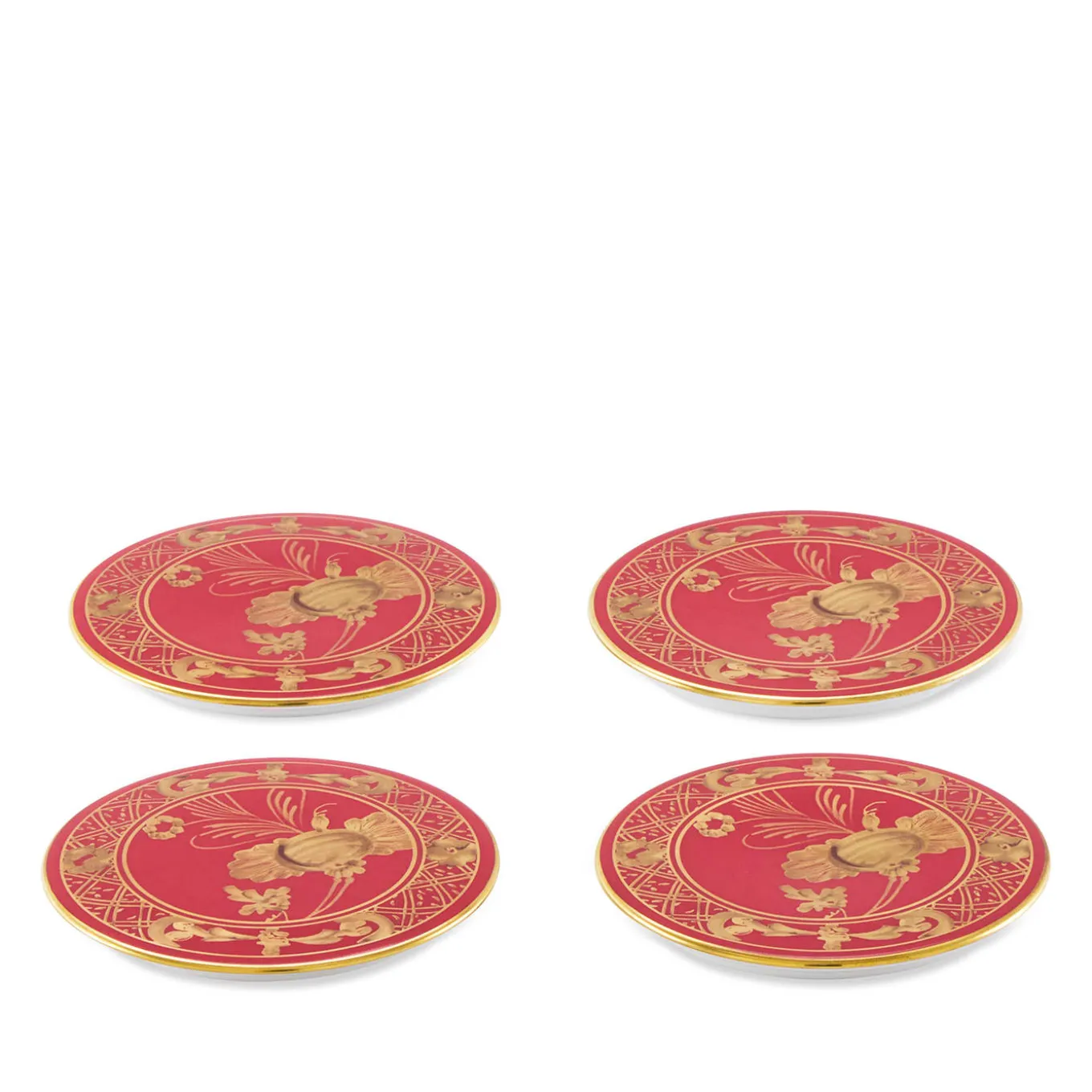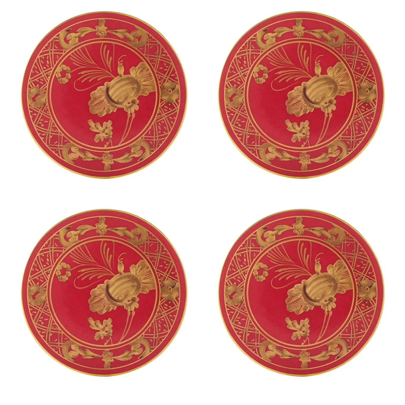 Set of 4 Rubrum Decorative Coasters from the Oriente Italiano Collection. These four red porcelain coasters, featuring intricate floral patterns. The gold trim enhances the beauty of the Rubrum pattern, infusing any space with vitality and cheerfulness. Perfect for outdoor cocktail parties or intimate dinners, this set adds a sophisticated touch to any occasion. With its oriental-inspired colors and craftsmanship, each piece in the Oriente Italiano collection is a true work of art.