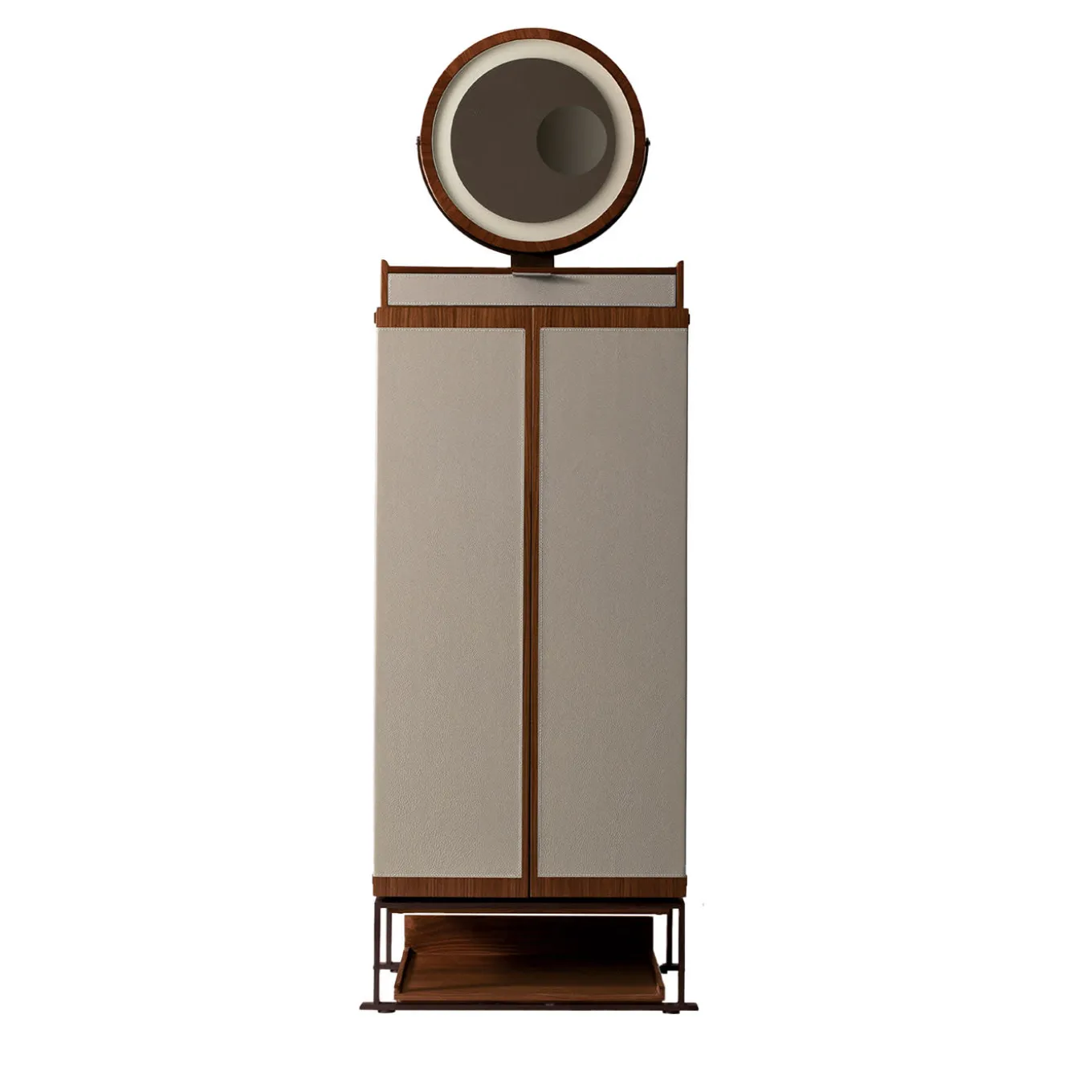 This exceptional cabinet is handcrafted of first-rate materials rendered in refined and exclusive shapes. Made of Canaletto walnut enriched with leather inserts, it features a series of drawers of three different dimensions, covered with two doors. The piece is completed with a round adjustable mirror, and bronze-lacquered metal details. Please inquire with the Concierge for further information.