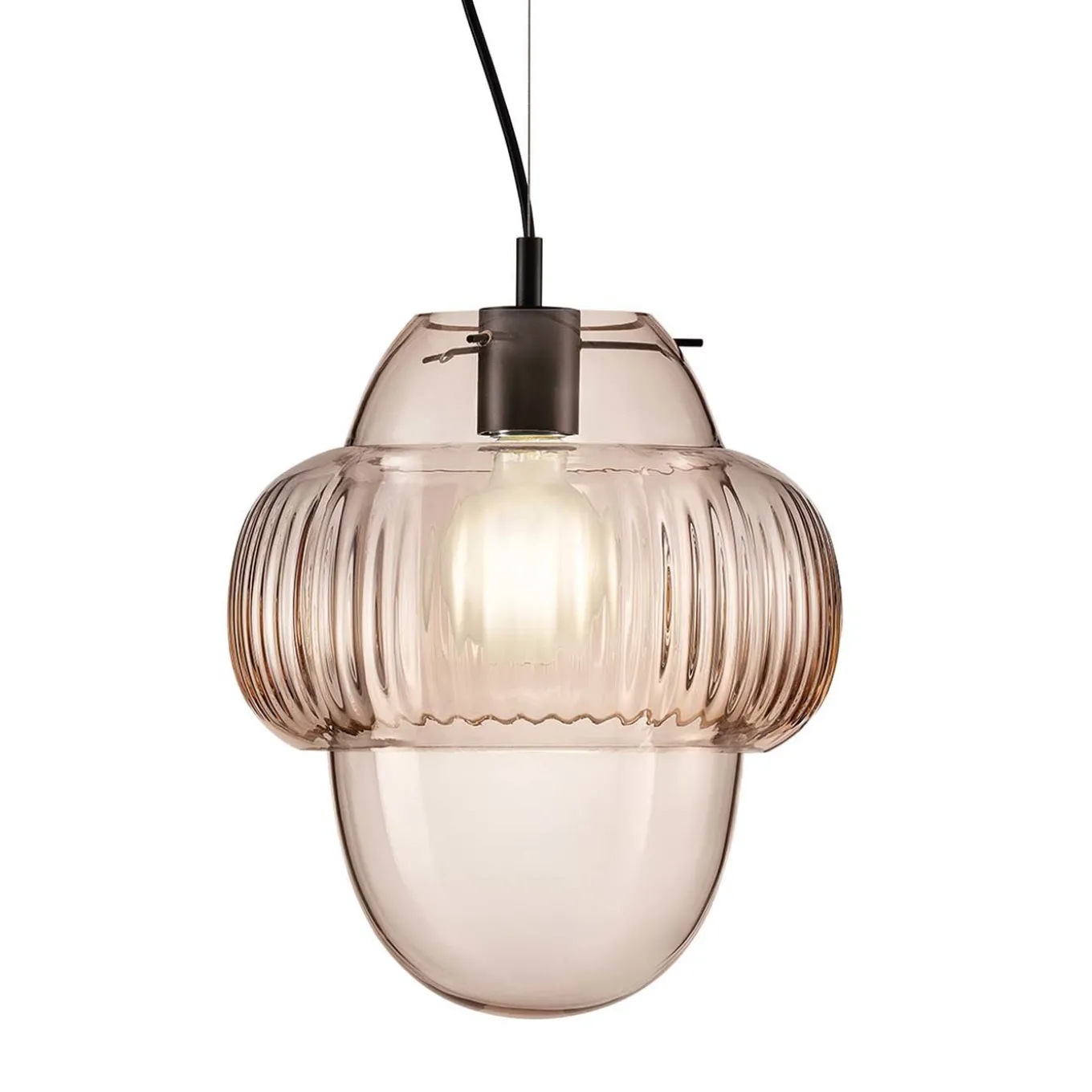 Handcrafted by Venetian artisans, the Oround pink glass pendant is created with a mold to ensure perfect form. A perfect oval, the pendant shade features an extra ring around the bulb holder to refract and soften the illumination. Also available in amber and smoky glass.