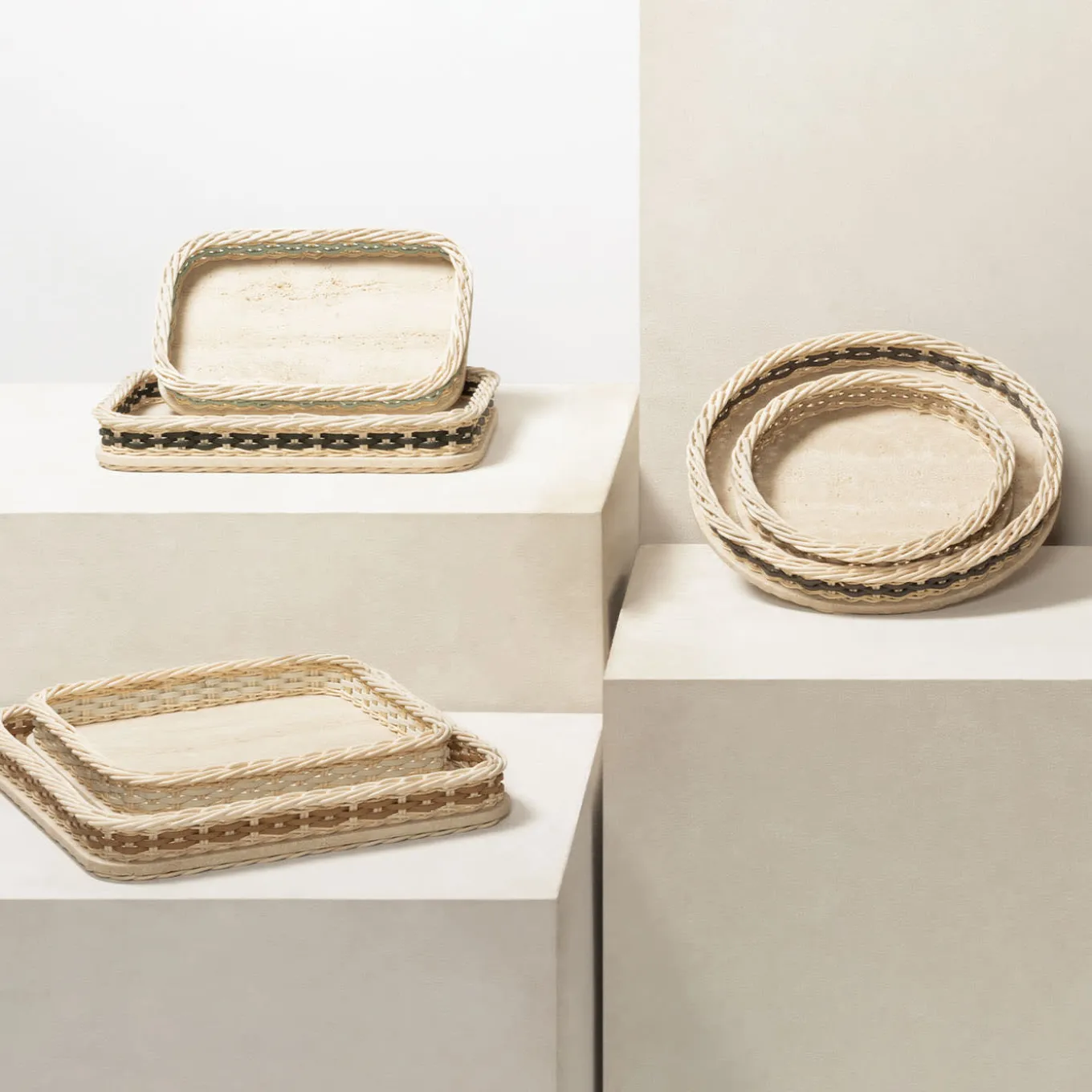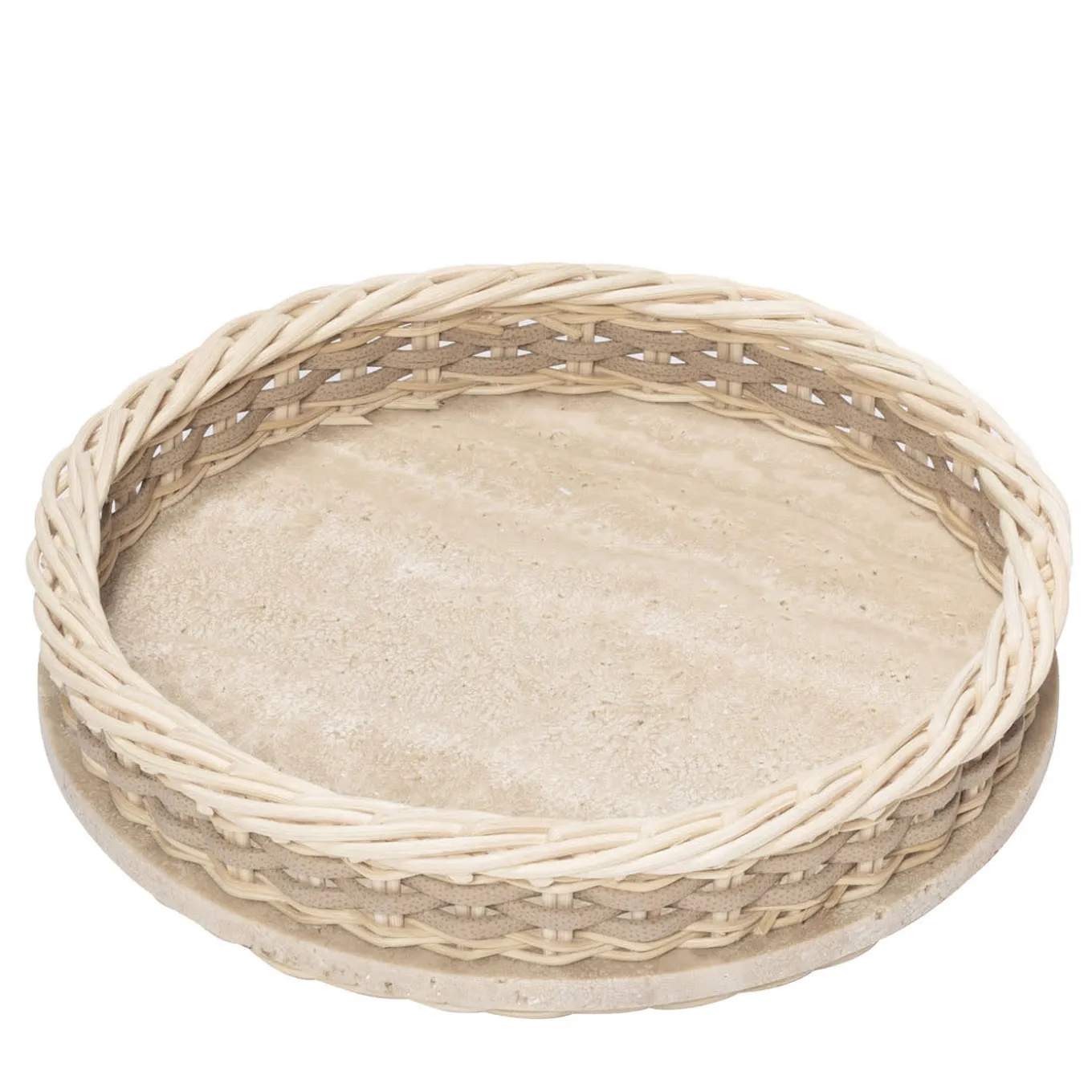Travertine structure featuring a woven leather and rattan frame. Only available with natural rattan and travertine combined with golf or nappa leather.