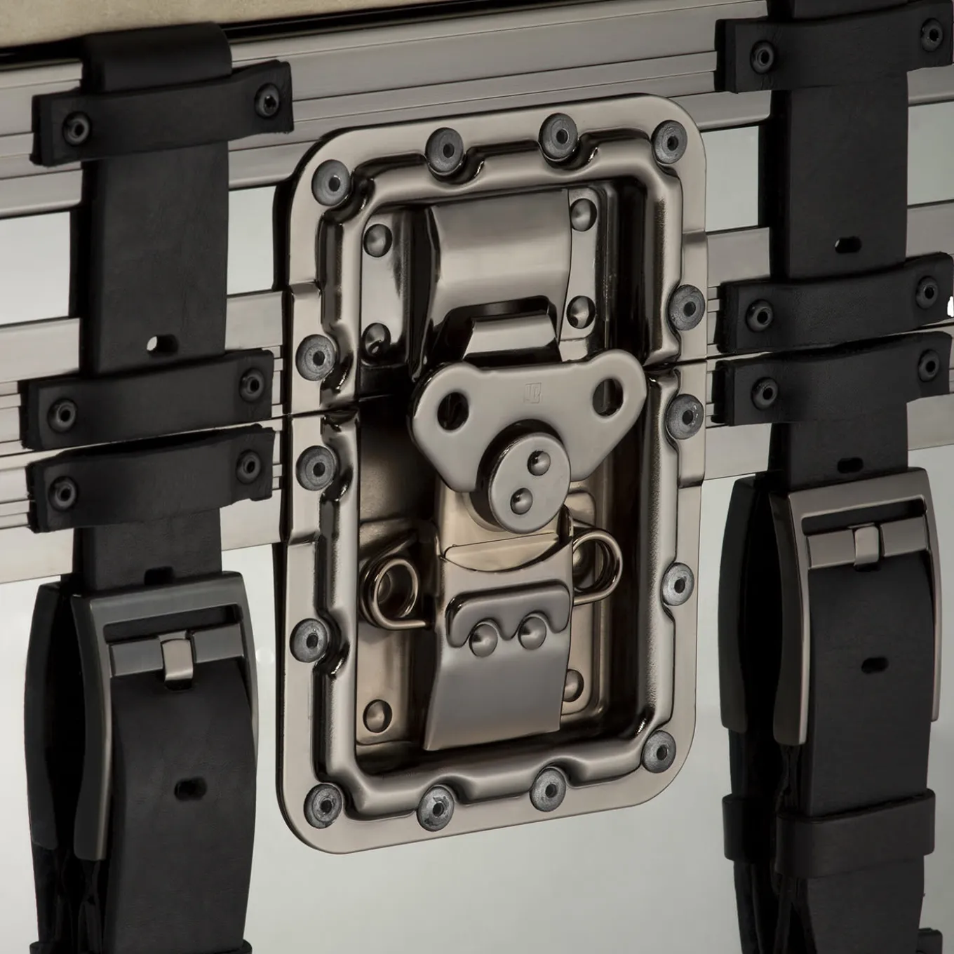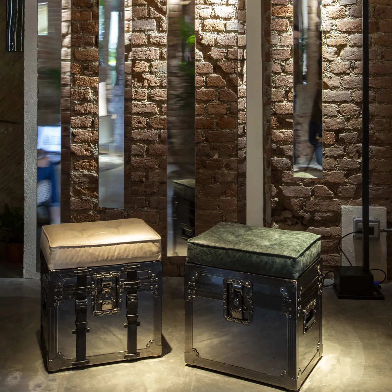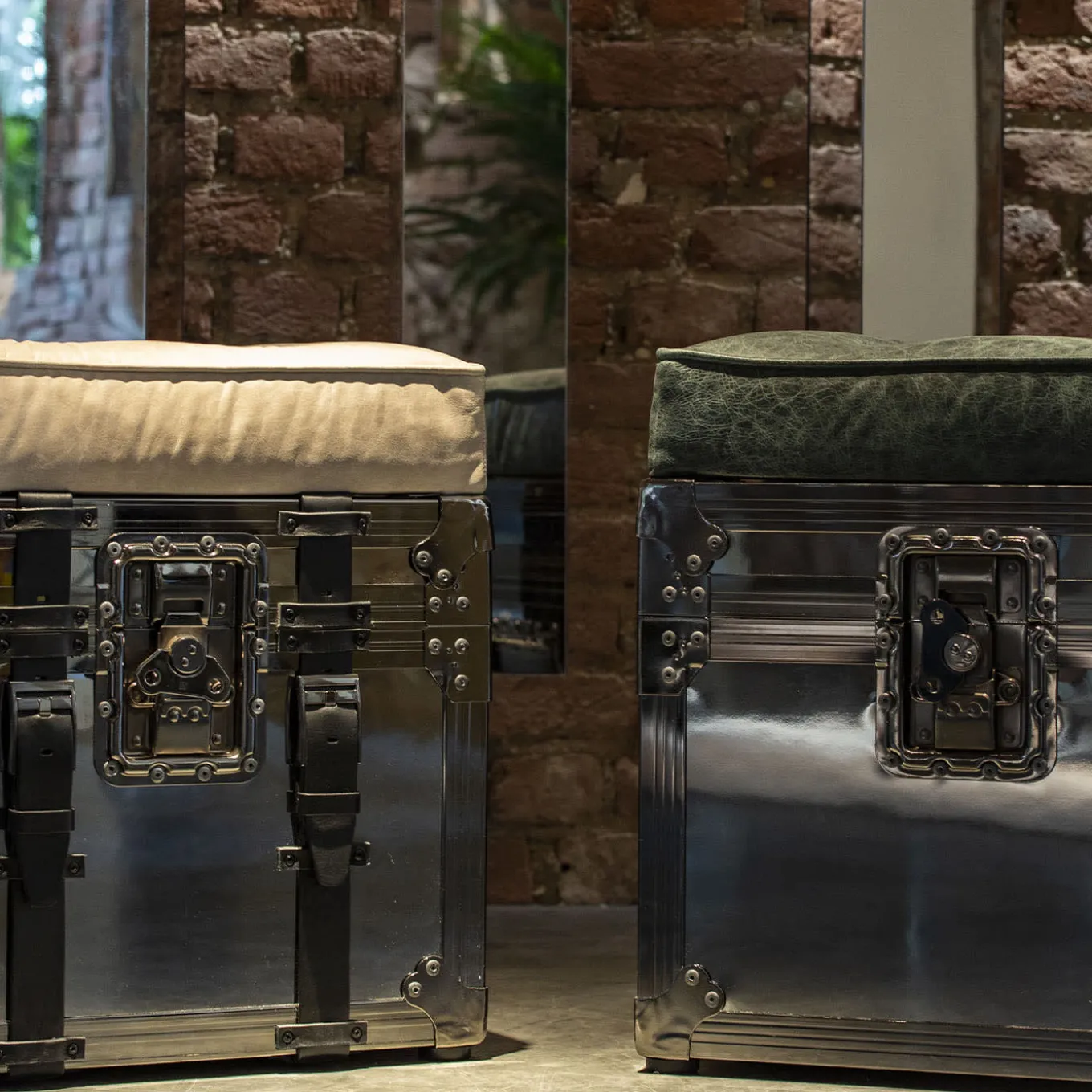 Pouf trunk with 90° opening for storage. External finishing with mirrors and chrome plating of the steel profiles, the seat upholstered with leather including the bottoms, details such as belts in leather. The internal part is upholstered in capitonné leather.