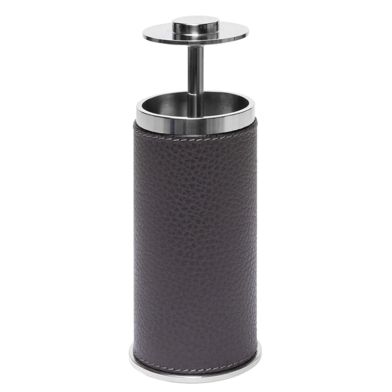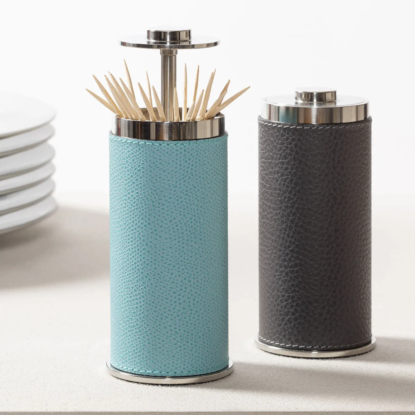 The Otello Toothpick is a partially leather-covered stainless steel structure. Its discreet design features a push-button top to allow easy access to the dispenser.
