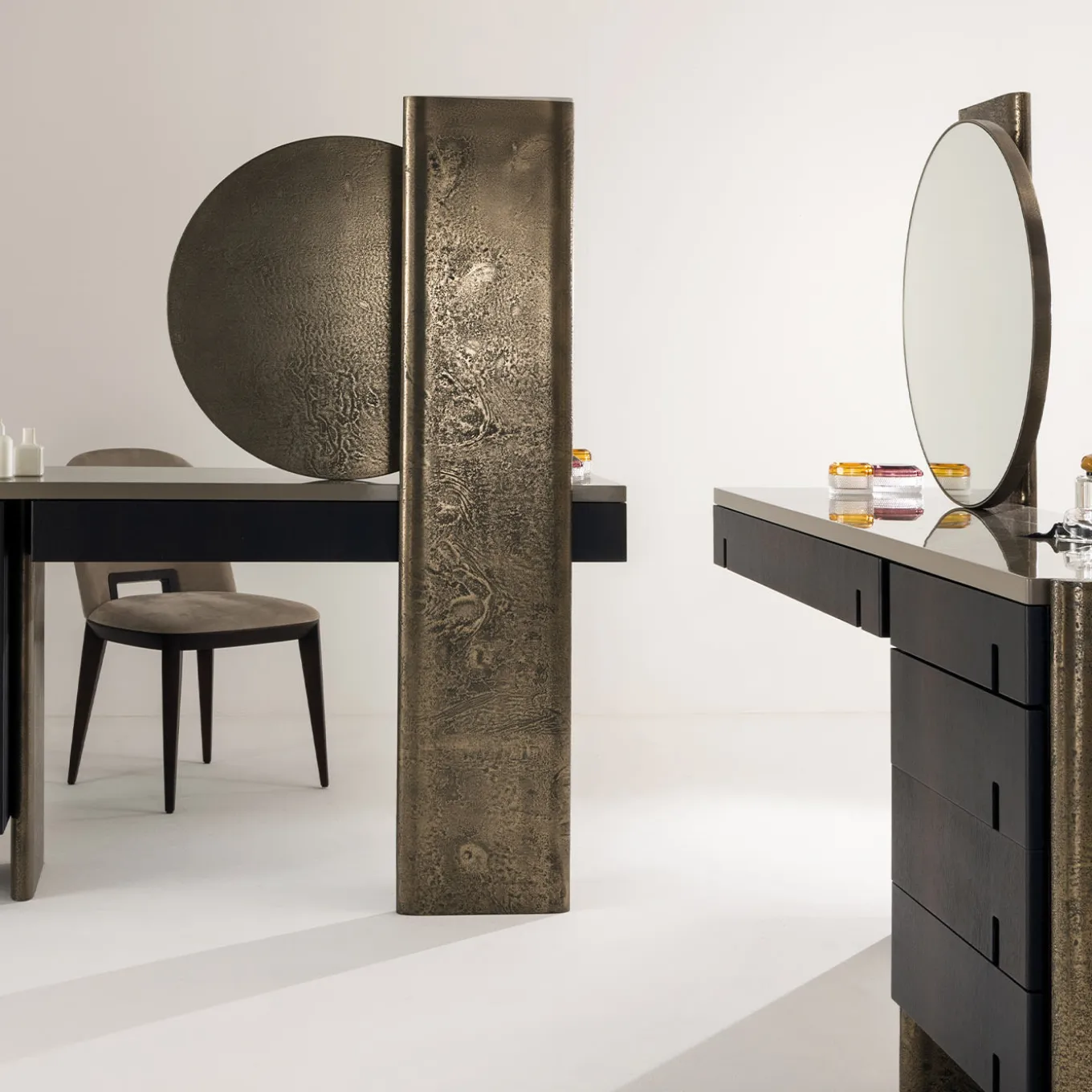 Brimming with modern appeal, this vanity desk combines a dynamic asymmetrical design with exclusive materials and textures. The main drawer and frame – with round mirror and 4-drawer unit – are in Termocotto oak, the top is in glossy lacquered wood, while the side panels, back panel, and handles showcases the textured “Raptor” bronze finish. Please explore the variety of available customization options with the Concierge. Multi-purpose drawer holders and partitions are not included.